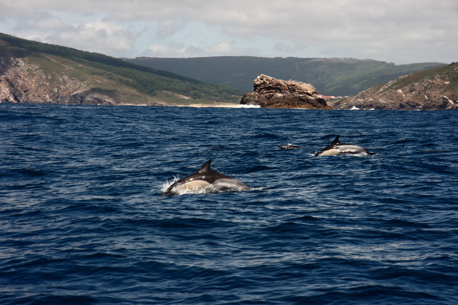 Delphine begleiten uns wieder. Ganz vorsichtig, denn es gibt unheimlich viele Untiefen hier (die Bezeichnung Todesküste ist schon treffend). Als wir in Muros ankamen, hat dort am Hafen ein Bagger die Straße aufgebohrt, sodass wir wegen des Lärms uns entschlossen hatten, das Großsegel wieder hochzuziehen und über die Bucht nach Portosin zu segeln. Dort war der Hafen voll, bzw. alle Plätze reserviert, da eine Flotille mit 30 Booten sich angemeldet hatte. Da möchte man ja sowieso nicht dabei sein. Wir haben kurzentschlossen vor dem Hafen geankert, sind mit dem Schlauchboot einkaufen gefahren und sind dann zum Restaurant am Strand übergesetzt, was wesentlich schöner war, als im Hafen zu liegen. Am Morgen sind wir dann wieder mit dem Beiboot in die Marina motort, um dort zu duschen. Naja, die wollten uns nicht aufnehmen, da dürfen sie uns schon eine Dusche spendieren.