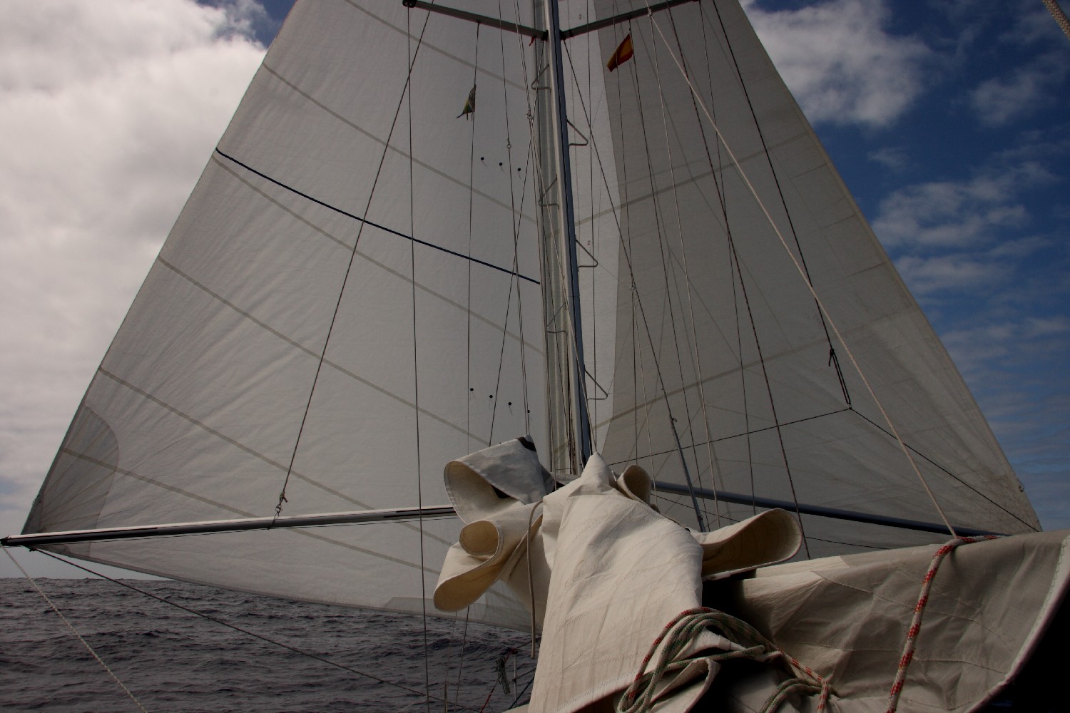 Als der Wind achterlicher wird, probieren wir die Passatsegel aus, denn die alte Genua hatte ich beim Segelmacher in Cadiz reparieren lassen.