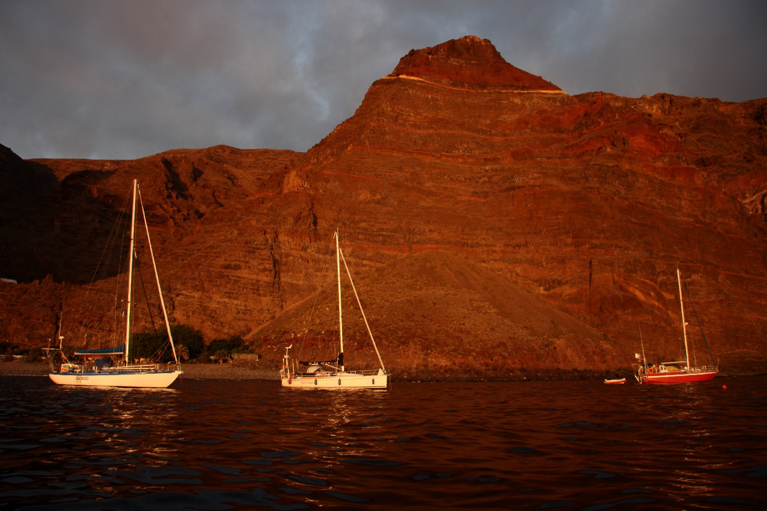 Wir wollten eigentlich Hierro ansteuern, da der Wind aber schwach war, steuern wir die Bahia de Argayal auf der Westseite Gomeras an. Von dort unternehmen wir eine Wanderung ins Valle Gran Rey. Natürlich machen wir das wie es nur Deutsche machen. Kein Einheimischer würde freiwillig in die Berge gehen, noch dazu in der Mittagshitze. Aber die Ausblicke entschädigen für das Rösten. Abends kühlen wir uns in unserer Bucht wieder ab und genießen das Farbenspiel in den Bergen.