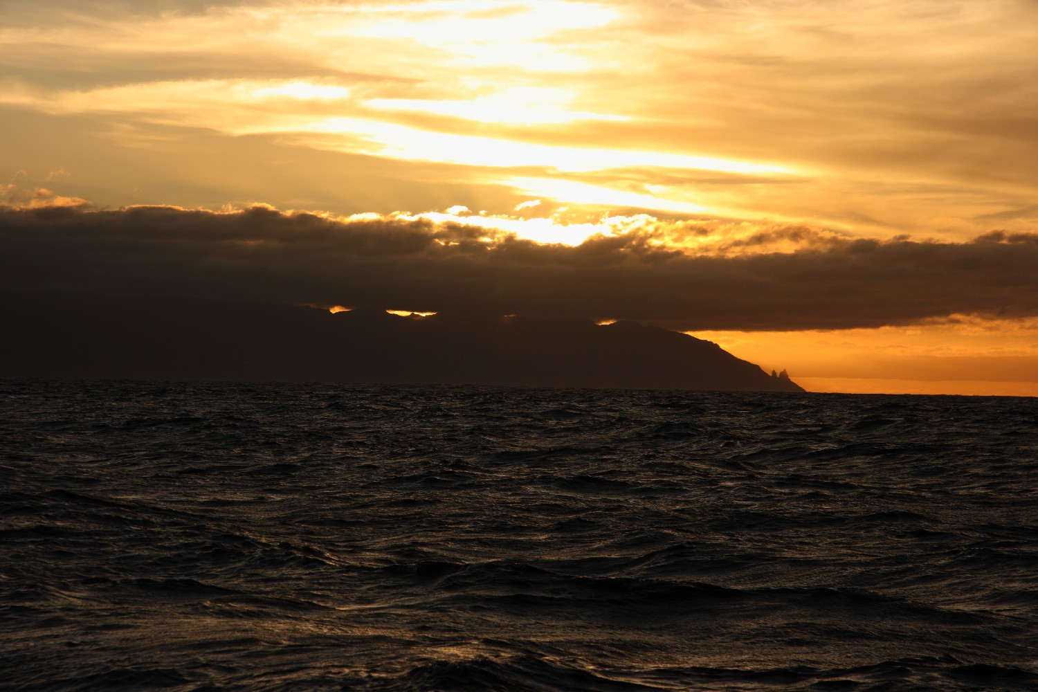 Tja und schon wieder ist eine Woche zu Ende. Wir segeln an den Felswänden von Los Gigantes vorbei und bestaunen den Teide, der sich mit einer Schirmnütze aus Wolken zeigt. Zurückblickend sehen wir Gomera.