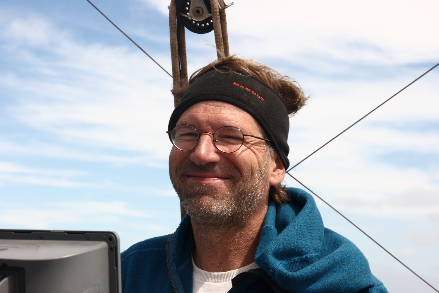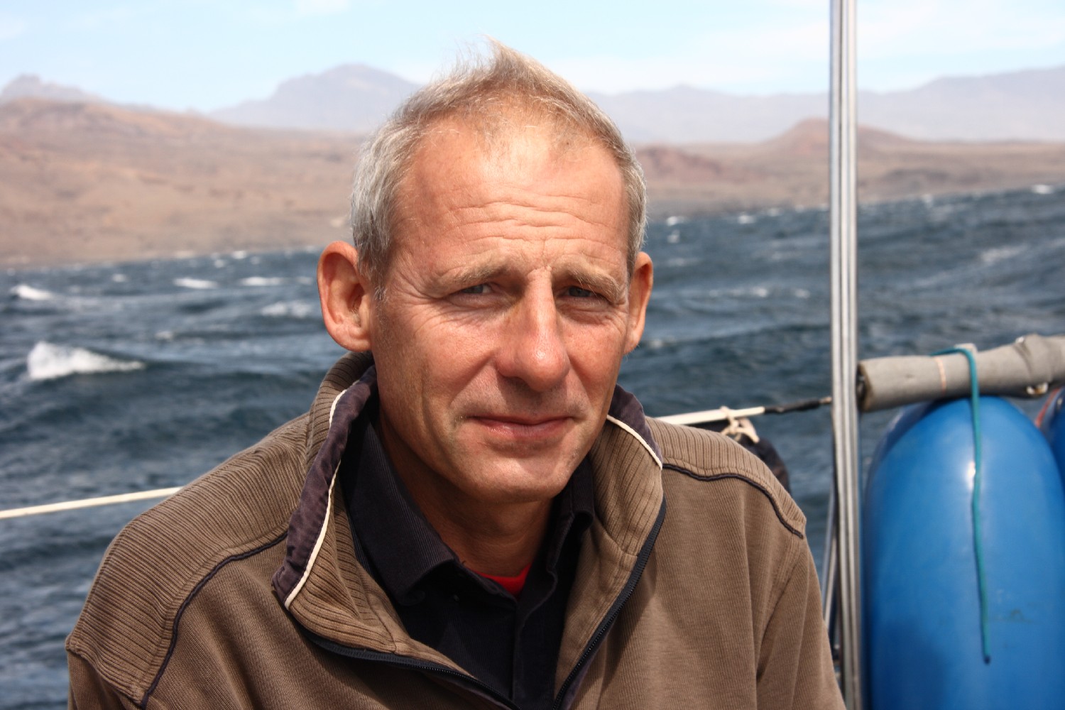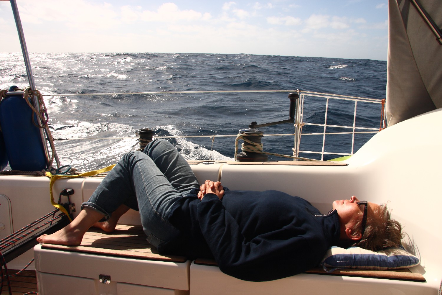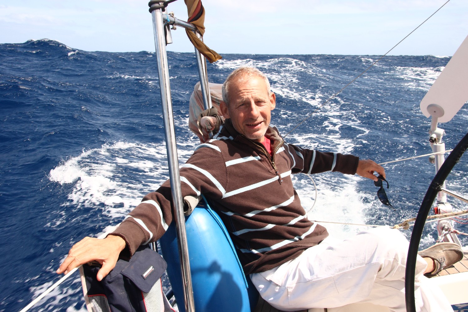 Unser Lebensraum reduziert sich auf unser Boot mit 11,4 m Länge und 3,7 m Breite. Wir sind zu viert. Erstaunlich, wie gut wir miteinander zurechtkommen, wo wir uns zuvor kaum kannten. Auf engstem Raum, denn Annette und ich nutzen die Vorderkabine nicht, da die Bewegungen dort zu heftig sind. Einer von uns ist ständig am Ruder, auch wenn „Admiral Schneider“  (unser Windpilot) seinen Dienst absolviert, denn es erfordert viel Übung, ihn so zu überwachen, dass er nicht vom Kurs abschweift. Er ist halt etwas vertüddelt und launig. Ich beschäftige mich viel mit ihm. Mal ist eine Schraube locker oder ein Seil hat zu viel Spiel oder es geht ein Knoten auf. Auf jeden Fall müssen wir verhindern, dass das Schiff vom Kurs abkommt und die Segel schlagen, denn wir haben ständig viel Wind und wollen das Rigg nicht gefährden. Und genauso ist es an Bord. Man möchte sich auf die See oder das Dasein auf See konzentrieren und dann verliert man sich doch zum Beispiel beim Hantieren mit dem Windpiloten. Also zurück zur Frage, was machen wir hier eigentlich und warum.