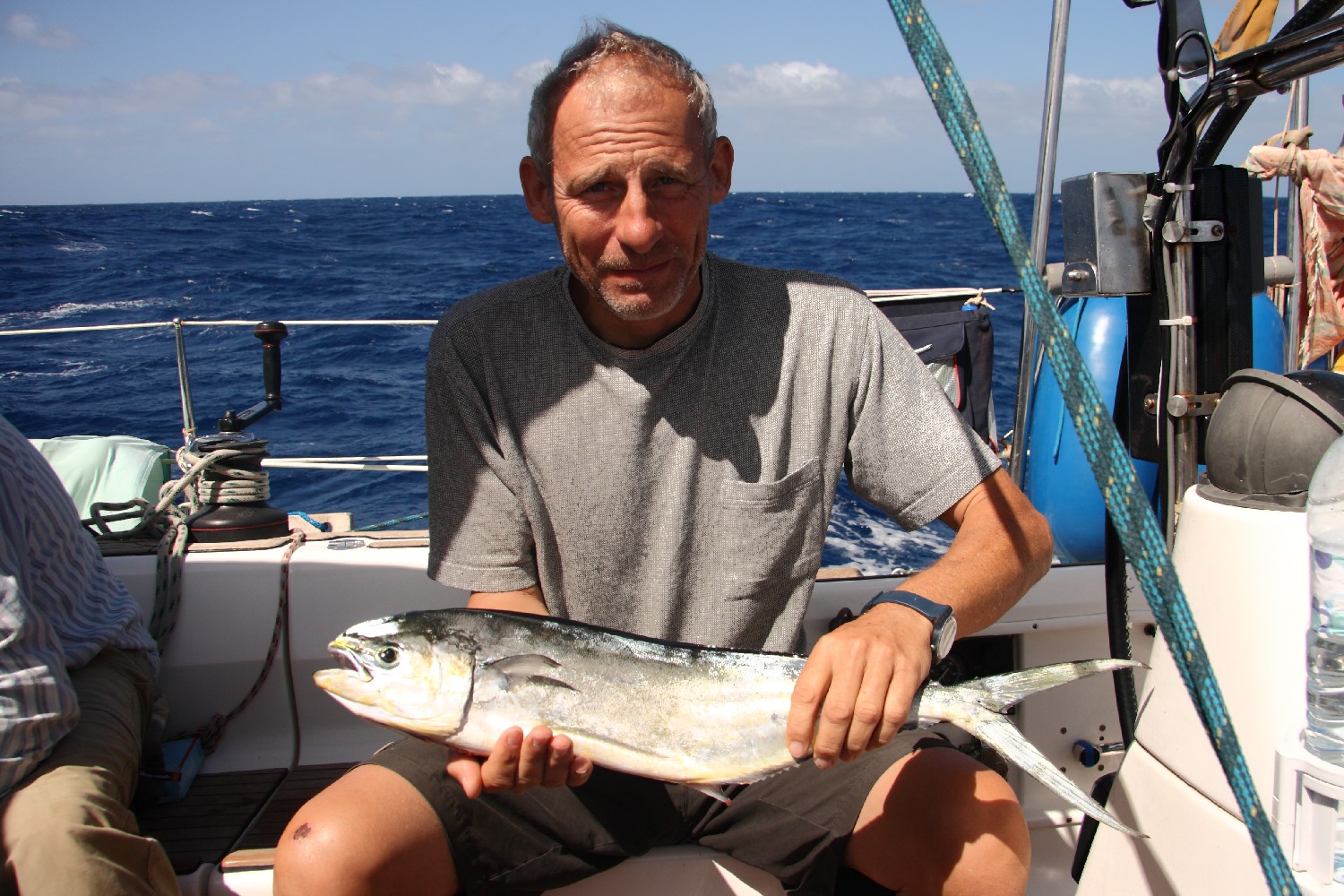Und  auch was darin schwimmt: Gestern war Fischalarm! Eine 60 cm große Goldmakrele ist auf den Oktopus-Köder reingefallen! Ins Cockpit hieven, ein kräftiger Schlag  mit der Winschkurbel auf den Kopf, ausnehmen, säuern, salzen, ab in die Butterpfanne. Frischer geht’s nicht! Goldmakrele fett, all you can eat. Ach ja, und das Blutbad im Cockpit noch mit ein paar Pützen wegspülen. Wir sind nun selbst angefixt und angeln, was geht – mit entsetzlichen Folgen: eine Makrele nach der anderen beißt an, aber wir bekommen sie nicht mehr an Bord, entweder sind sie zu schwer oder wir zu ungeschickt, es passt nicht mehr so zwischen uns und der Goldmakrele, die letzte hat uns sogar wie zum Hohne unseren genialen Oktopus-Köder weggeschnappt, ohne auch nur daran zu denken, in den Angelhaken zu beißen. Wir haben nun eine Oktopusnachbildung-Nachbildung gebastelt aus bunten Müllsackschnipseln…