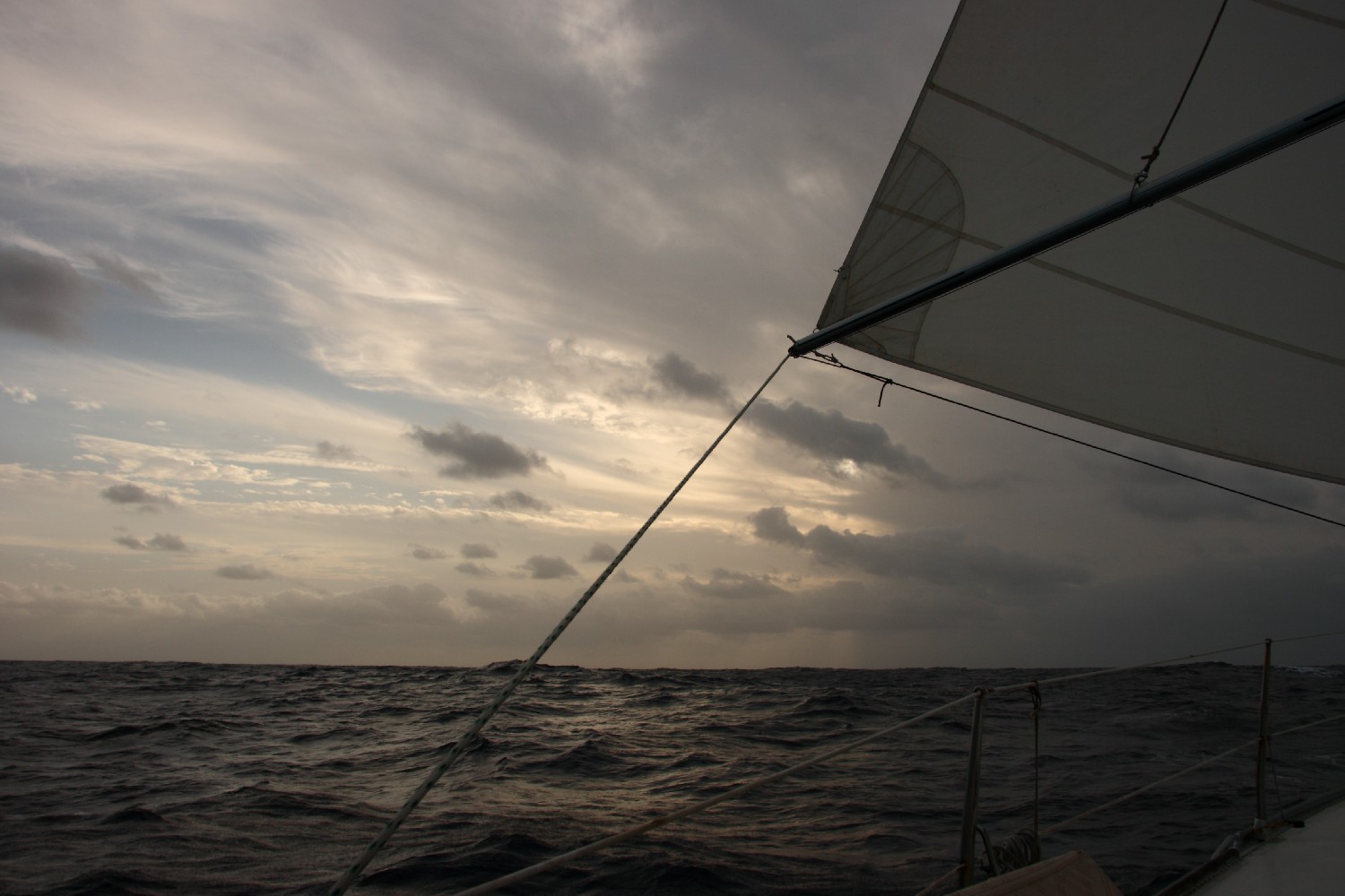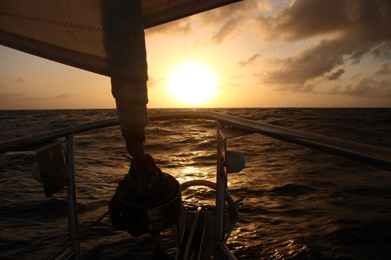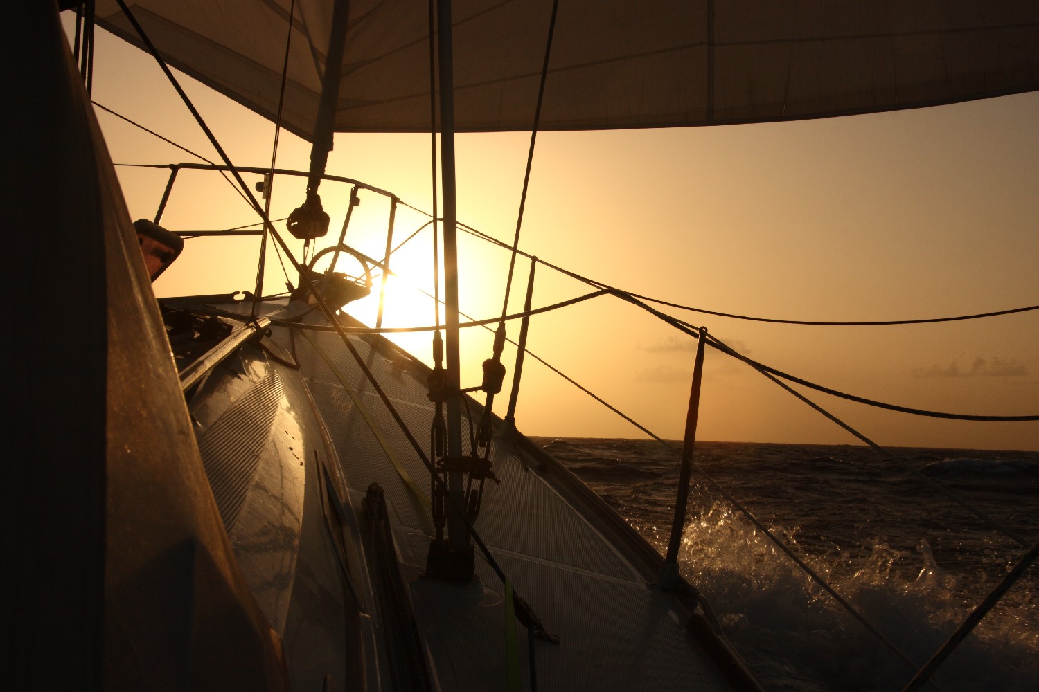 In meiner letzten Nachtwache dachte ich über das nach, was ich hier treibe. Wie kann man das Gefühl in Worten ausdrücken, das ich habe, wenn das Schiff durch den Passatwind nach Westen geschoben wird. Die Kraft, mit der die Anke-Sophie sich durch die Wellen schiebt. Und das mit einer nie gekannten Regelmäßigkeit. Seit einer Woche weht der Passat aus Nordost, je weiter wir kommen dreht er langsam auf Ost. Die Windstärke schwankt zwischen 5 und 6 Bft. mit Böen bis 7 Bft. Seit Tagen machen wir keine Manöver, wir rauschen mit der gleichen Segelstellung über die Wellenberge hinweg in das nächste Wellental.