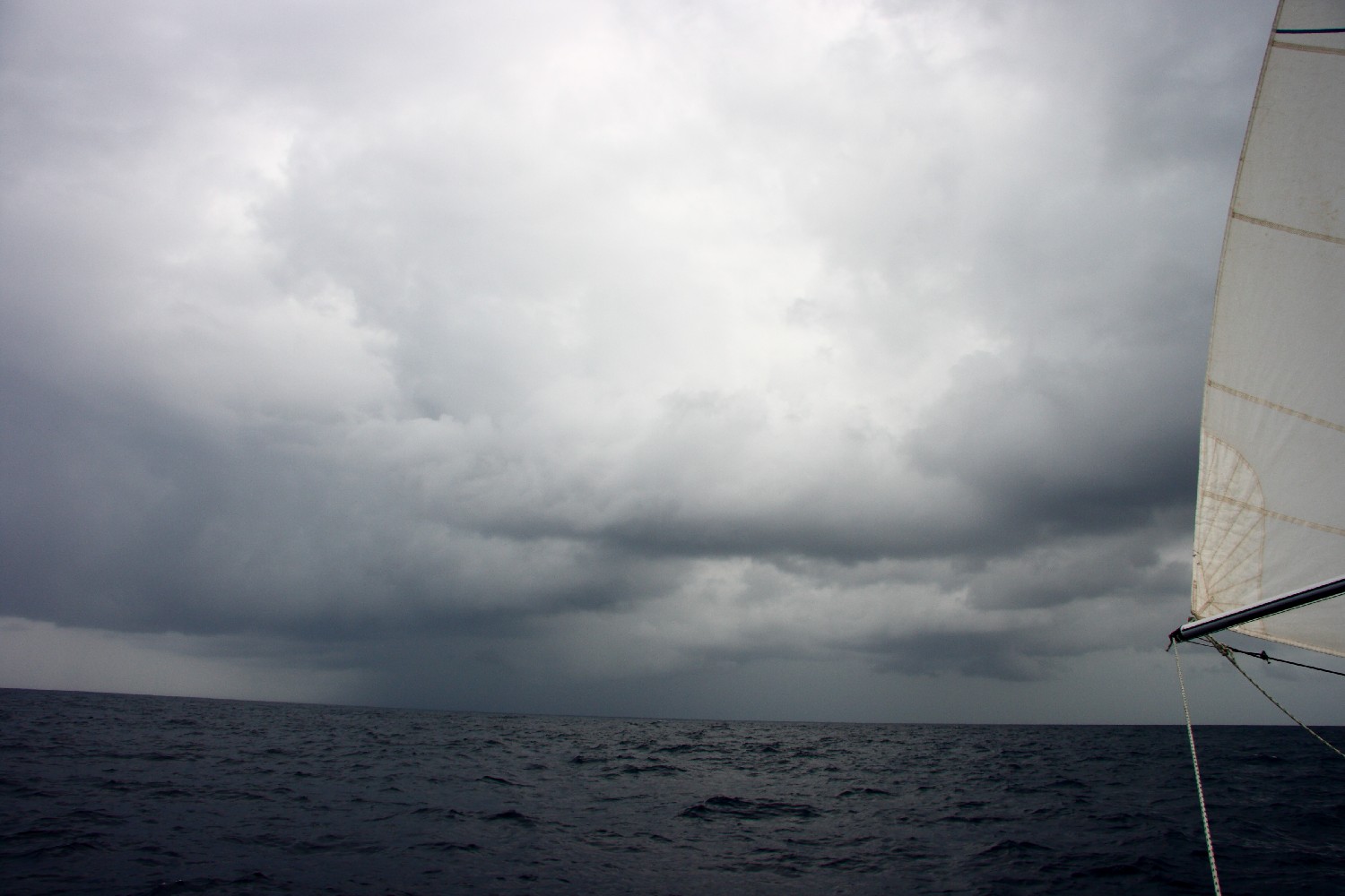 Auf unserer Fahrt von Panama nach Galapagos haben wir vieles. Flauten am Anfang und zwischendurch, dann am ersten und zweiten Tag ein stetiger Nordwind, der uns natürlich gelegen kam. Die nächsten Tage hatten wir wie für die Kalmen typische sehr wechselhafte Winde, meist am Wind bzw. gegen den Wind. Dann unglaubliche Wolkengebirge, schwarze Wände, überall Wetterleuchten. Dann wieder einen Sonnentag, wo wir den Kurs anliegen konnten und das Schiff bei angenehmen Winden wie auf Schienen lief. Dann kommen wieder gewaltige Schauer und Gewitter. Wir nehmen die Segel herunter, als wir in eine riesige schwarze Wand hineinfahren, in der es ständig blitzte und donnerte. Den ganzen Tag keine Sonne, mal 15 kn Wind, dann wieder nur 3 kn.