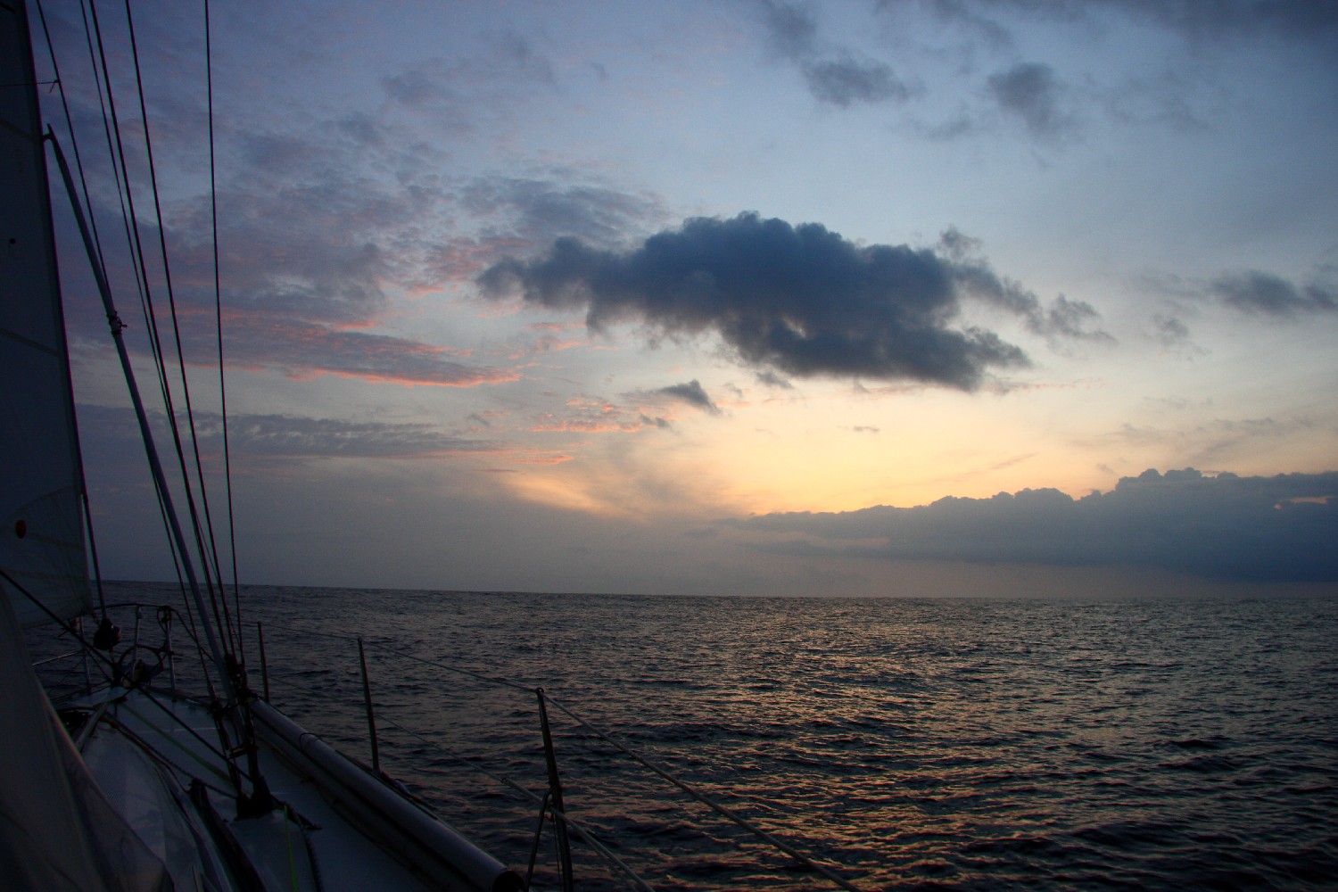 Zurzeit segeln wir von Panama City durch den Pazifik Richtung Äquator. Das Gebiet ist berüchtigt unter Seglern seit jeher, denn es liegt in den Kalmen. In dieser sog. Intertropischen Konvergenzzone steigen durch die tropische Sonneneinstrahlung mächtige Luftmassen in den Himmel auf und erzeugen großflächig Quellbewölkung. Die Konvektion zieht von Norden und Süden des Äquators Luftmassen nach, die hier konvergieren. Dadurch gibt es nur sehr leichte Winde unterbrochen von kurzen Windböen, Schauern und Gewittern. In einer der ersten Nächte hatten wir bei totaler Flaute überall in den Wolken um uns herum Wetterleuchten in allen Farben. Dazwischen sind wir mit unserem kleinen Boot, eine schöne Vorstellung, aber auch etwas unheimlich. Die Schwachwindphasen zwingen uns, immer wieder den Motor zu nutzen. Dies aber nur wohldosiert, denn trotz zusätzlicher Kanister haben wir nur 240 Liter Diesel an Bord, das reicht höchstens für die Hälfte der 1000 Seemeilen bis Galapagos. Bisher kamen wir ganz gut voran.