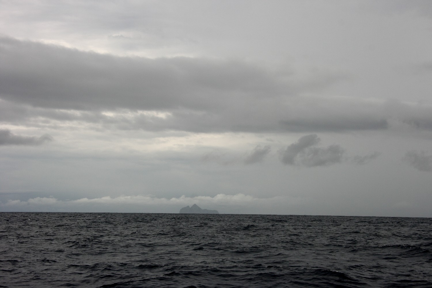 Die dritte Nacht auf See verlief sehr unruhig. Während wir am ersten Tag zunächst leichte Winde aus SE und dann zwei Tage Winde aus dem nördlichen Sektor hatten, drehte er dann in der Nacht auf SW, also kam genau aus der Richtung, in die wir wollen. Es gab, wie so oft beim Segeln, zwei Möglichkeiten. Jimmy Cornell empfiehlt in seinem Buch „Segelrouten der Welt“ auf Backbordbug zu segeln, wenn man am Ausgang des Golfs von Panama am Punta Mala auf SW trifft. Er schlägt vor zunächst weit nach Süden zu segeln, die kleine kolumbianische Insel Malpelo östlich liegen zu lassen und dort auf besseren Wind zu hoffen, auch könne man dort eine Strömung in südliche Richtung antreffen. Segeln wir auf diesem Bug, dann erreichen wir nur 150°, wobei der Sollkurs nach Galapagos bei 240° liegt, wir gewinnen also keine Seemeile zum Ziel. Auf Steuerbordbug laufen wir 240°, aber die Strömung lässt uns dann auf 270° wahren Kurs driften. Dieser Kurs bringt uns eindeutig näher an unser Ziel, aber wir bleiben zu nördlich und werden viel länger in den Kalmen verbleiben. Wie oft habe ich mich in Gedanken umentschieden? Noch einen Wetterbericht befragt, noch einmal Jimmy Cornell studiert, um mich durchzuringen, die zweite Variante zu wählen. Das geht so auch drei Stunden gut, bis der Wind immer schwächer wird und die Wolken immer dichter werden. Und plötzlich macht der Wind einen Purzelbaum und entscheidet sich genau entgegen gesetzt aus NE zu blasen. Schauer und Gewitter beuteln uns, ich nehme ohne Kleidung einen Regentanz an Deck vollführend eine Süßwasserdusche. Nach einiger Zeit wird mir kalt, ein ganz neues Gefühl. Annette übernimmt und steht für Stunden im Regen. Dann klart es auf, immer noch mächtige Wolken um uns herum, und wir entdecken endlich die Insel Malpelo an Backbord.