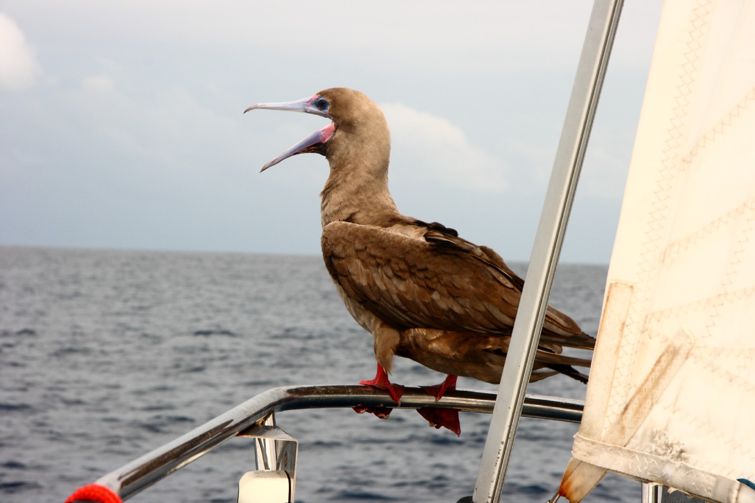 In dieser Woche begleiten uns oft Vögel und fliegen die ganze Nacht neben dem Schiff her und stürzen ab und zu ins Wasser, um einen Fisch zu fangen. Sie scheinen unser Boot als Basis zu nutzen, um aufgestörte Fische zu fangen. Ein Vogel, ich nenne ihn ohne es zu wissen Rotfußtölpel, bezieht für mehre Tage Position in unserem Bugkorb, bis es ihm im zunehmenden Wellengang zu ungemütlich wird und er lieber neben uns her fliegt. Als Dank hinterlässt er den Bug als Guanofelsen.