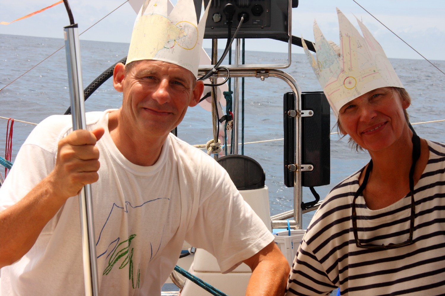 Dann ist der große Moment da. Wir haben den Äquator überschritten. Ab jetzt steht die Sonne mittags im Norden statt im Süden und in der Spüle soll der Strudel beim Ablaufen ab nun links herum drehen, wir werden das prüfen! Da keiner von uns bisher den Äquator auf einem Schiff überquert hatte, mussten wir uns gegenseitig taufen. Statt mit den üblichen Salbungen spülen wir den Dreck der Nordhalbkugel mit einer Salzwaserdusche ab,  Thomas nimmt eine Schaumrasur und gegenseitig setzten wir uns je eine aus alten Seekarten gefertigte Krone auf. Neptun stieg mit dem Fischhaken klopfend aus dem Meer an Bord und begrüßt standesgemäß die Neuankömmlinge auf der Südhalbkugel.