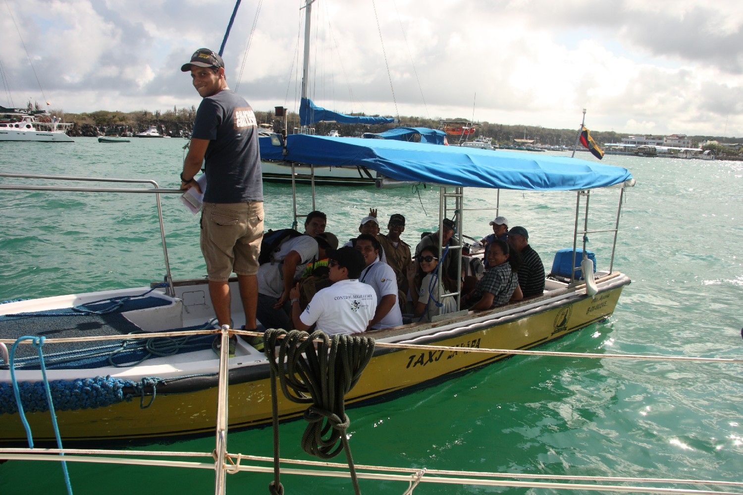 Wir fahren kurz an Land und wir melden uns beim Hafenkapitän. Dieser ist sehr nett, erklärt uns aber, dass er zusammen mit einem Agenten an Bord käme, um mit uns die Details zu besprechen. Eine Stunde später erklärt uns Marwin, unser Agent, was auf uns zukommt. Wir stimmen den Kosten zu, die wir schon aus der Literatur kannten, und zwei Stunden später kommen sie mit Verstärkung wieder. Ganz großes Kino: Insgesamt kommen 10 Offizielle gleichzeitig an Bord. Hafenbehörde, Polizei, Immigration, Naturschutzpark, Umweltschutz, Hygiene, Gesundheit, Fotografin, u.v.a.m. Es war schon warm, aber jetzt wird es extrem heiß und schwül unter Deck. Mein bescheidenes Spanisch ist deutlich besser als das Englisch von Marwin. Ein Dutzend Formulare wurde ausgefüllt, alle zig-fach von den Beteiligten gegengezeichnet, dann Abschied.  Zusätzlich kommt ein Boot mit einem Taucher, der Anke-Sophie von unten untersucht. Keine Beanstandung, wie auch, denn Annette hatte während einer Abendflaute kurz vor Galapagos in weiser Voraussicht auf dem offenen Meer den Algenbewuchs mit einem Küchenschwamm entfernt. Am nächsten Morgen kommt Marwin und bringt uns alle Papiere, wir dürfen also bleiben.