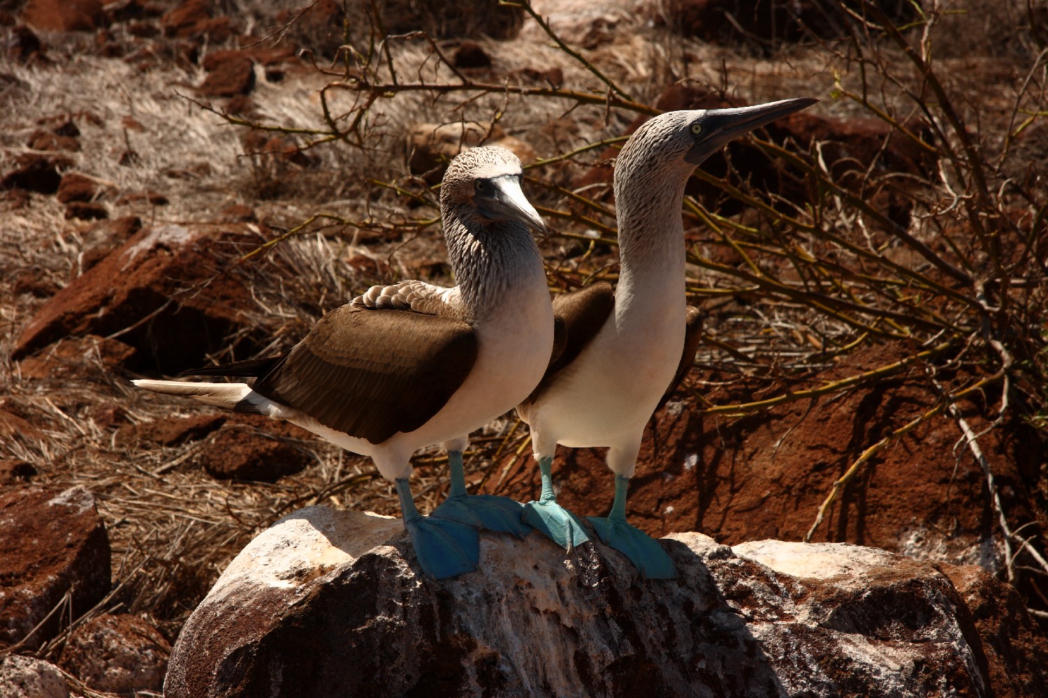 Wir konnten auch das Liebesspiel der Blaufußtölpel beobachten. Schon sonderbar, wenn ein Dutzend Touristen im Abstand von einem Meter neben dem Paar stehen und Erfolg oder Misserfolg der Brautwerbung verfolgen. Das Männlein hebt abwechselnd die blauen Füße und scheint damit um die Braut zu tanzen. Das Weibchen pfeift dazu einen schnatternden Zischton. Dann wird geschnäbelt und am Ende sitzen die beiden zufrieden nebeneinander auf einem Felsen, es hat wohl geklappt, obwohl 20 Touristenaugen jede Bewegung indiskret verfolgt haben.Galapagos_2_ 131