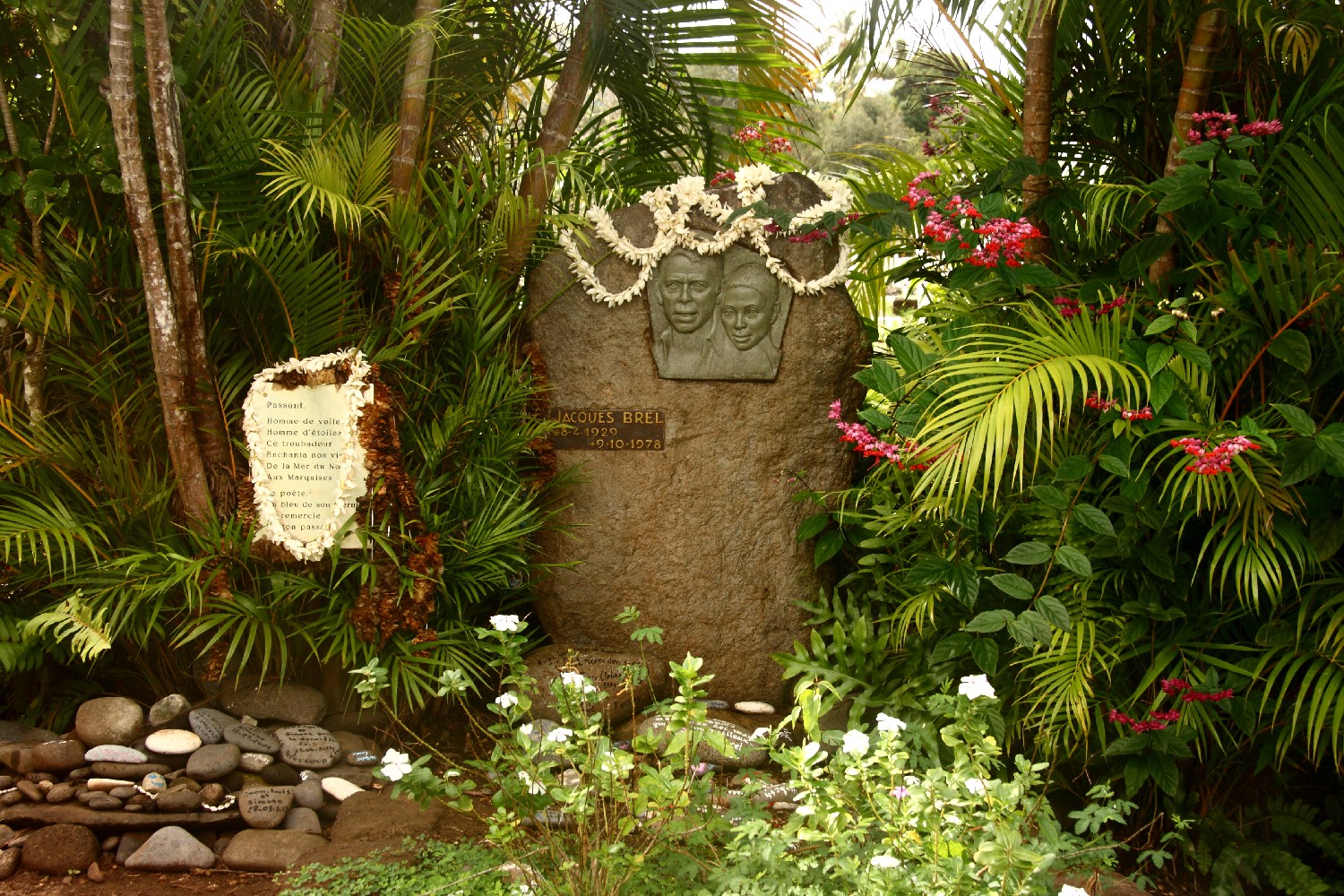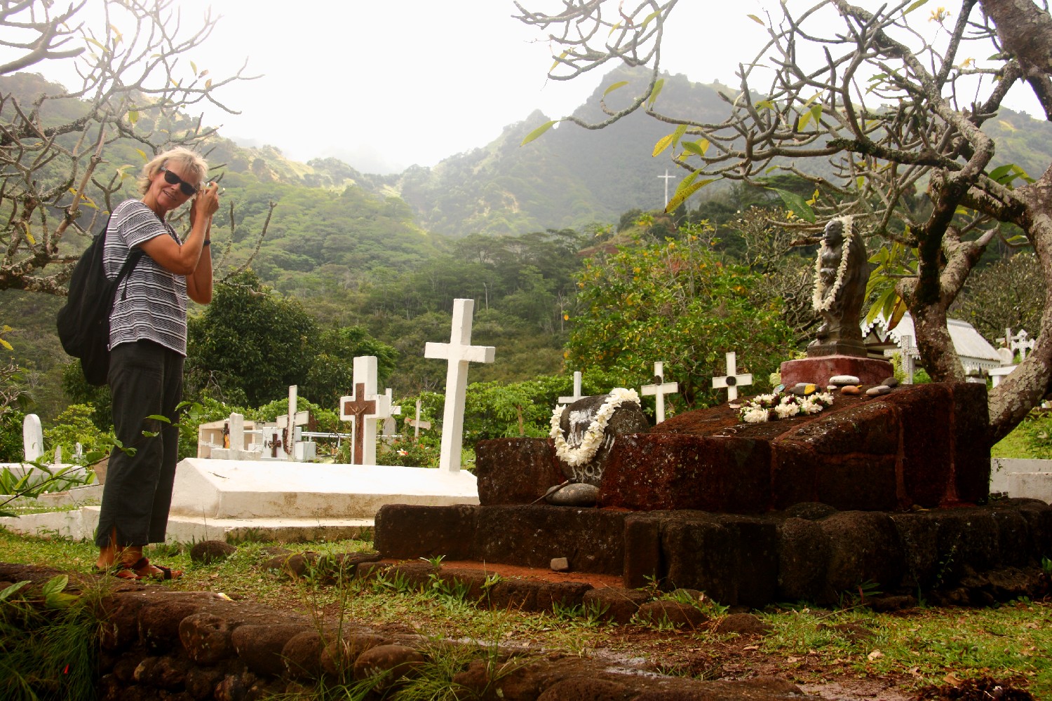 Wir besuchen die Gräber von Paul Gauguin und Jacques Brel, die beide auf Hiva-Oa begraben sind. Gauguin entschied sich 1890 nach Tahiti auszuwandern, um dort „das Primitive und Wilde“ zu suchen. Er segelte 1893 für eine große Ausstellung in Paris zurück nach Europa. Wieder in Tahiti flüchtete er nach einem Selbstmordversuch nach Hiva-Oa, wo er seine letzten Jahre verbrachte. Neben dem Schreiben und Zeichnen fertigte er weiterhin Skulpturen und Gemälde und half den Einheimischen sich gegen die französische Administration und die katholische Kirche zu verteidigen. Jacques Brel, er flüchtete vor der Presse, segelte 1975 mit seiner Ketch Askoy nach Atuona. Er kehrte bis zu seinem frühen Tod 1978 nie wieder zurück. Sein Flugzeug Jojo, mit dem er von Insel zu Insel flog, ist im Museum auf Hiva-Oa ausgestellt.