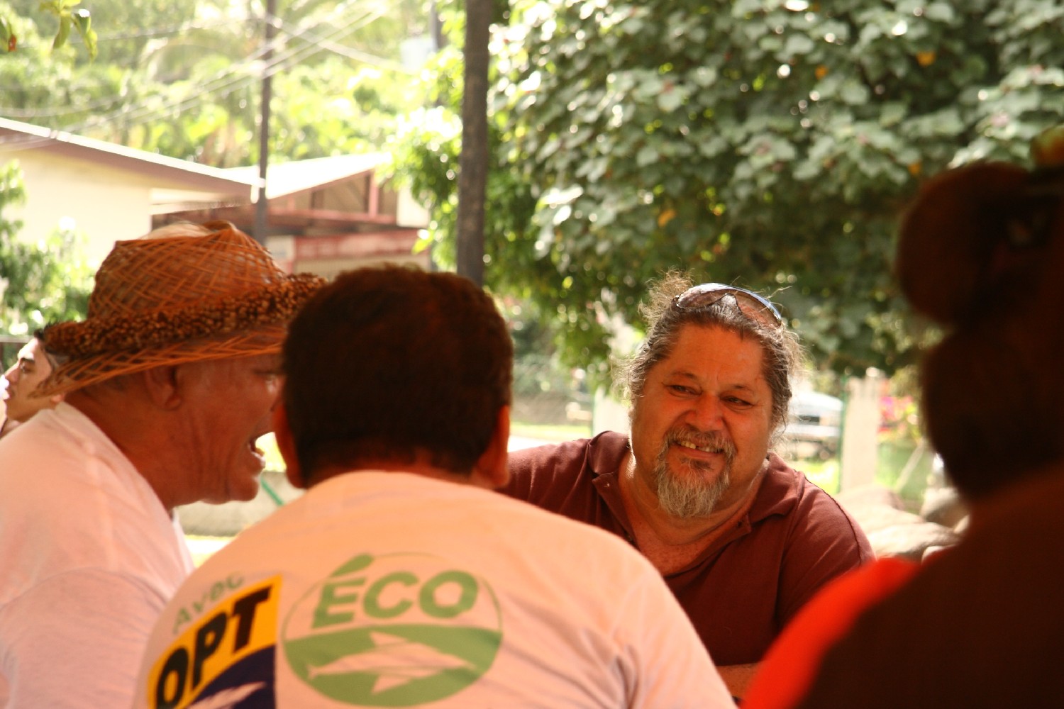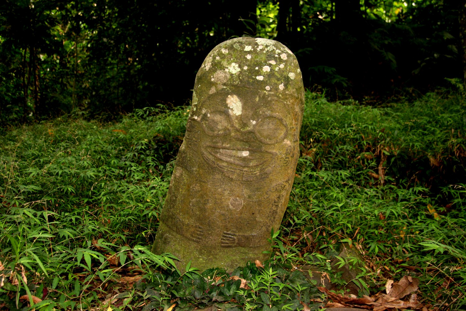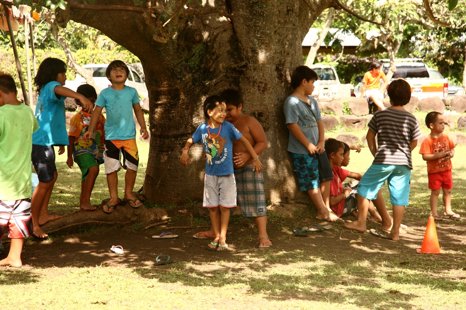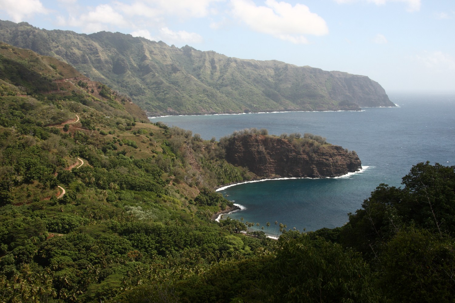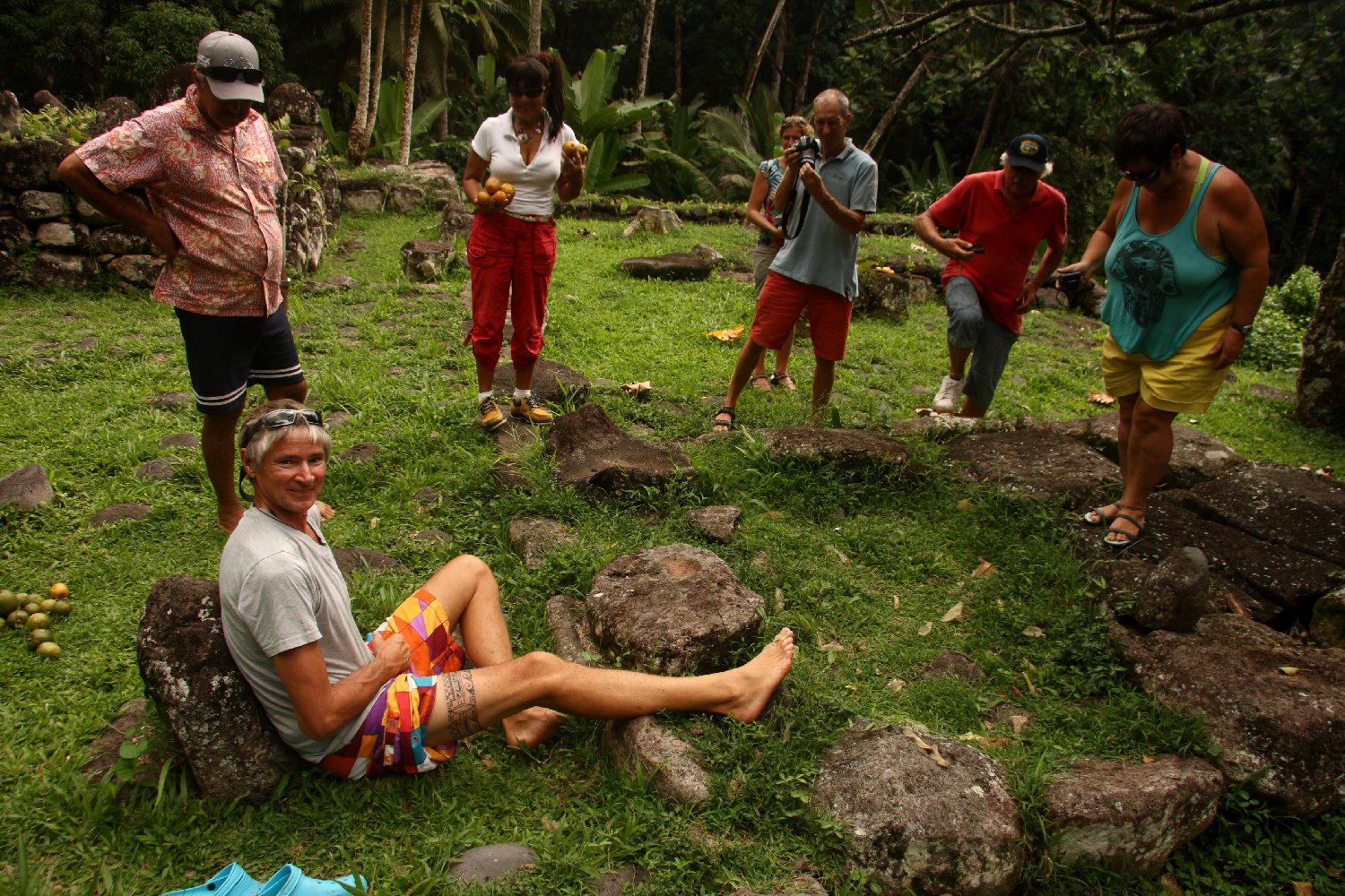 John, ein lokaler Fahrer, fährt uns acht mit seinem Geländewagen über die Bergkette von Hiva-Oa zu den archäologischen polynesischen Kultstätten. Zunächst besichtigen wir den „lächelnden Tiki“, der mitten im Wald gefunden wurde. Die Kultstätte (200 v.C.) war verschüttet und zugewachsen und wurde erst 1965 von französischen Archäologen wieder entdeckt. Es handelt sich um eine lächelnde Frau, die in ihrer Formgebung einmalig ist. Unterwegs halten wir immer wieder, um die weitläufigen Blicke über die wilde Insel zu genießen oder wir sammeln Taschen voll Mangos.