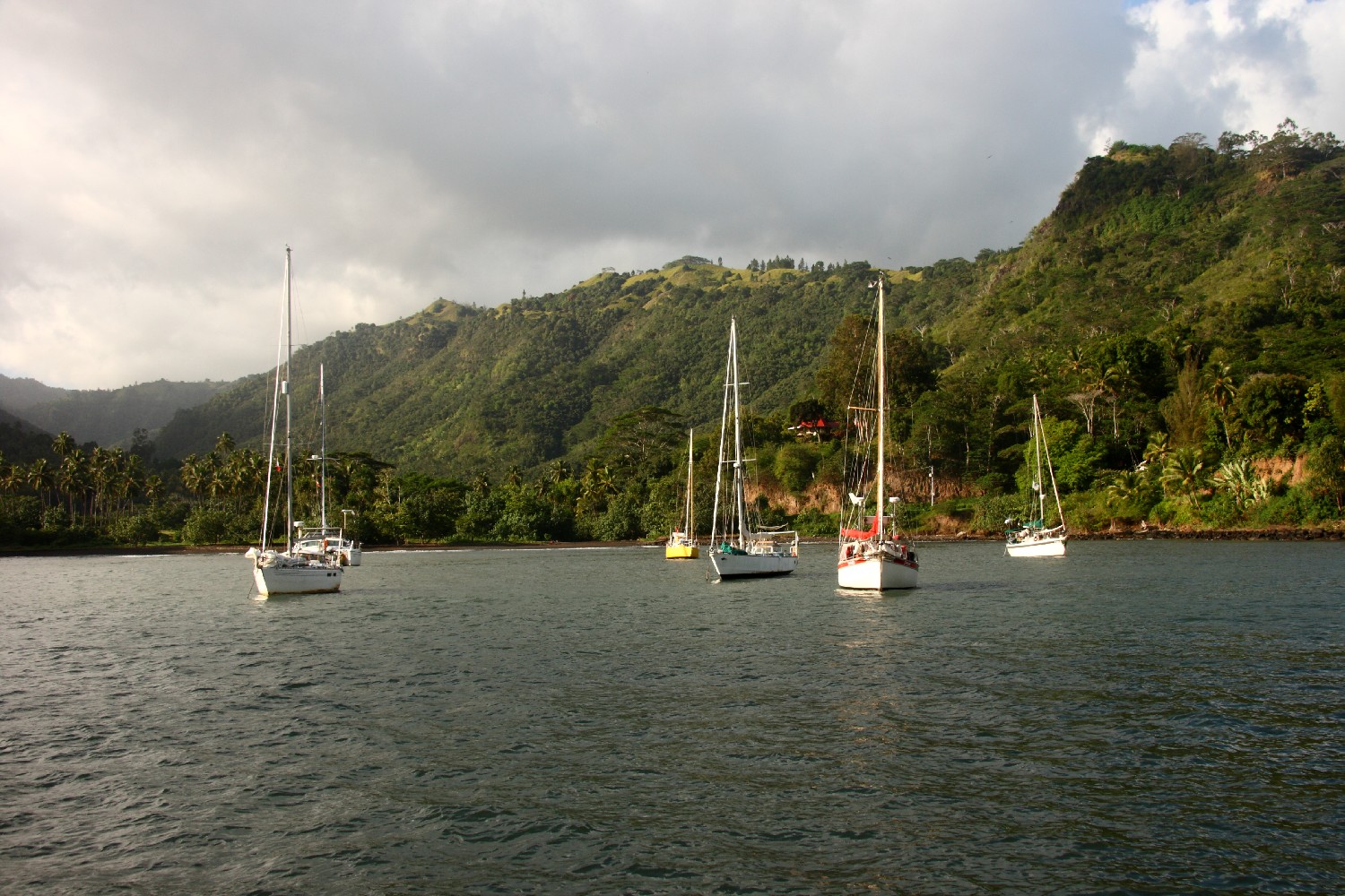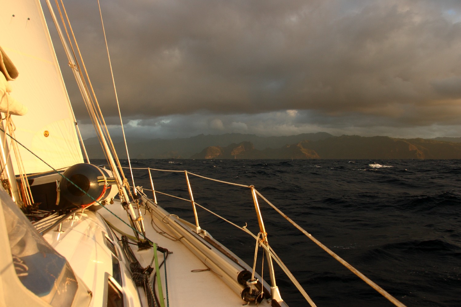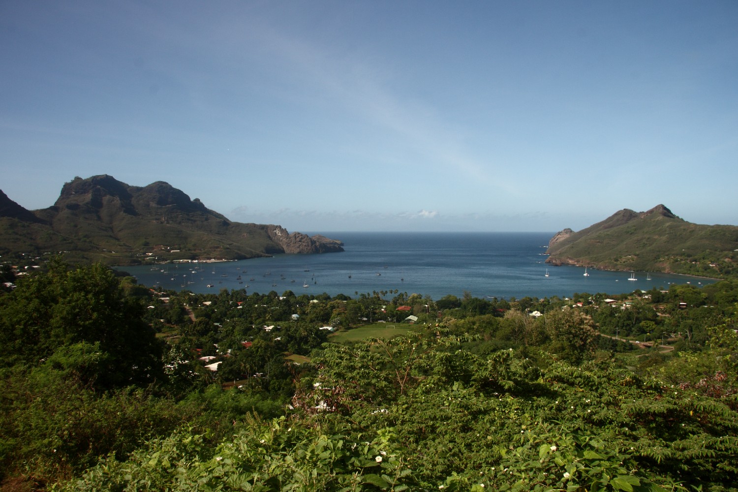 Nach drei Tagen segeln wir über Nacht nach Nuku Hiva, die Hauptinsel der Marquesas. In Taiohae angekommen, ankern wir in einem Krater. Die Bucht wird fast rundherum von einer Bergkette umgeben. In der Hauptstadt mit immerhin 1.700 Einwohnern haben wir wieder immerhin Internetzugang und können einkaufen. Annette und ich sitzen an Land in der Mittagshitze in einem kleinen Restaurant und laden neben dem Essen unsere Emails herunter, freuen uns über all die Nachrichten und beantworten sie gleich später an Bord.