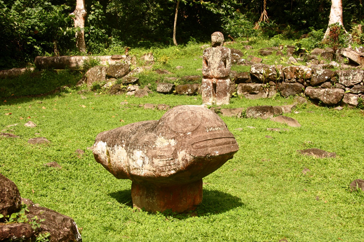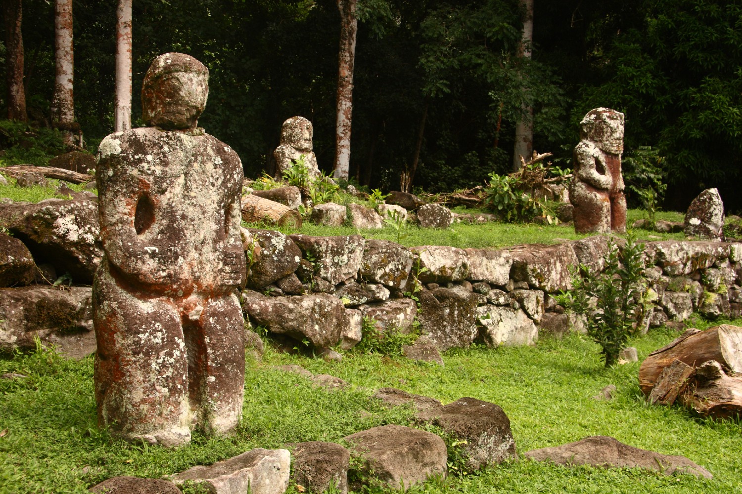 In einer Lichtung im Regenwald bei Puamau am anderen Ende der Insel Hiva Oa wurde auf einer Terrasse die bedeutendste polynesische Kultstätte Iipona entdeckt und restauriert. Die fünf Tiki waren von damaligen Mönchen umgestoßen worden. Alleine die Namen sprechen von alten Sagen: Takaii war ein Kriegerhäuptling und ist mit 2,67 m der größte Tiki überhaupt. Daneben Fau Poe, seine sitzende Frau, kennzeichnet sie als auf dem Feld arbeitend. Te Tovae E Noho hat sechs Finger an jeder Hand, leider fehlt der Kopf. Maki Taua Pepe symbolisiert eine auf dem Bauch liegende Frau, die gerade ein Kind gebärt. Mamuiotaa wurde geköpft, aber den Kopf haben Archäologen leider mitgenommen.
