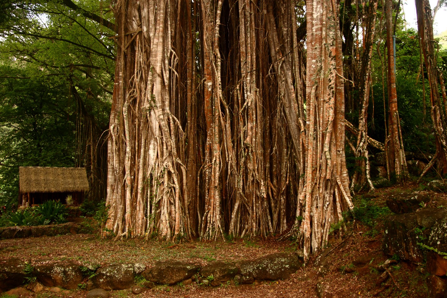 Mit anderen Seglern unternehmen wir eine Wanderung in die Berge. Wir suchen das Piki Vehine Pae Pae, einen alten Kultplatz, der 1989 für ein Festival renoviert worden war. Ein Marquese, alle sind extrem nett und hilfsbereit, zeigt ihn uns mitten im Wald. Ein großes Gelände mit Hütten und einigen Tiki ist umgeben von riesigen Bäumen mit gewaltigen Luftwurzeln. Wir betrachten alles mit Ehrfurcht und wollen mehr darüber wissen.