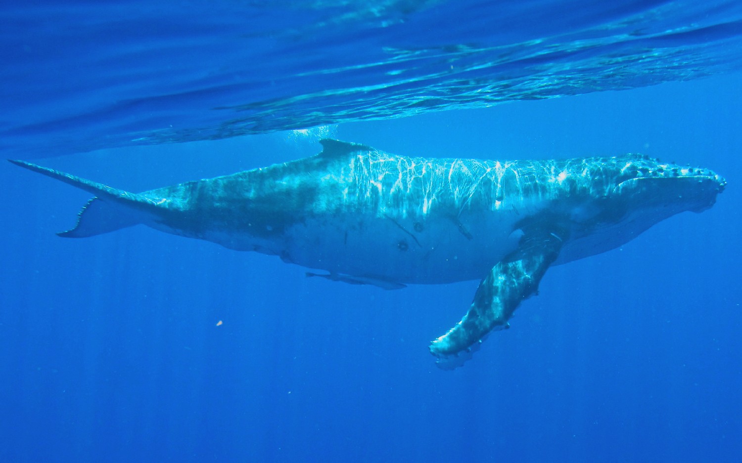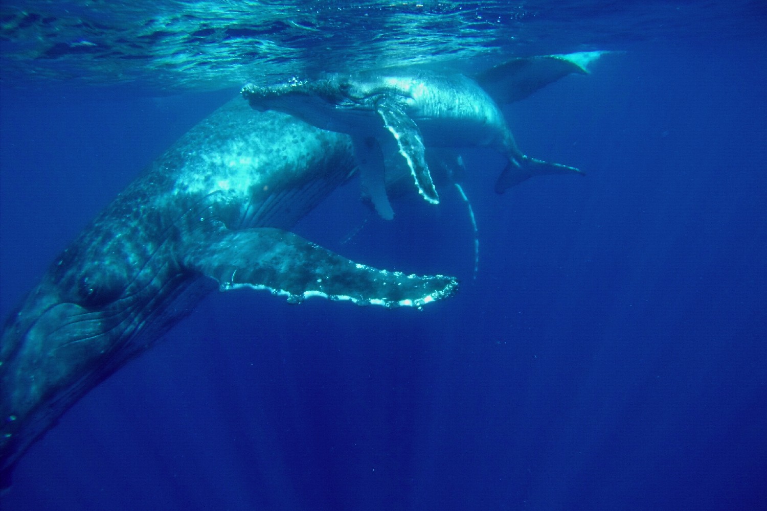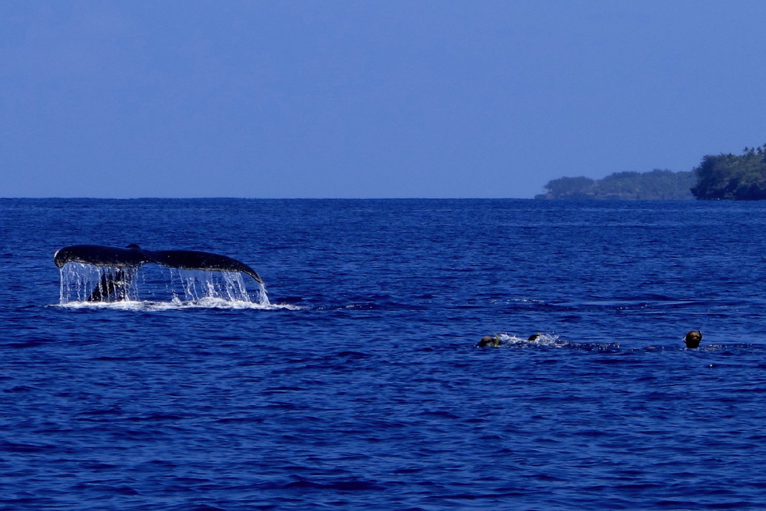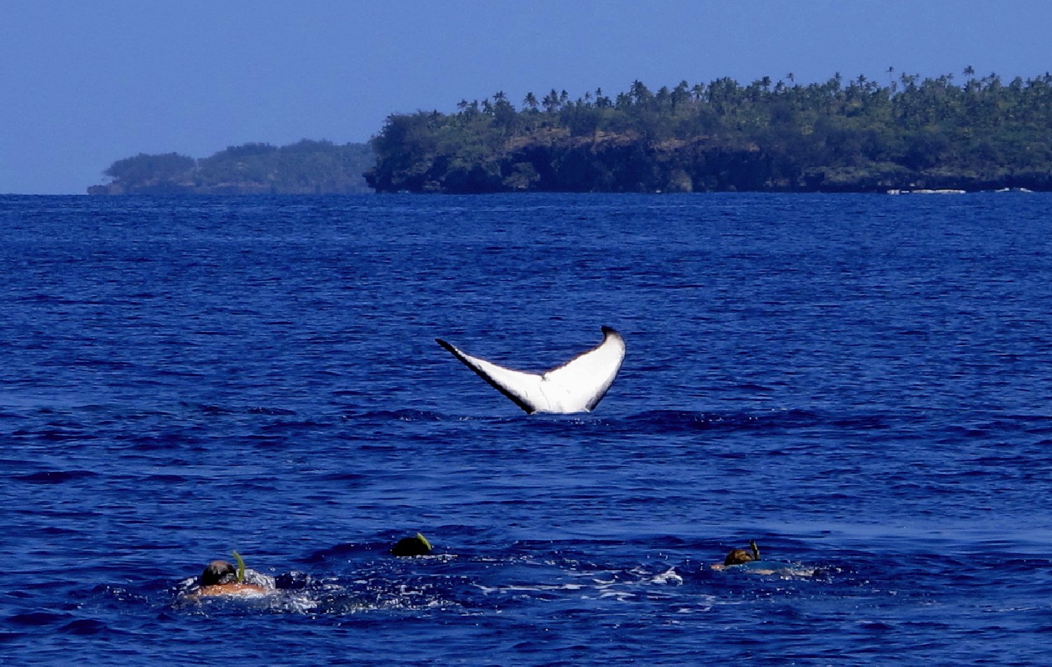 Die Wale kommen zur Vava’u Gruppe, um dort im warmen Wasser ihre Jungen zu gebären. Für einige Wochen bleiben sie hier, um die jungen Kälber beim Schwimmen zu trainieren und sie für die große Reise in die Antarktis vorzubereiten. Wir waren neun Teilnehmer auf einem schnelle „Whalewatchboat“ und fahren früh morgens für einen Tag hinaus in die Inselwelt, um die Wale aufzuspüren. Nach zweistündiger Suche entdecken wir eine Familie und steuern vorsichtig auf sie zu. Unser Guide springt zuerst ins Wasser, klärt die Situation und wir Schnorchler springen in Vierergruppen nacheinander hinterher und schwimmen direkt zu den Walen. Wir lernen, nicht direkt vor den Walen zu schwimmen, weil dies die Wale irritiert, denn so groß wie sind, gibt es direkt vor ihnen einen toten Winkel. Auch gilt es Abstand zu halten, um nicht von den seitlichen Finnen oder der Heckflosse getroffen zu werden. Die Kälber sind neugierig und kommen oft an die Oberfläche, um zu spielen. Die Eltern bleiben meist im tiefen Wasser, wir sehen sie schemenhaft ca. 30 m unter uns im klaren Wasser. Die Mütter passen natürlich auf ihre Jungen auf und kommen immer wieder nach oben zur Wasseroberfläche und wir Schnorchler sind als Zwerglinge irgendwo dazwischen. Es ist ein unglaubliches Erlebnis: Wir verbringen Stunden mit den Walen im Wasser, sehen zu, wie sie auftauchen und dann knapp unter der Wasseroberfläche schweben, wie das Kalb immer wieder zur Mutter kommt und herumtollt, auf dem Rücken schwimmt, springt, sich dreht, Kurven schwimmt und dann tauchen die Wale wieder ab, um in der dunkelblauen Tiefe zu verschwinden. Wir klettern wieder an Bord und die Suche beginnt von Neuem. Dann begleitet die nächste 4er-Gruppe die Wale und wir beobachten das Schauspiel vom Boot aus. Es ist ein Erlebnis, das ich nie vergessen werde, und ich lasse am besten die Photos sprechen, so kann sich jeder ein Bild von der Anmut dieser Lebewesen machen. Alleine die Größe ist beeindruckend, die erwachsenen Tiere schätze ich auf 20 m und das Kalb auf 5 m.