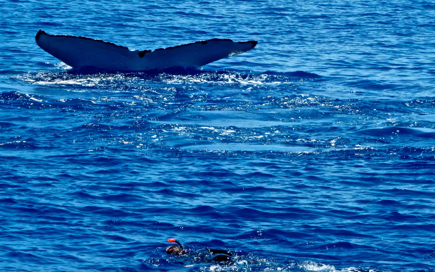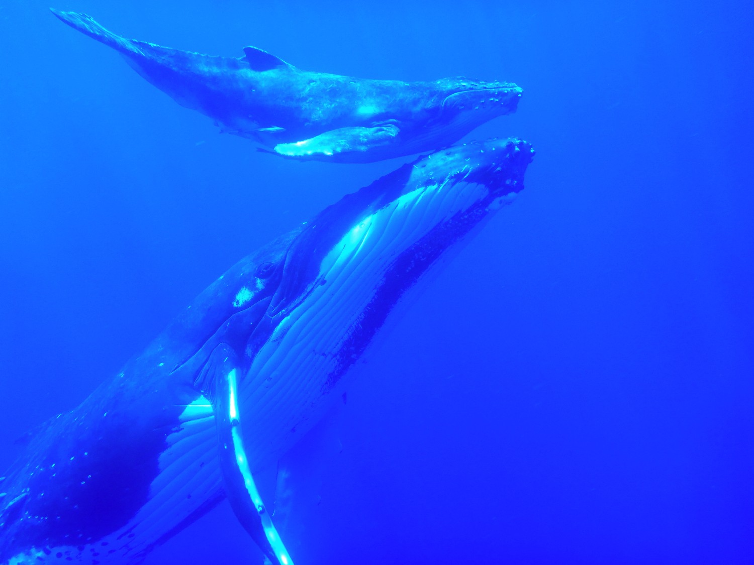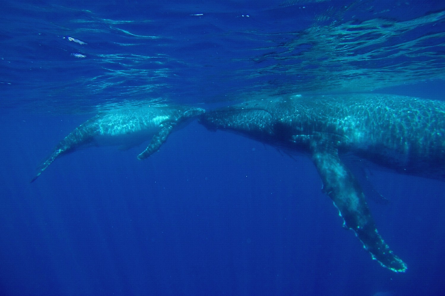 Die Wale kommen zur Vava’u Gruppe, um dort im warmen Wasser ihre Jungen zu gebären. Für einige Wochen bleiben sie hier, um die jungen Kälber beim Schwimmen zu trainieren und sie für die große Reise in die Antarktis vorzubereiten. Wir waren neun Teilnehmer auf einem schnelle „Whalewatchboat“ und fahren früh morgens für einen Tag hinaus in die Inselwelt, um die Wale aufzuspüren. Nach zweistündiger Suche entdecken wir eine Familie und steuern vorsichtig auf sie zu. Unser Guide springt zuerst ins Wasser, klärt die Situation und wir Schnorchler springen in Vierergruppen nacheinander hinterher und schwimmen direkt zu den Walen. Wir lernen, nicht direkt vor den Walen zu schwimmen, weil dies die Wale irritiert, denn so groß wie sind, gibt es direkt vor ihnen einen toten Winkel. Auch gilt es Abstand zu halten, um nicht von den seitlichen Finnen oder der Heckflosse getroffen zu werden. Die Kälber sind neugierig und kommen oft an die Oberfläche, um zu spielen. Die Eltern bleiben meist im tiefen Wasser, wir sehen sie schemenhaft ca. 30 m unter uns im klaren Wasser. Die Mütter passen natürlich auf ihre Jungen auf und kommen immer wieder nach oben zur Wasseroberfläche und wir Schnorchler sind als Zwerglinge irgendwo dazwischen. Es ist ein unglaubliches Erlebnis: Wir verbringen Stunden mit den Walen im Wasser, sehen zu, wie sie auftauchen und dann knapp unter der Wasseroberfläche schweben, wie das Kalb immer wieder zur Mutter kommt und herumtollt, auf dem Rücken schwimmt, springt, sich dreht, Kurven schwimmt und dann tauchen die Wale wieder ab, um in der dunkelblauen Tiefe zu verschwinden. Wir klettern wieder an Bord und die Suche beginnt von Neuem. Dann begleitet die nächste 4er-Gruppe die Wale und wir beobachten das Schauspiel vom Boot aus. Es ist ein Erlebnis, das ich nie vergessen werde, und ich lasse am besten die Photos sprechen, so kann sich jeder ein Bild von der Anmut dieser Lebewesen machen. Alleine die Größe ist beeindruckend, die erwachsenen Tiere schätze ich auf 20 m und das Kalb auf 5 m.