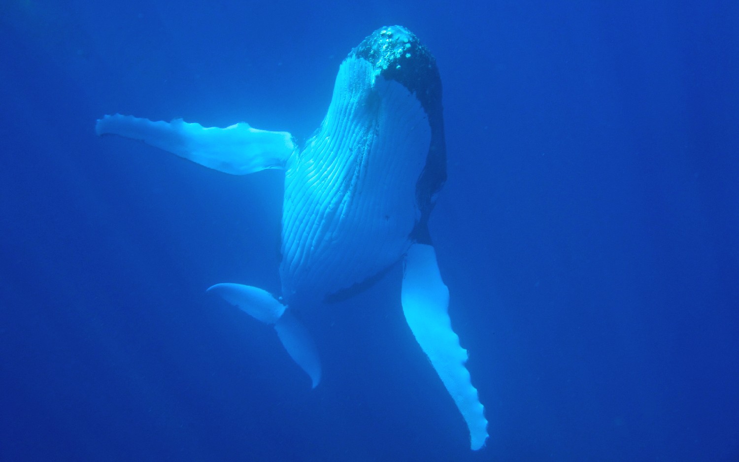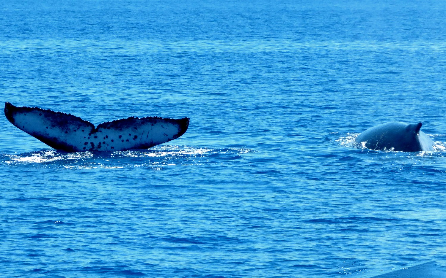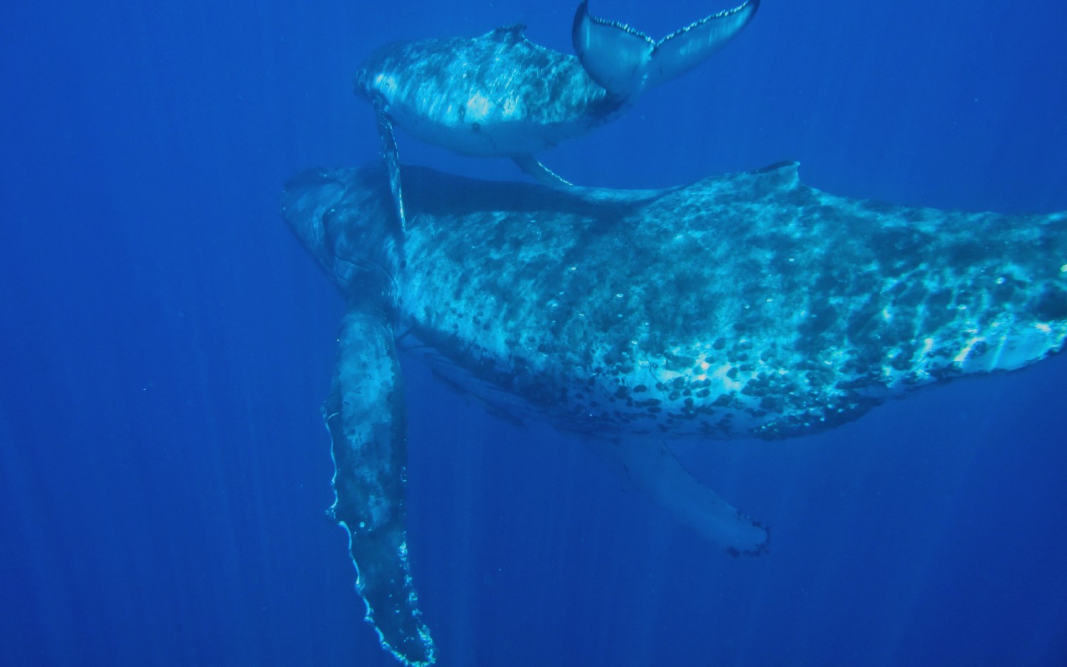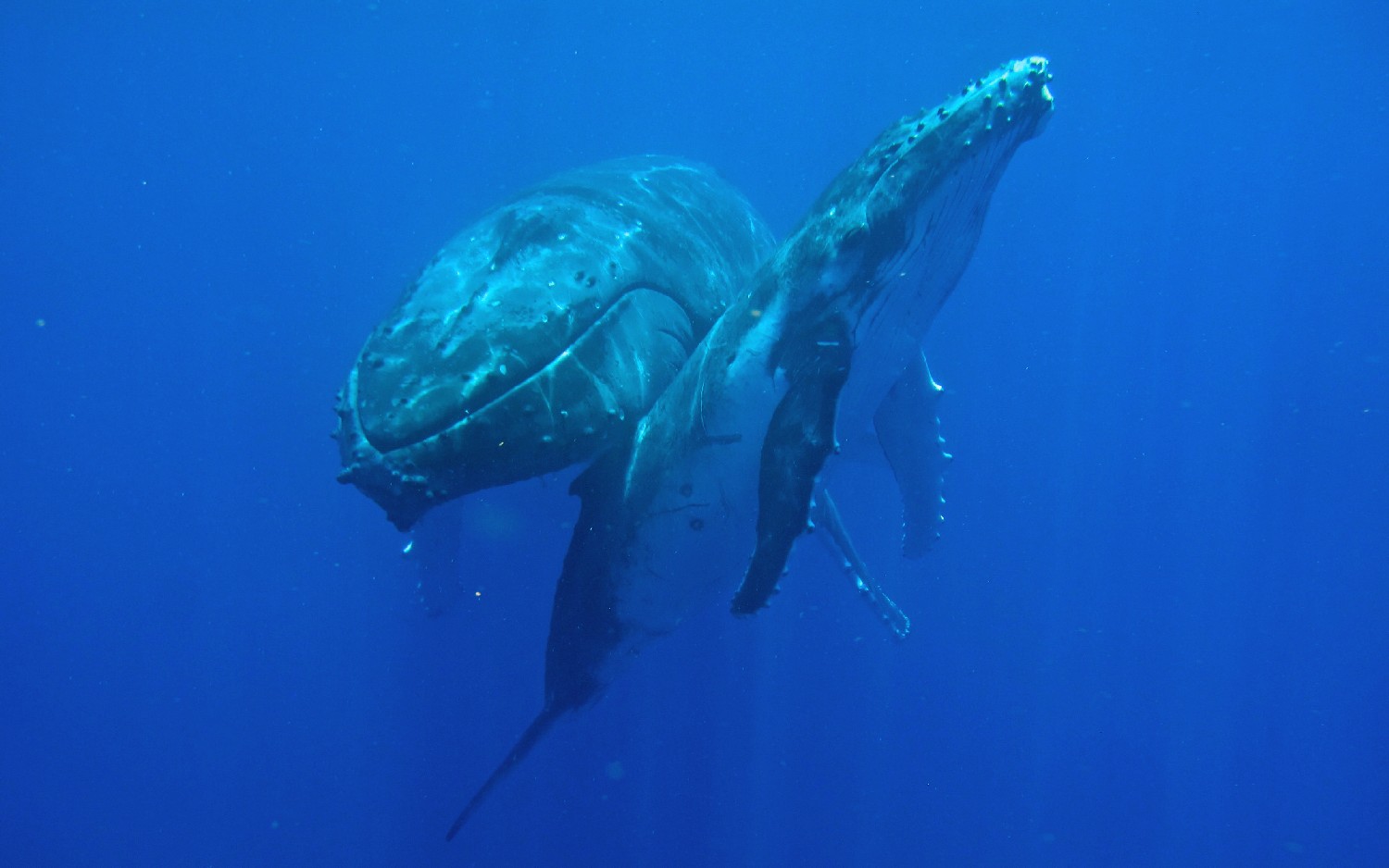 Die Wale kommen zur Vava’u Gruppe, um dort im warmen Wasser ihre Jungen zu gebären. Für einige Wochen bleiben sie hier, um die jungen Kälber beim Schwimmen zu trainieren und sie für die große Reise in die Antarktis vorzubereiten. Wir waren neun Teilnehmer auf einem schnelle „Whalewatchboat“ und fahren früh morgens für einen Tag hinaus in die Inselwelt, um die Wale aufzuspüren. Nach zweistündiger Suche entdecken wir eine Familie und steuern vorsichtig auf sie zu. Unser Guide springt zuerst ins Wasser, klärt die Situation und wir Schnorchler springen in Vierergruppen nacheinander hinterher und schwimmen direkt zu den Walen. Wir lernen, nicht direkt vor den Walen zu schwimmen, weil dies die Wale irritiert, denn so groß wie sind, gibt es direkt vor ihnen einen toten Winkel. Auch gilt es Abstand zu halten, um nicht von den seitlichen Finnen oder der Heckflosse getroffen zu werden. Die Kälber sind neugierig und kommen oft an die Oberfläche, um zu spielen. Die Eltern bleiben meist im tiefen Wasser, wir sehen sie schemenhaft ca. 30 m unter uns im klaren Wasser. Die Mütter passen natürlich auf ihre Jungen auf und kommen immer wieder nach oben zur Wasseroberfläche und wir Schnorchler sind als Zwerglinge irgendwo dazwischen. Es ist ein unglaubliches Erlebnis: Wir verbringen Stunden mit den Walen im Wasser, sehen zu, wie sie auftauchen und dann knapp unter der Wasseroberfläche schweben, wie das Kalb immer wieder zur Mutter kommt und herumtollt, auf dem Rücken schwimmt, springt, sich dreht, Kurven schwimmt und dann tauchen die Wale wieder ab, um in der dunkelblauen Tiefe zu verschwinden. Wir klettern wieder an Bord und die Suche beginnt von Neuem. Dann begleitet die nächste 4er-Gruppe die Wale und wir beobachten das Schauspiel vom Boot aus. Es ist ein Erlebnis, das ich nie vergessen werde, und ich lasse am besten die Photos sprechen, so kann sich jeder ein Bild von der Anmut dieser Lebewesen machen. Alleine die Größe ist beeindruckend, die erwachsenen Tiere schätze ich auf 20 m und das Kalb auf 5 m.