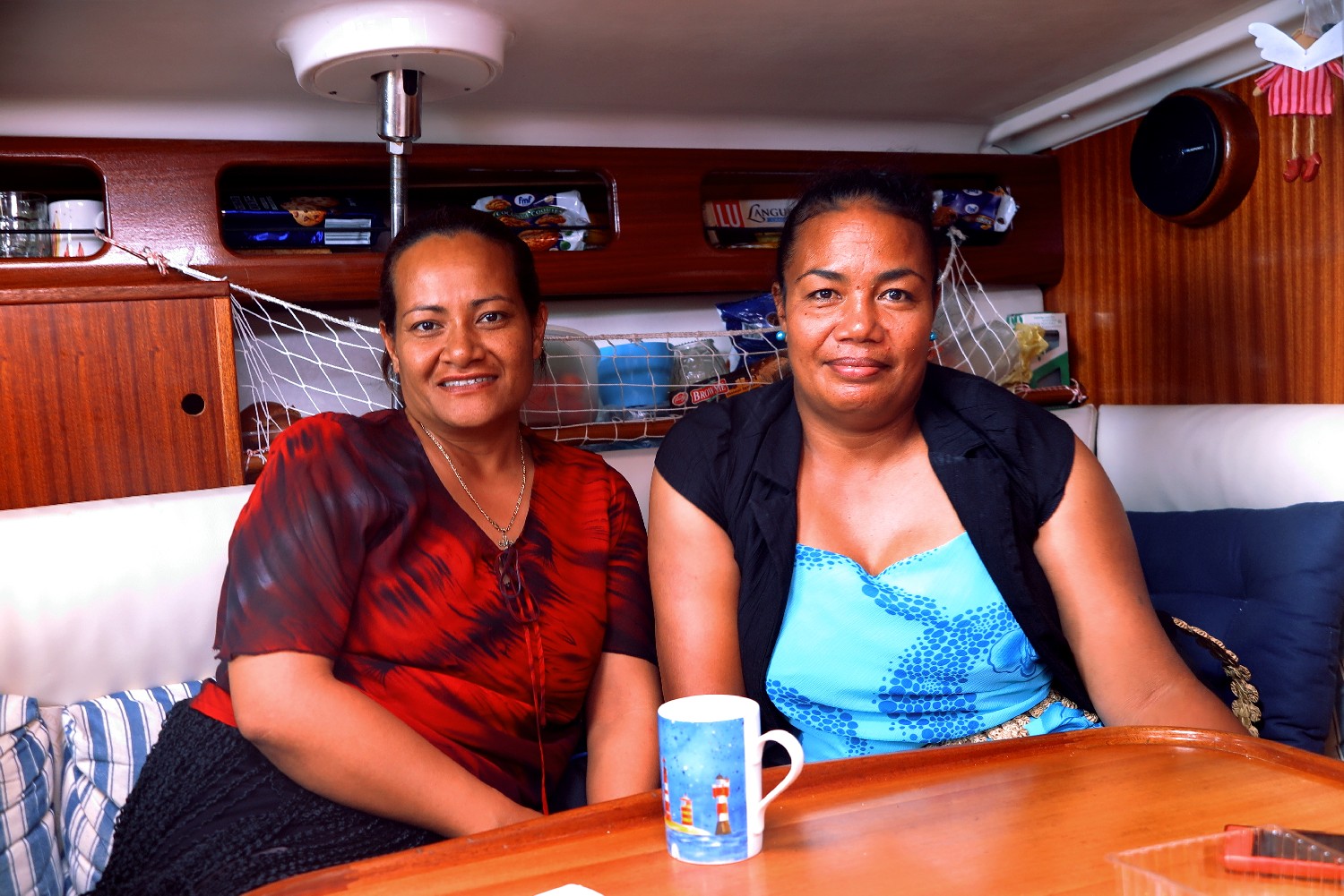 Das Einklarieren in Tonga war wieder von besonderer Art. Unser Ankommen in Niuatoputapu hatte sich im Dorf herumgesprochen und so warteten am nächsten Vormittag schon zwei Damen von Costums und Immigration am Pier, die wir mit unserem Dinghi zum Boot brachten. Die Formalitäten waren eigentlich schnell erledigt, aber die beiden fanden es so nett bei uns an Bord, dass sie bei Keksen und Kaffee gerne noch zwei Stunden blieben und wir uns über die Insel unterhielten. So waren wir auf nette Weise auf Stand gebracht, wussten, wo es Brot zu kaufen gibt und was wir so die nächsten Tage unternehmen könnten. Vor allem erfuhren wir auch, wann welche Kirche in welchem Dorf gerade Gottesdienst hat. Der Gang zur Kirche ist auch hier das wichtigste Ereignis am Tag. Als die beiden erfuhren, dass Annette Deutschlehrerin ist, durfte sie gleich ihre erste Stunde Unterricht abhalten. Im Gegenzug lernten wir die ersten Worte in Tonga: