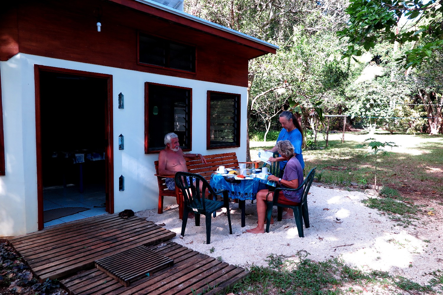 Wir wechselten zu der Insel Hunga und segelten durch einen extrem engen und flachen Pass in deren Lagune, in den ehemaligen Vulkankrater ein, was kurzfristig mal wieder spannend war. An dessen südlichem Ende besuchten wir Elke und Werner, die über 20 Jahre mit ihrer Segelyacht unterwegs waren und sich inzwischen hier niedergelassen haben. Sie leiten hier den Trans-Ocean-Stützpunkt von Tonga. Wir verbrachten eine schöne Zeit mit ihnen und besuchten sie in ihrem Haus, das sie in einem wunderschönen Garten selbst gebaut haben, und tauschten uns über unsere so unterschiedlichen Lebensmodelle aus. Unsere Zeit des Reisens ist auf drei Jahre limitiert, während sie sich für weitere zehn Jahre auf der Insel fernab der Zivilisation entschieden haben. Sie hatten ihre Yacht 2008 verkauft, unternehmen aber jedes Jahr schöne Reisen und besuchen ab und zu Deutschland. Wir vergleichen unser Leben, aber für uns wäre dieses zurückgezogene Leben so weit weg von den Freunden und für so lange viel zu einsam.