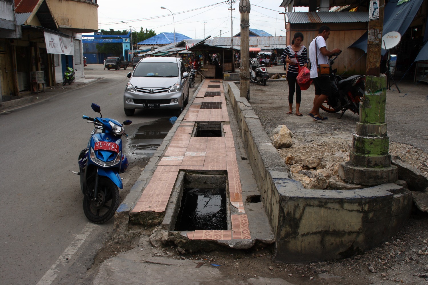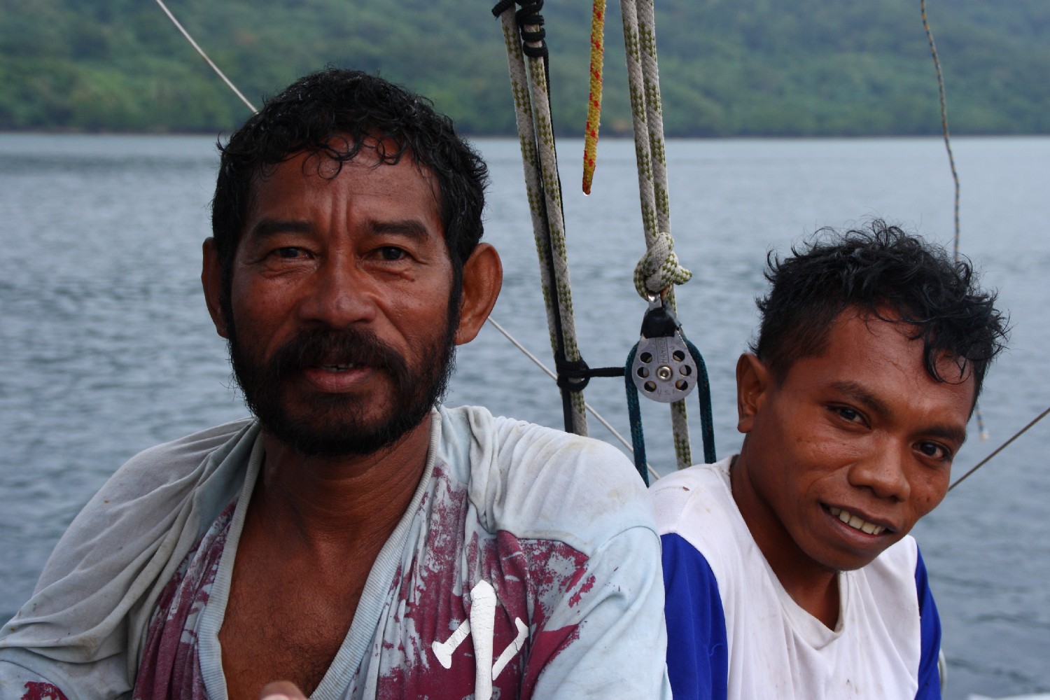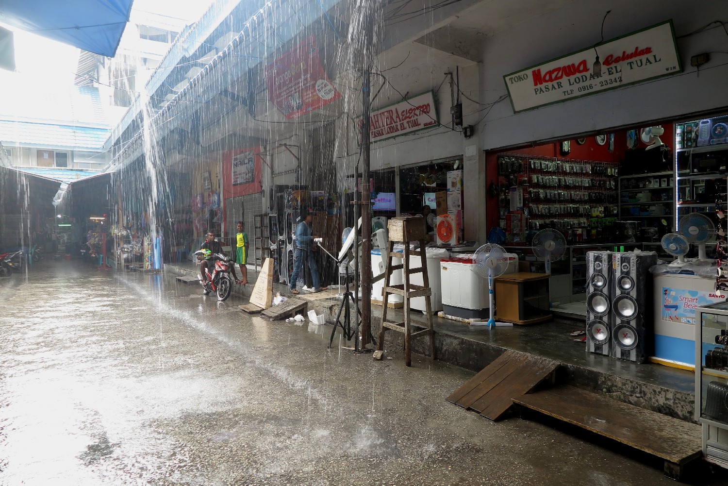Stundenlang lauschen wir von Bord aus dem Gesang der Muezzin. Von mindestens drei Moscheen klingen die arabischen Gesänge auf- und abschwingend und sich überlagernd zu uns herüber. Wir sind in Asien und es klingt nach Orient. Das Leben in dieser fernen Region wird stark von der Religiosität bestimmt. Wir sind endlich in einer Region angekommen, die nicht vom Christentum dominiert wird, denn bisher waren die ursprünglichen Kulturen in der Karibik, Mittelamerikas oder im gesamten Pazifikraum durch die Kolonialisierung stark beeinflusst, um nicht zu sagen beinahe ausgelöscht. In Tual herrscht der Islam. Aber wohl in sehr gemäßigter Form und nicht extremistisch. Wir haben den Eindruck, dass die Menschen offen auf uns zu gehen und neugierig sind. Als ich am dritten Tag mit meiner großen Kamera offen durch die Straßen gehe, um die Eindrücke einzufangen, werde ich überall aufgefordert, die Leute aufzunehmen. Ich hätte zunächst das Gegenteil erwartet, aber wir bunten Hunde erfreuen die Leute an jeder Ecke und allen bereitet es sichtlich großes Vergnügen, abgelichtet zu werden. So wandelt sich unser Blick in drei Tagen vom ersten schockähnlichen Staunen zu langsamem Kennenlernen der hektischen Stadt mit ach so vielen Gesichtern. Der Basar unter einfachen Zeltplanen auf durchweichtem Boden, wo Lebensmittel und Handwerksutensilien dargeboten werden. Die Straßen voller Motorräder, eine stinkende atemberaubende Unsitte, die wir bereits aus Vietnam kennen. Die alten Häuser, schief und krumm, einst sicherlich ordentlich, heute meist verfallen.