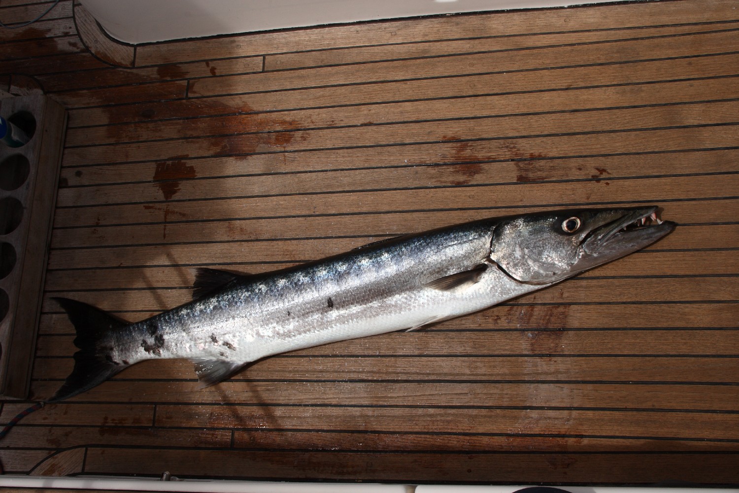 Zwischendurch erfreut uns das lange vermisste Geräusch, das den Fischalarm signalisiert, die ausrauschende Leine. Endlich einmal wieder ziehen wir einen langen schlanken Fisch mit unserem Haken an Bord. Wir haben mächtig Respekt vor den gebogenen Fangzähnen und denken, dass wir einen Barrakuda an der Leine haben. Ich habe das stolze Tier ausgenommen, geschuppt und beinahe fertig filettiert, als Annette mit der „Proviantbibel“ in der Hand an Deck erscheint, die uns aufklärt, dass Barrakudas oft von der Ciguatera verseucht sind. Es sind Raubfische, in denen sich das Nervengift über die Nahrungskette gefressener verseuchter Korallenfische anhäuft. Wir fingen den Barrakuda in der Nähe eines Riffs und sind gewarnt, denn unsere holländischen Freunde hatte es schwer getroffen; sie waren ein halbes Jahr daran erkrankt. Schweren Herzens geben wir aus Vorsicht den lange ersehnten Fisch statt in die Pfanne lieber über Bord.