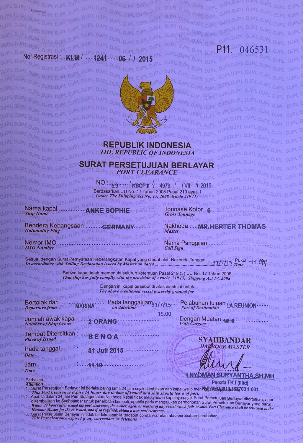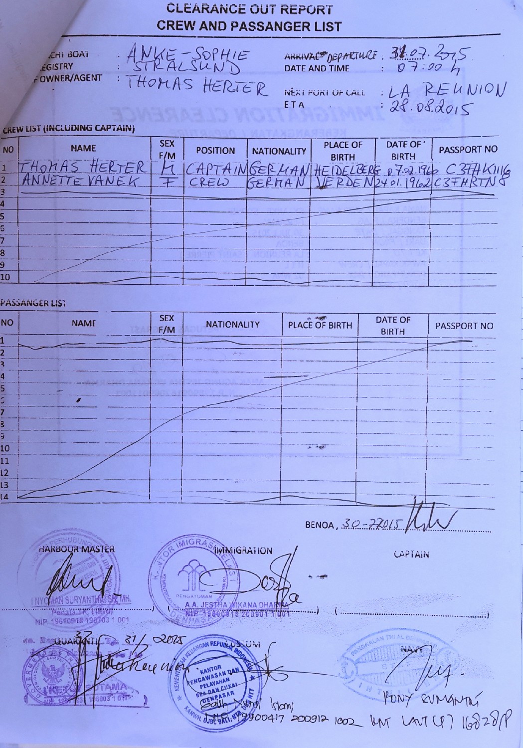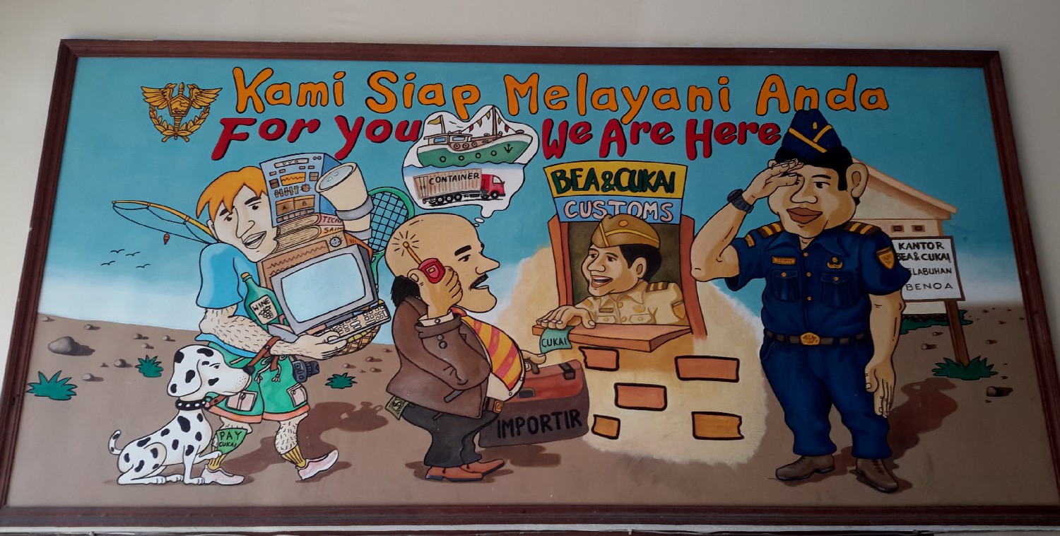 Den Freitag verbringen wir beim Zoll, bei der Quarantäne, bei der Marine und beim Hafenmeister. Wir haben gelernt, dass man in Indonesien immer freundlich bleiben muss, egal was passiert. Aber das fällt uns nun wirklich nicht leicht, denn insgesamt müssen wir allein fünf Mal in das Büro vom Zoll und dann begleiten wir sie auch noch an Bord, denn sie müssen die Motorseriennummer prüfen, na toll. Man sollte es sportlich sehen. Schließlich sind wir nassgeschwitzt  beim Zieldurchgang und halten unsere Papiere für die Überfahrt in den Händen.