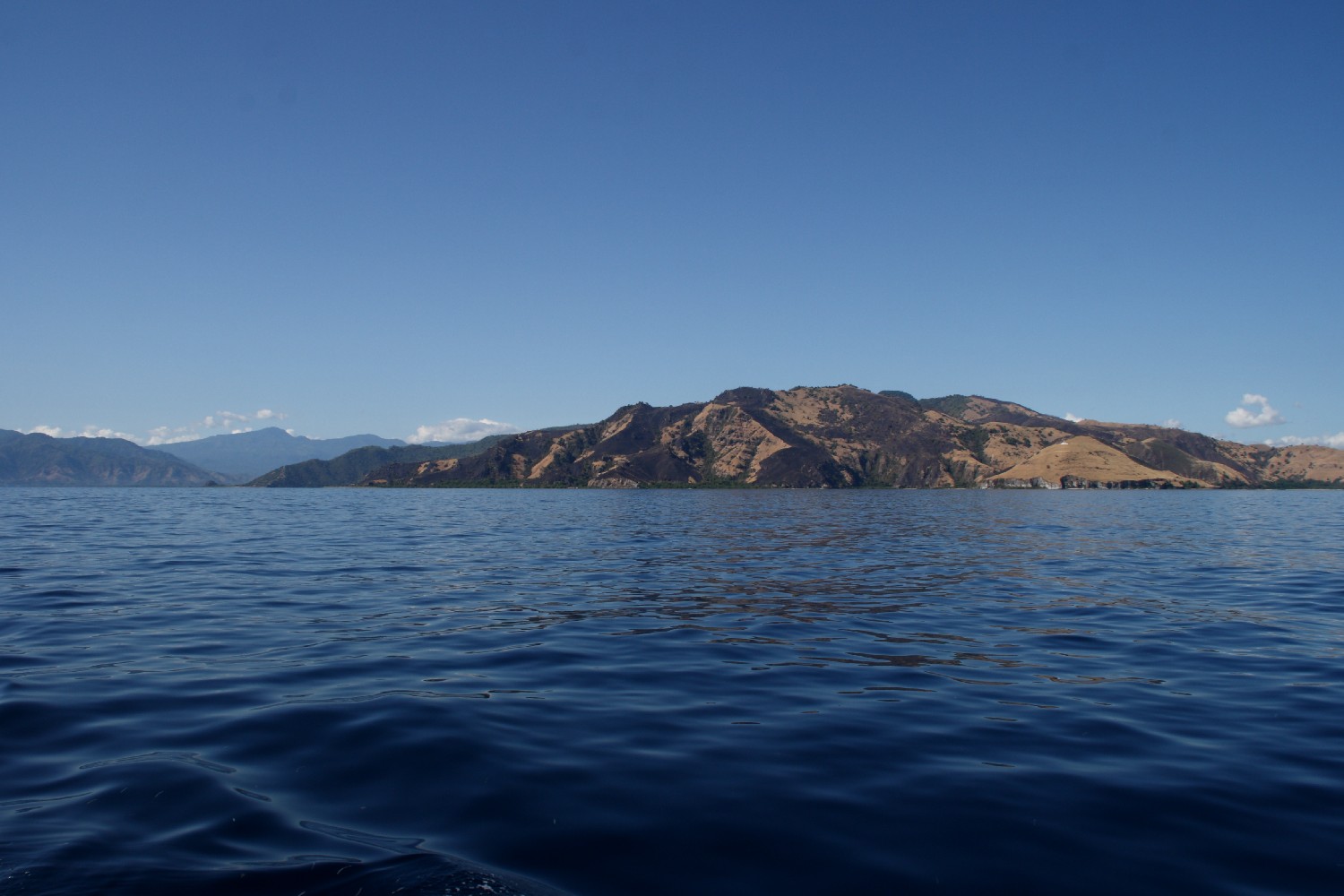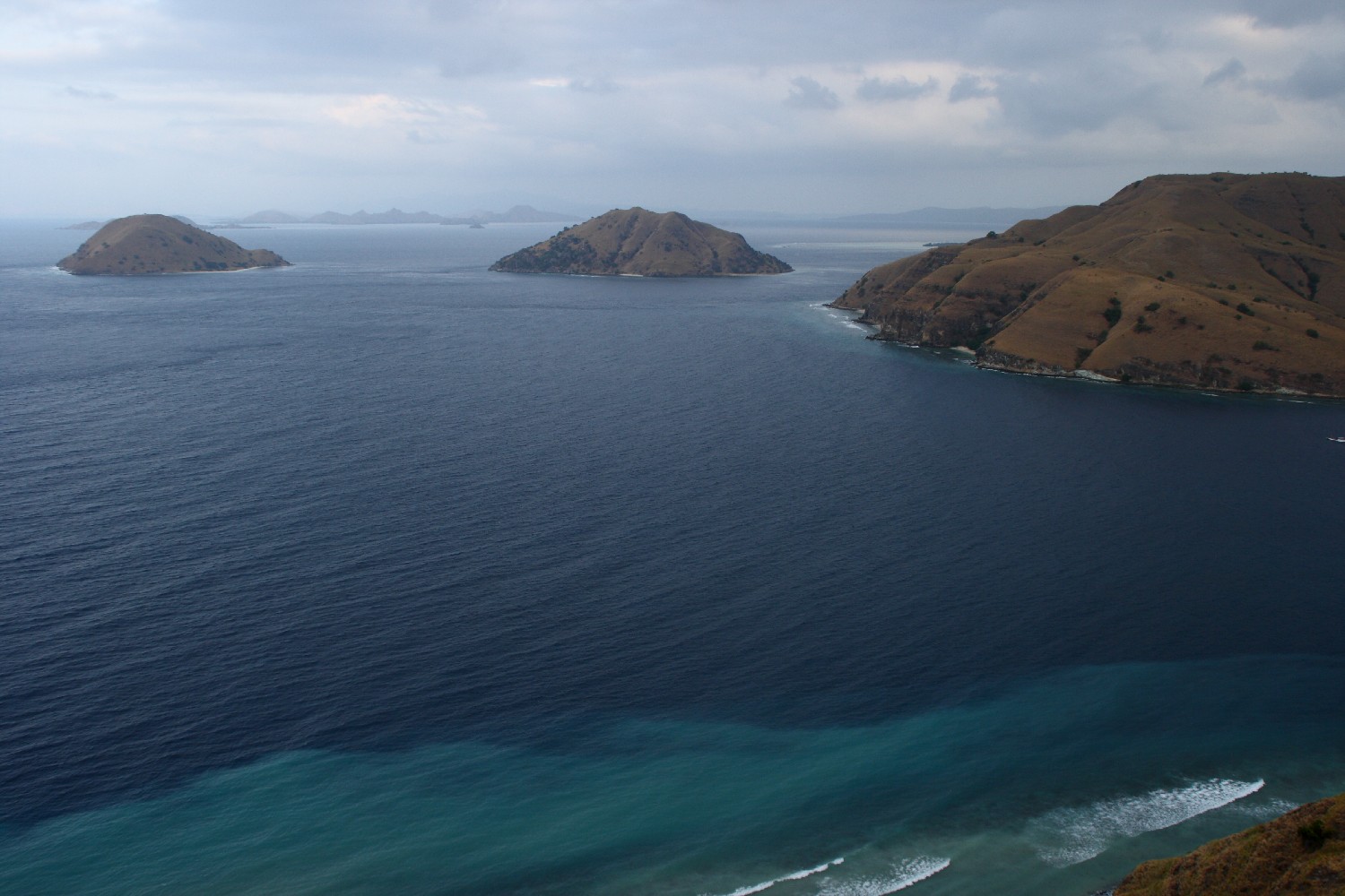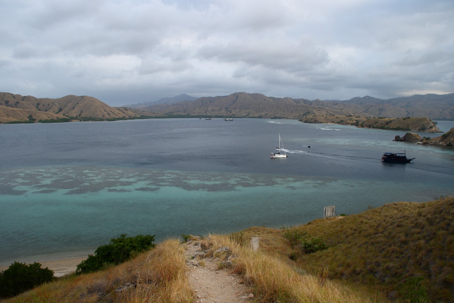 Wir segeln zu einer kleinen Insel des Komodo-Archipels, die auf den Namen Gili Lawa Darat hört, und ankern in einer kleinen Bucht auf deren Südseite, wo wir hoffen, alleine zu sein. Wir hatten diese Bucht mit dem Tauchboot als Treffpunkt ausgemacht. Leider liegen wir auf dem einzig möglichen Ankerplatz zwischen zwei lokalen Touristenbooten, deren Generatoren alles andere als sonore Begleitmusik liefern. Und das die ganze Nacht.  Den Tag verbringen wir mit Schnorcheln und besteigen den Inselhügel, um von dort die Inselwelt zu fotografieren. Leider schieben sich Wolken vor die Abendsonne, ansonsten wären es die perfekten Bilder geworden.