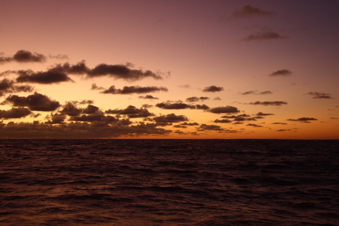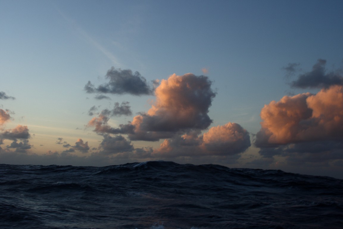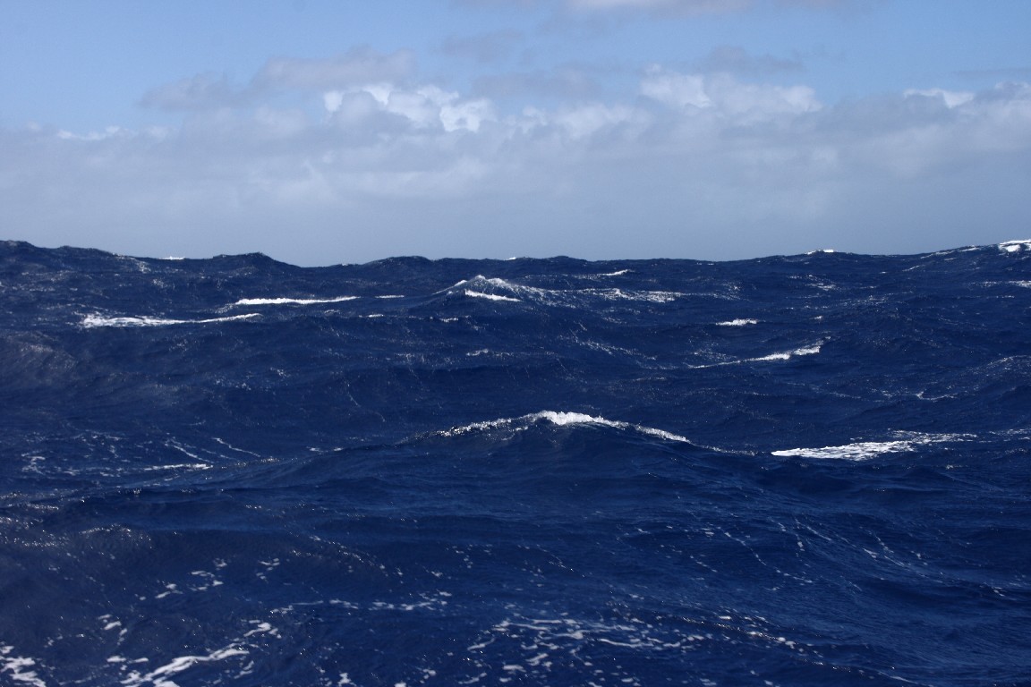 Vorstellen kann es sich nur, wer es erlebt hat. Das Meer ändert fortwährend seine Gestalt. Die Wellen ändern sich, mal ruhig und gleichmäßig, mal ruppig und rau. Wir segeln über eine Unterwasserlandschaft, die wir nicht sehen können. Lediglich die Seekarte gibt einen groben Überblick, wir passieren tiefe Gräben, mit mehr als 7.000 m unter uns, aus denen sich 5.000 m hohe Unterwassergebirge erheben, über die wir auf unserem Kurs hinwegsegeln, ohne sie zu erahnen. Nur die gestörten Wellenbilder geben ein Hinweis auf die Strömungen. Wie formt der Wind das Wellenbild, wie zieht die Gischt ihre Streifen durch die Wellenlandschaft? Wie ändern sich die Farben abhängig von der Tageszeit und den Wolken?