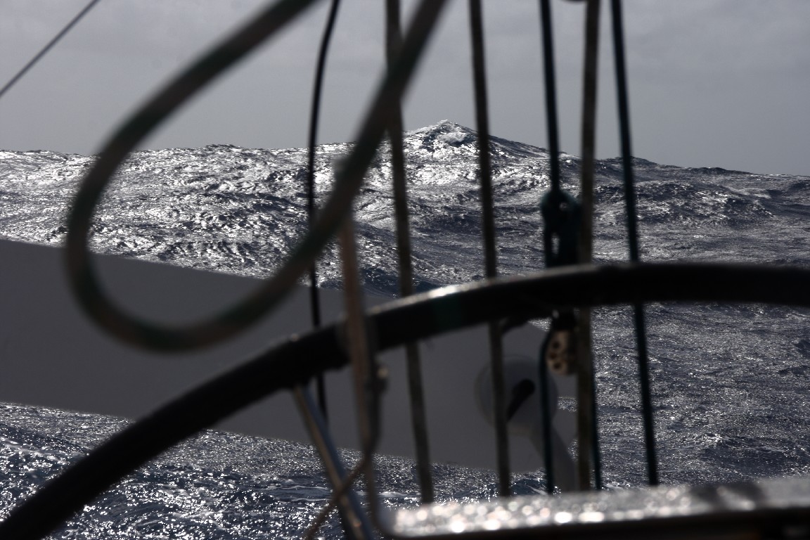 Beim Reffen passiert es dann, natürlich in dunkler Nacht. Das Profilvorstag löst sich aus der Rolle. Ich kann es zum Glück trotz ungeheurer Kräfte und Schlagen bei 30 kn Wind reparieren. Hätten wir nicht die Genua zuvor geborgen, jetzt wäre sie verloren gewesen. Die Wellenbewegungen sind so stark, dass es einen halben Tag später den Herd aus der kardanischen Verankerung hebt. Die Schraube in der Achse ist gebrochen. Wir behelfen uns, indem der Herd mit Seilen fixiert wird, aber ab jetzt wird das Kochen zum Drahtseilakt, denn die Töpfe bleiben in der Welle nicht mehr auf dem Herd und lernen das Fliegen in der Kabine. Auch sie müssen nun beim Kochen mit dem Herd fest verschnürt werden.  Zudem streikt unser Windgenerator, indem er bei Wind über 35 kn die Bremse einwirft. Obwohl wir Wind im Überfluss haben, müssen wir nun mit dem Strom haushalten, denn auch der Himmel ist voller Wolken, heißt die Photovoltaik produziert nur ungenügend Strom.
