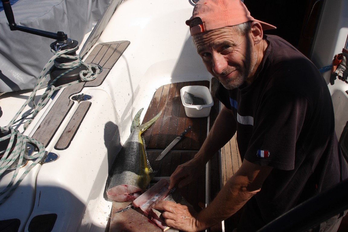 Am letzten Tag der 21-tägigen Überfahrt fangen wir einen Mahi Mahi