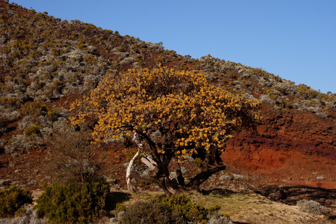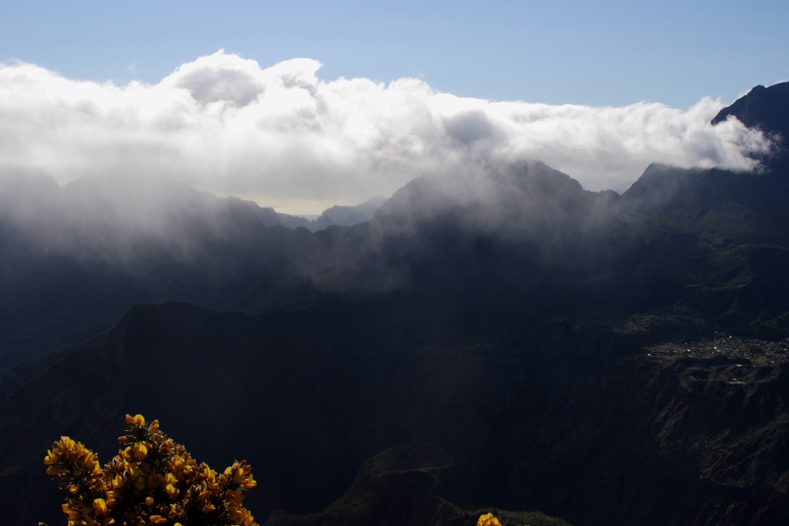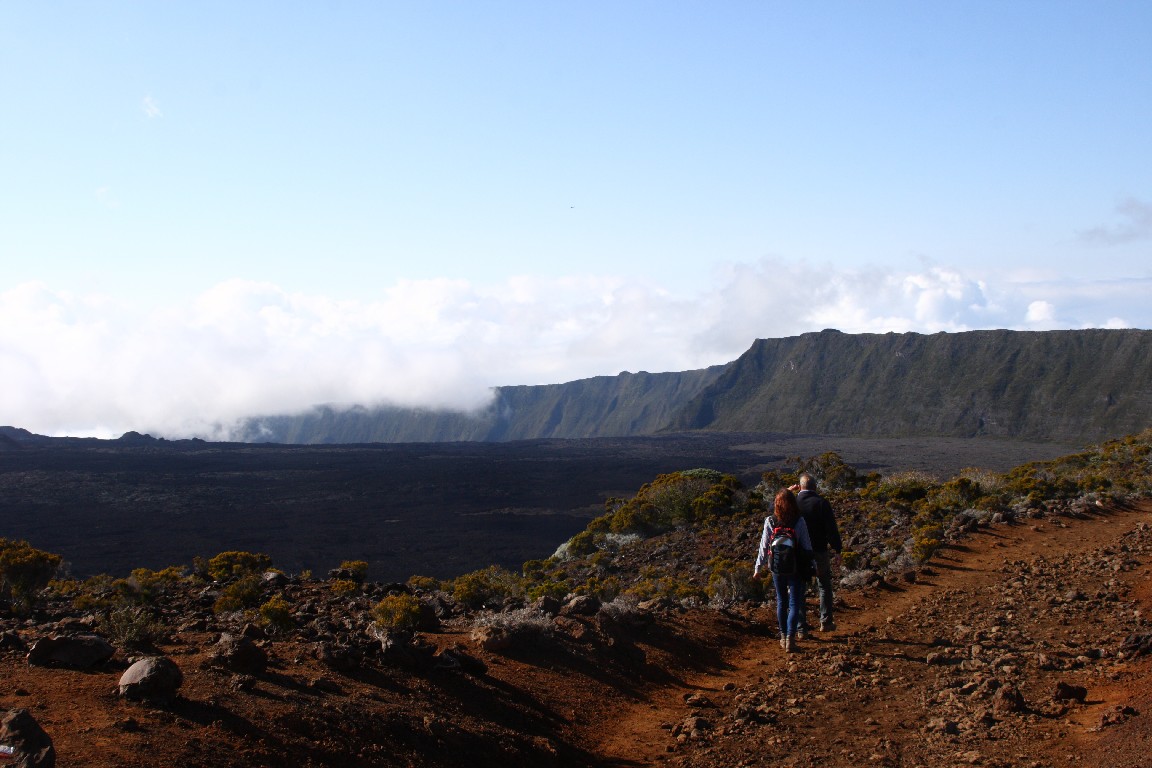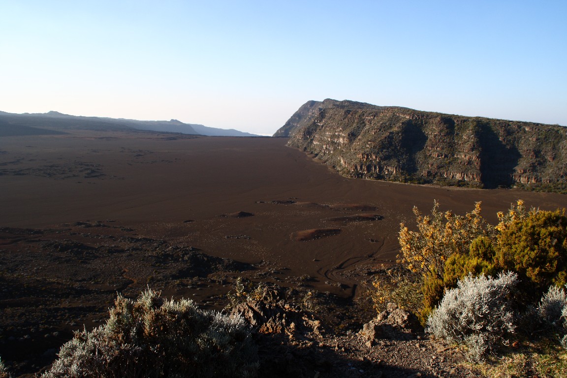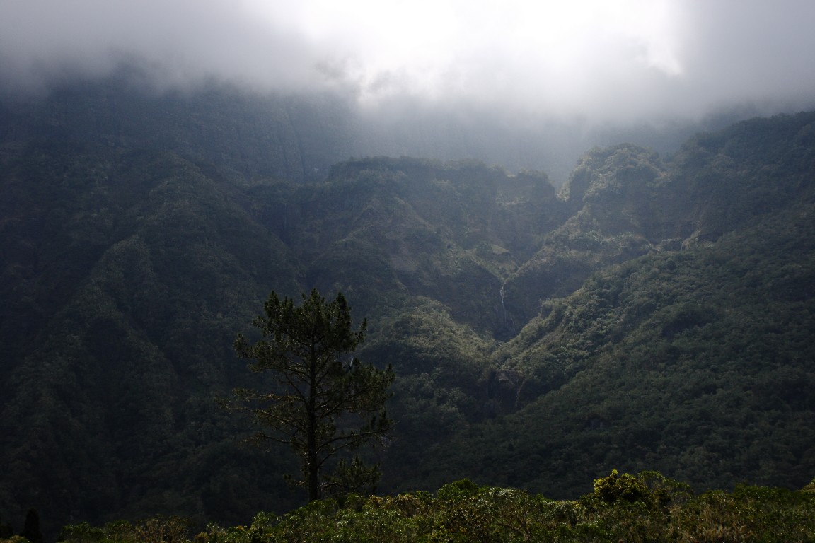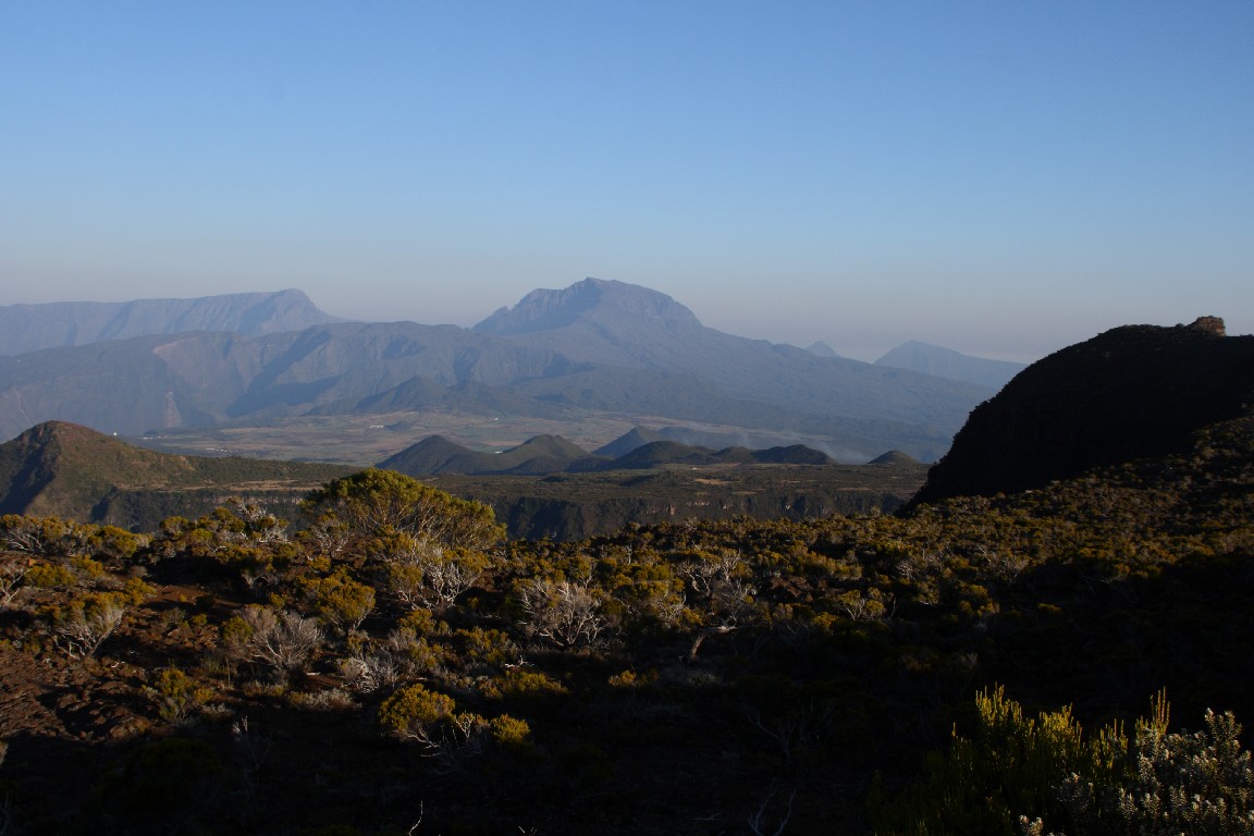 Der erste Ausflug bringt uns in die Berge, die „Cirque de Mafate“ und die „Cirque de Salazie“. Diese Kraterlandschaft ist einmalig und typisch für Réunion. Die Cirques sind entstanden, als der ursprüngliche Vulkankegel kollabierte und bilden mit ihrer außerordentlichen Schönheit das Herz und die Seele der Insel.  Wir fahren mit unserem Mietwagen auf den 2.205 m hohen “ Le Maido“ und wandern den Kraterrand “Le Grand Bord“ entlang in Richtung „Le Grand Bénaire“. Wir freuen uns an der kargen Vulkanlandschaft und an den wechselnden Blicken zum höchsten Gipfel „Piton des Neiges“ mit 3071 m. Im frühen Licht heben sich die wilden Schluchten besonders deutlich von den steilen Kraterwänden ab; eine grün bewachsenen Mondlandschaft.