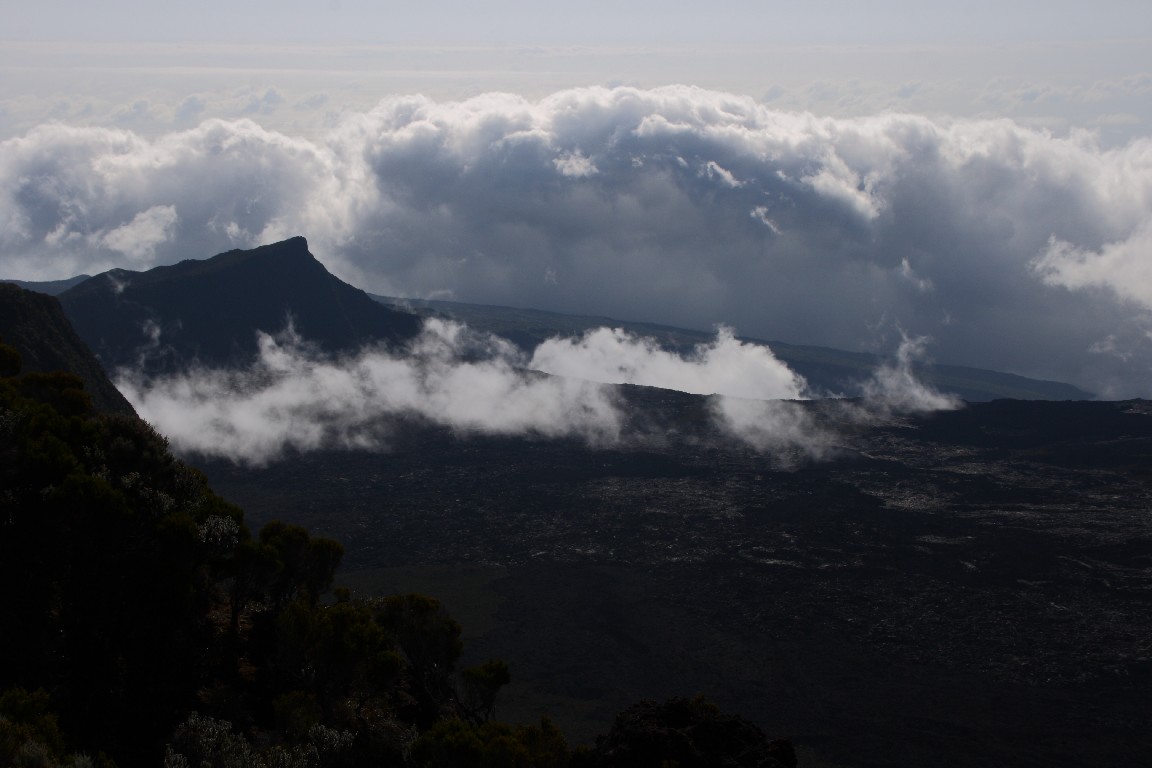 Schon bevor wir Réunion erreichten, hörten wir, dass der „Piton de la Fournaise“ an der Ostküste erneut ausgebrochen ist und wir sehen nun die glühenden Lavaströme in den Nachrichten. Wir wollen den aktiven Vulkan besuchen und fahren mit dem Auto zum „Pas de Bellecombe“ und blicken über den Kraterrand auf die erkalteten Lavaströme und Vulkankegel zurückliegender Ausbrüche. Der aktuelle Ausbruch ist östlich vom Gipfel, sodass wir ihn nicht sehen können. Leider ist der Abstieg vom Kraterrand gesperrt, sodass wir diesem bis zum „Nez Coupé de Ste-Rose“ folgen. Die Vulkanlandschaft ist beeindruckend und das Spiel der heraufziehenden Wolken fantastisch. Anschließend wollen wir die Insel über St. Benoit umrunden, aber die Küstenstraße ist durch den Lavastrom abgesperrt.