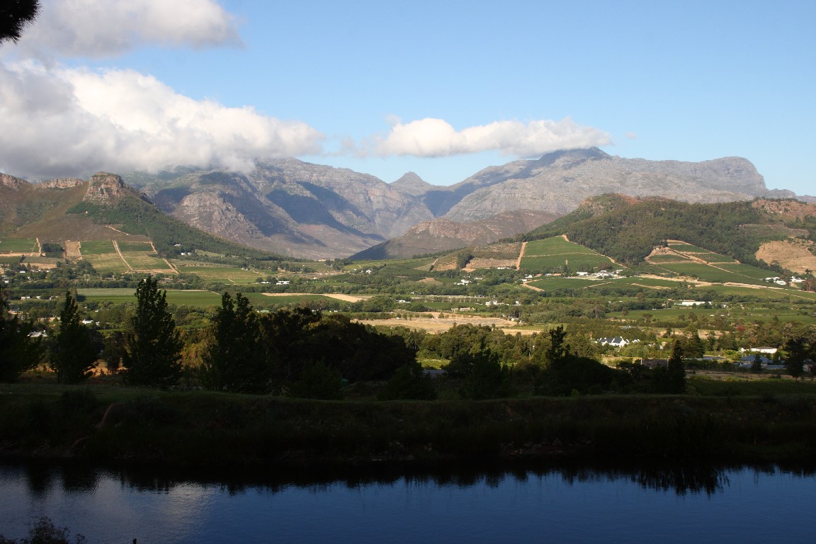 Eine weitere Tour führt uns nach Franschhoek, wo wir in einem Cottage oberhalb der Weinberge mit einem traumhaften Blick auf die Berge wohnen. Natürlich testen wir den lokalen Wein und genießen die südafrikanische Küche. Das sind wieder die angenehmen Puzzlesteine. Spätestens jetzt müssen wir erwähnen, dass aufgrund des schlechten Kurses des südafrikanischen Rands die Preise für uns so günstig sind, dass ein ausgezeichnetes Essen für unter 7,00 € zu bekommen ist und eine gute Flasche Wein kostet ca. 2,50 €.