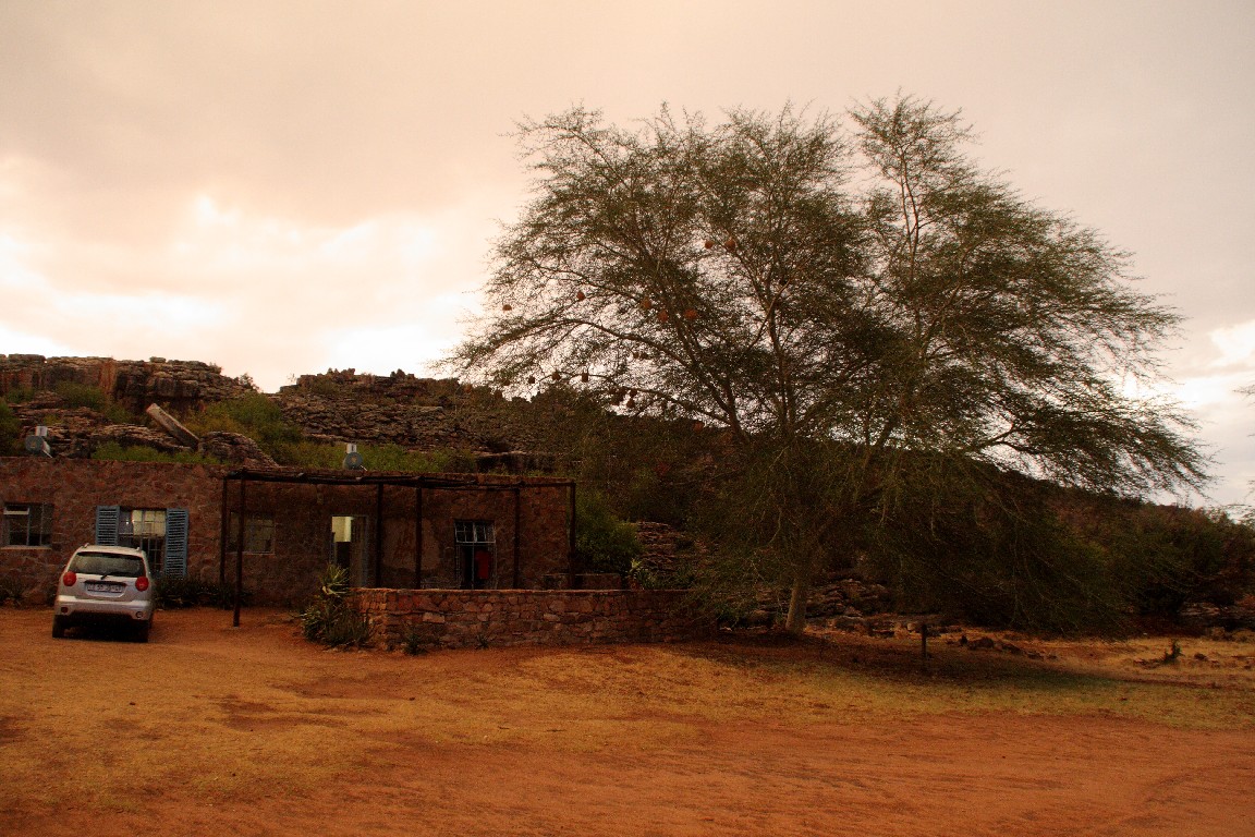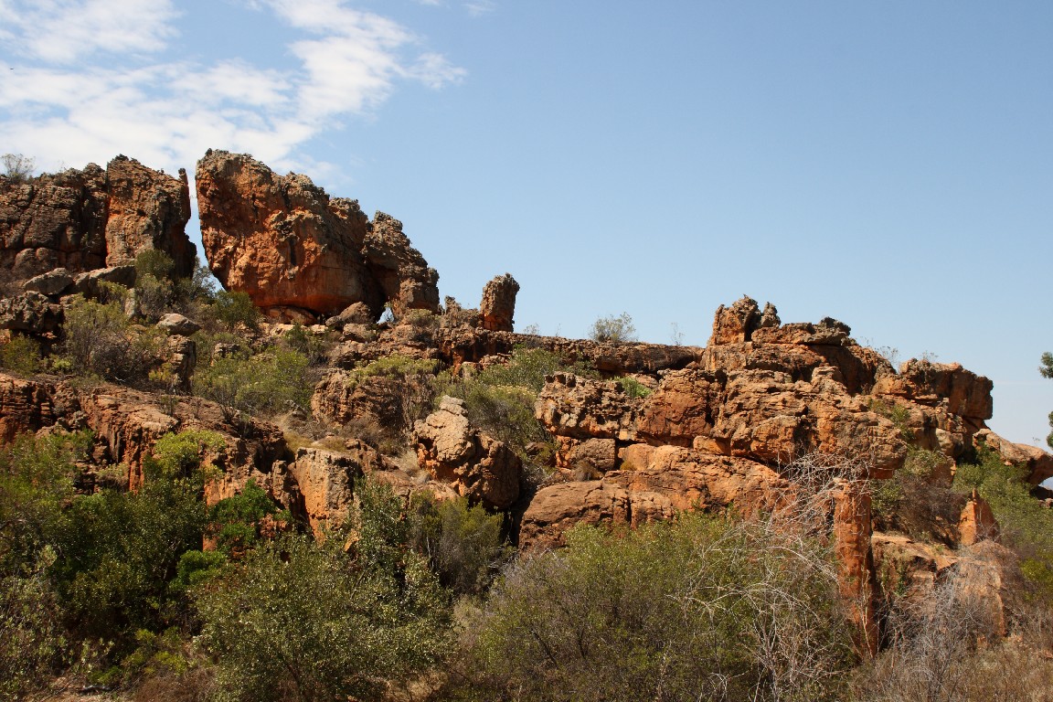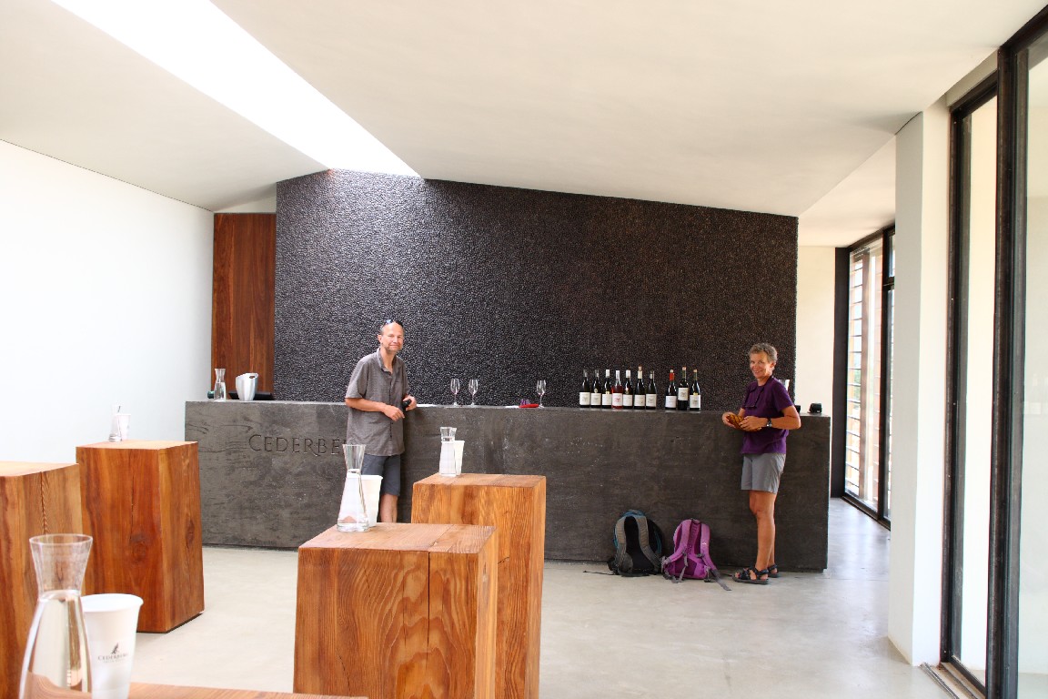 Wir unternehmen eine viertägige Reise zunächst entlang der Westküste, wo wir Langebaan und Paternoster am Cape Columbine besuchen. Am nächsten Tag fahren wir nach Clanwilliam, um von dort aus zwei Tage in „Cederberg Wilderness“, einer weiten wüstenartigen Bergregion zu verbringen. Zunächst geht es über den Sevilla Trail zu neun Felsüberhängen, unter denen wunderbar erhaltene Felszeichnungen der San zu finden sind. Die ehemaligen Bewohner Südafrikas, die Buschmänner, zeichneten und überliefern dadurch Szenen aus ihrem Leben, sehr spannend für uns, diese nun viele hundert Jahre später entlang des Pfades wiederzufinden. Wir sind die einzigen Gäste und haben eine riesige alte einfache Lodge für uns allein, tagsüber glüht die Wüste mit bis zu 40°, nachts kühlt es kaum auf 32° ab, wir sitzen als Selbstversorger lange auf unserer Terrasse unter Akazien, und genießen die von Andreas zubereiteten Spaghetti und den südafrikanischen Wein. Am zweiten Tag fahren wir über 120 km mit unserem Kleinstwagen auf Sand- und Steinpisten durch diese gewaltige Landschaft. Paul, unser Segelnachbar, hatte uns diese Tour empfohlen und wir folgen seinem Rat, viel Wasser mitzunehmen, denn es wird wieder sehr heiß. Wir überqueren den Cederbergpass und machen im Weingut Cederberg in Sanddrif Halt, eine neue Herausforderung, eine Weinprobe bei 40°… Auf dem Rückweg kaufen wir in Wellington einige Kisten von unserem Lieblingswein, den Pinotage von Diemersfontain, als Schiffsproviant für die nächsten Wochen auf See, allerdings trinken wir ja keinen Wein auf den Passagen.