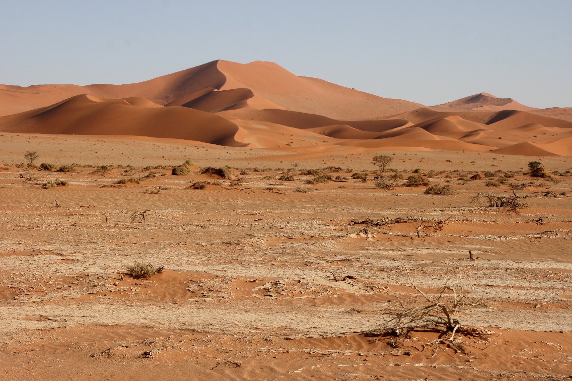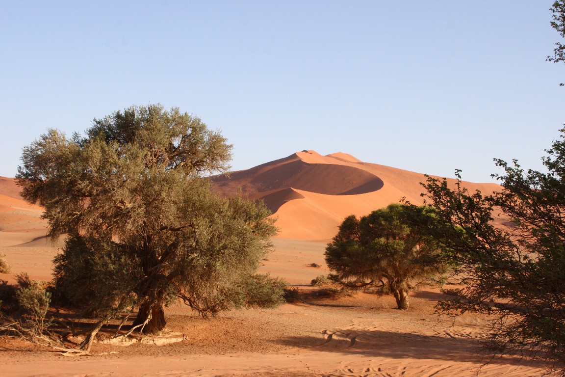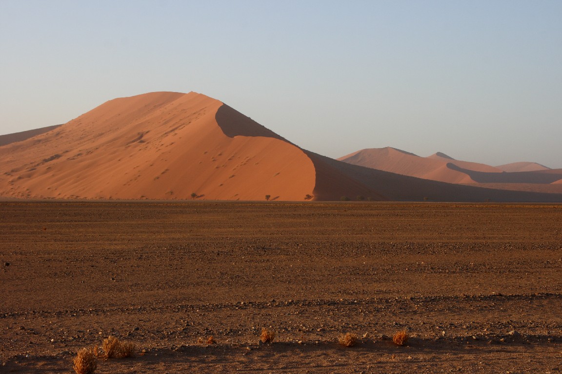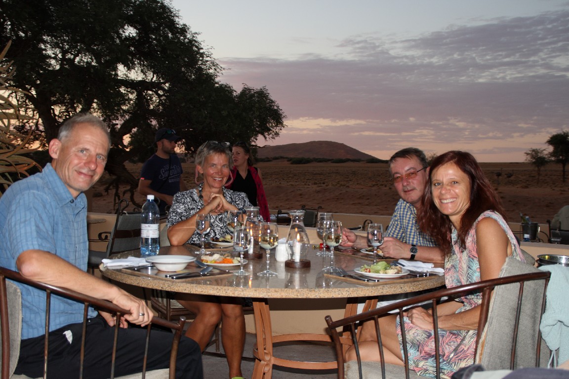 Der nächste Tag bringt uns direkt in die Namib. Wir wollen meinen Geburtstag in der Sossousvlei Lodge feiern. Die Fahrt durch die Wüste ist abwechslungsreich und sehr heiß,  aber wir freuen uns auf eine laue Nacht mit einem tollen Abendessen. Unterschiedliches Wildfleisch wird gegrillt, dazu gibt es eine unglaubliche Vielfalt von Salaten und Gemüse und natürlich guten südafrikanischen Wein. Mitten in der Wüste darf ich meinen Geburtstag in sehr angenehmer Gesellschaft und Umgebung feiern. Wir schlafen in zeltähnlichen Behausungen. Am nächsten Morgen stehen wir kurz nach fünf auf, um im ganz frühen Licht hinaus in die roten Dünen zu fahren. Es ist ein faszinierendes Landschaftserlebnis. Der Weg führt durch ein zunächst weites flaches Tal, in das einzelne Sanddünen ragen. Der Kontrast kommt bei dem frühen Morgenlicht besonders gut zur Geltung. Die aufgehende Sonne taucht die Sanddünen in glühendes Licht. Scharf zeichnen sich die Formen durch Licht und Schatten ab. Die Dünenhänge auf der Luvseite haben einen Winkel von 14° und sind sehr stabil, während die Gleithänge an der Leeseite mit einem Winkel von 33° aus lockerem Sand bestehen. Das Tal verjüngt sich am Ende, wo die Piste aufhört. Es macht uns einen riesigen Spaß, mit dem Geländewagen durch den lockeren Sand zu pflügen, wo jedes normale Auto sofort stecken bleiben würde.