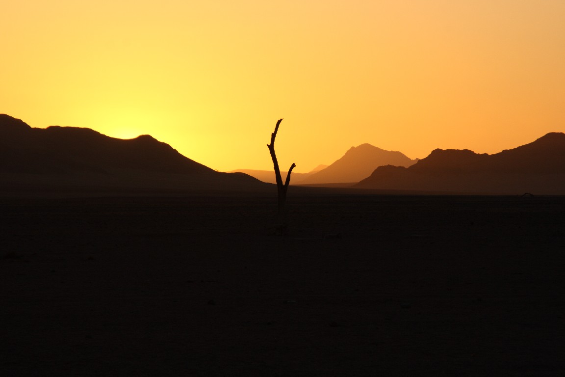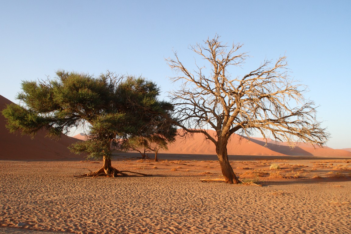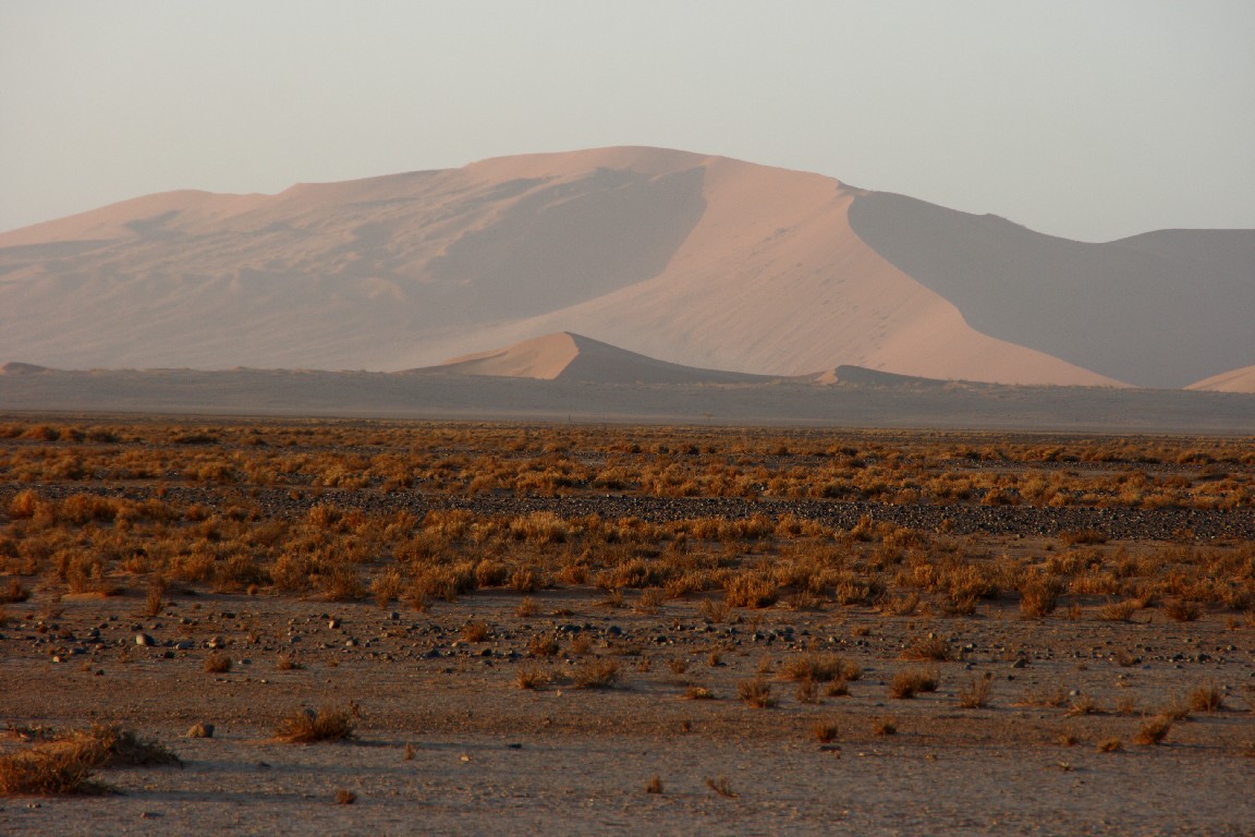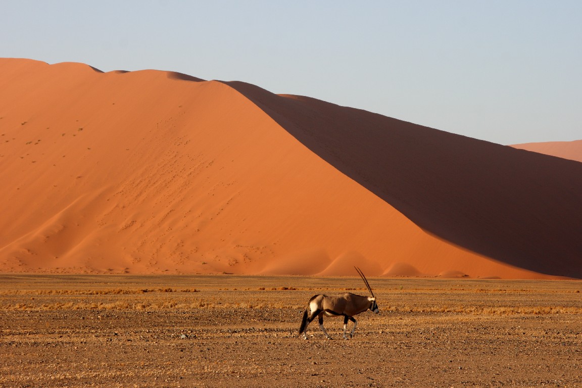 Der nächste Tag bringt uns direkt in die Namib. Wir wollen meinen Geburtstag in der Sossousvlei Lodge feiern. Die Fahrt durch die Wüste ist abwechslungsreich und sehr heiß,  aber wir freuen uns auf eine laue Nacht mit einem tollen Abendessen. Unterschiedliches Wildfleisch wird gegrillt, dazu gibt es eine unglaubliche Vielfalt von Salaten und Gemüse und natürlich guten südafrikanischen Wein. Mitten in der Wüste darf ich meinen Geburtstag in sehr angenehmer Gesellschaft und Umgebung feiern. Wir schlafen in zeltähnlichen Behausungen. Am nächsten Morgen stehen wir kurz nach fünf auf, um im ganz frühen Licht hinaus in die roten Dünen zu fahren. Es ist ein faszinierendes Landschaftserlebnis. Der Weg führt durch ein zunächst weites flaches Tal, in das einzelne Sanddünen ragen. Der Kontrast kommt bei dem frühen Morgenlicht besonders gut zur Geltung. Die aufgehende Sonne taucht die Sanddünen in glühendes Licht. Scharf zeichnen sich die Formen durch Licht und Schatten ab. Die Dünenhänge auf der Luvseite haben einen Winkel von 14° und sind sehr stabil, während die Gleithänge an der Leeseite mit einem Winkel von 33° aus lockerem Sand bestehen. Das Tal verjüngt sich am Ende, wo die Piste aufhört. Es macht uns einen riesigen Spaß, mit dem Geländewagen durch den lockeren Sand zu pflügen, wo jedes normale Auto sofort stecken bleiben würde.