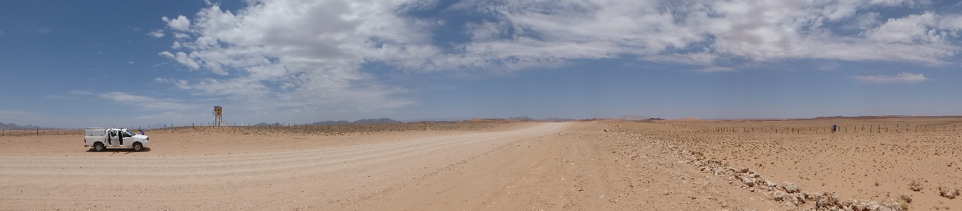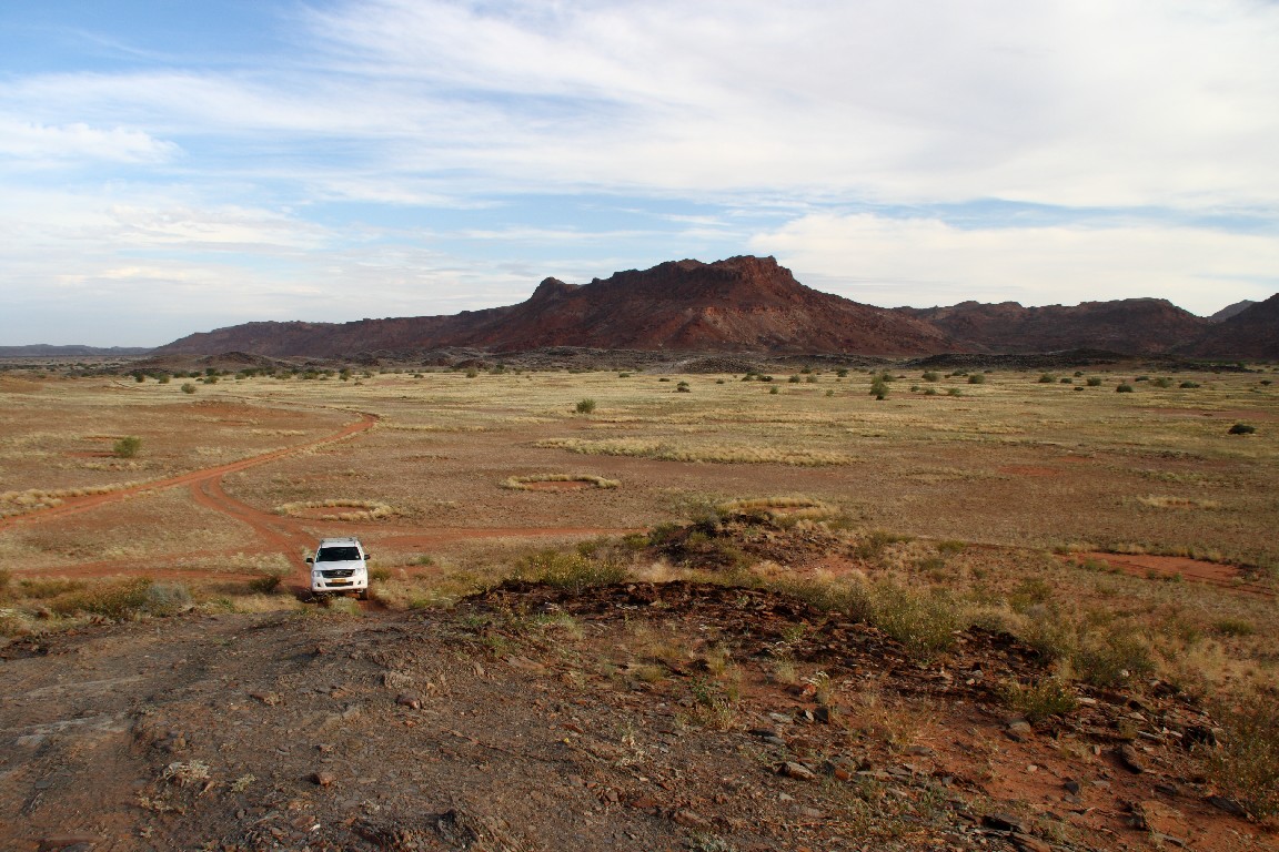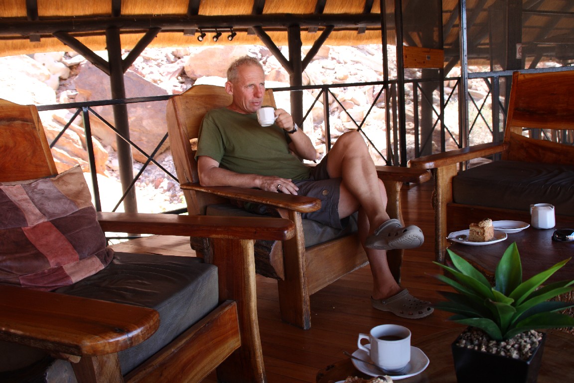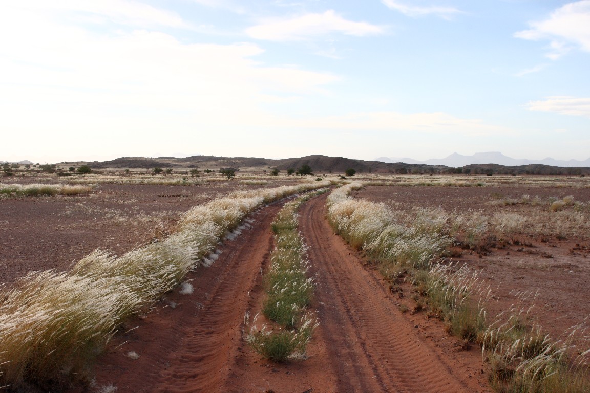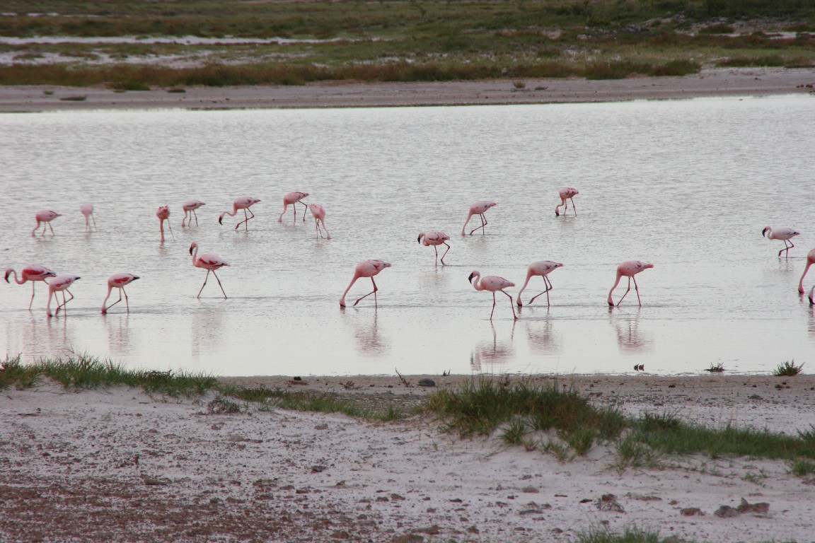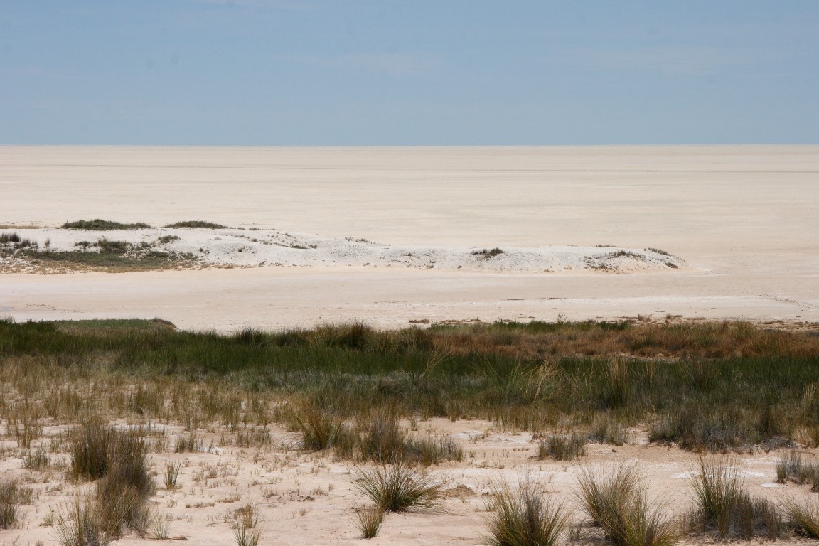 Ein weiterer zehnstündiger Auto-Tag bringt uns entlang des großen Salzsees, dessen Anblick uns lange erhalten bleiben wird. Es ist schon ein ergreifendes Gefühl, am Rande dieses großen Sees zu stehen und das Flimmern auf der weißen Oberfläche zu beobachten. Über den Südausgang des Etosha-Parkes, dem Andersson Tor, fahren wir über scheinbar unendlich lange Schotterpisten durch die Savanne nach Kamanjab, wo wir in einer netten einfachen Lodge wohnen.