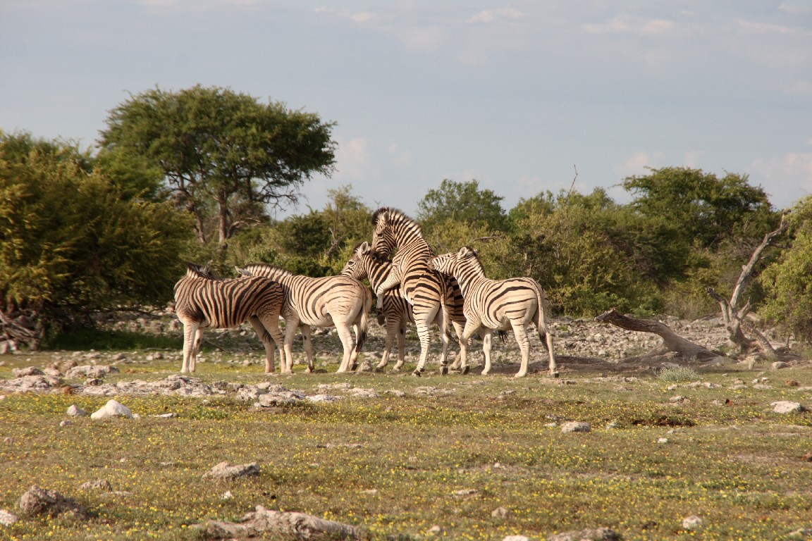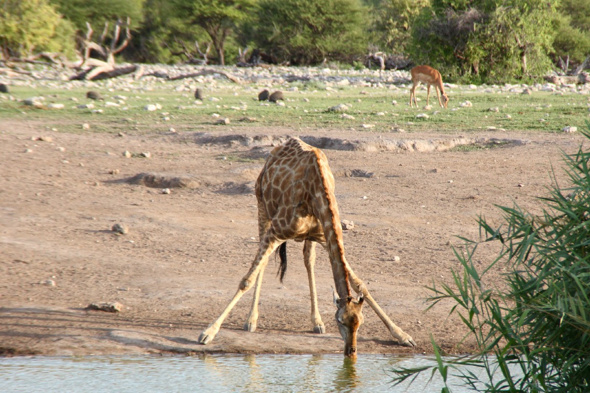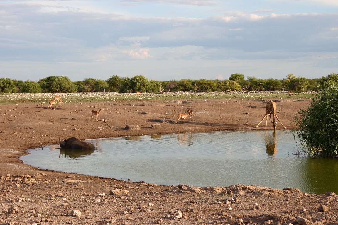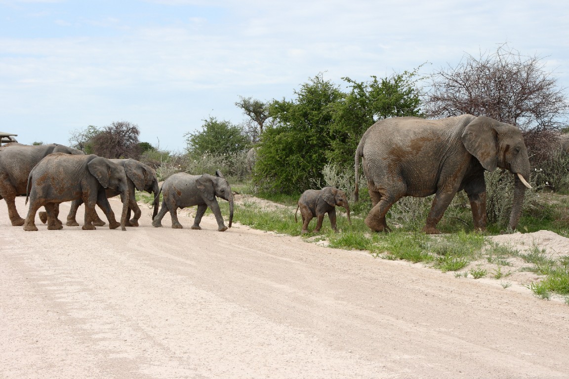 Waterberg empfiehlt sich für einen  Zwischenstopp, um die besonderen Sandsteinformation zu besuchen. Im späten Licht wandern wir entlang des Tafelberges und genießen die Aussicht über die Steppe vom Plateau aus. Von Waterberg führen uns steinige Pisten weiter nach Norden über Grootfontein zum östlichen Eingang in den Etosha-Nationalpark, wo wir zwei Nächte in der Namutoni Lodge verbringen. Gut, mehr Zeit zu haben, denn bisher wechselten die Quartiere jeden Tag. Der erste Tag enttäuscht uns,  denn nur wenige Tiere lassen sich sehen, obwohl unser Wecker kurz nach fünf klingelt. Die Stimmung steigt, als wir gegen Abend erneut aufbrechen und bei gutem Abendlicht in Ruhe sehr viel Wild beobachten können. Der nächste Tag führt uns entlang der Etosha-Pfanne nach Westen. Die Landschaft wird sehr karg und leider zeigen sich wieder kaum Tiere. Es ist Regenzeit, die falsche Jahreszeit für Tierbeobachtung. Auch wenn es gerade nicht regnet,  so aber in den Tagen zuvor recht viel. Es muss in der Trockenzeit außergewöhnlich sein, die Vielzahl an Tieren zu beobachten, die dann notgedrungen zu den wenigen Wasserlöchern kommen. Man fährt dann mit dem Auto zu den Wasserlöchern und braucht nur zu warten, die Tiere kommen zu einem. In der Regenzeit aber verteilt sich das Wild im riesigen Park und wir müssen viel fahren, um einen kleinen Teil davon zu Gesicht zu bekommen, leider keine Löwen oder Leoparden, aber umso mehr Springböcke, Kudus, Giraffen, Zebras und Elefanten.