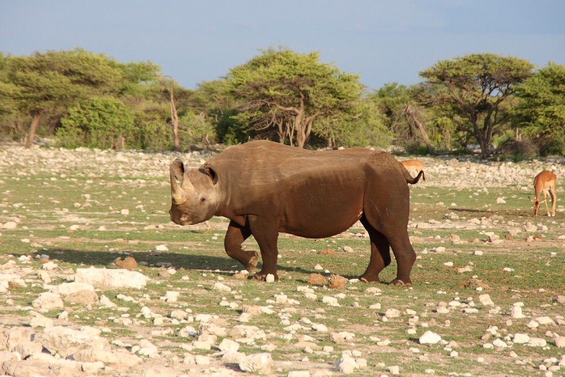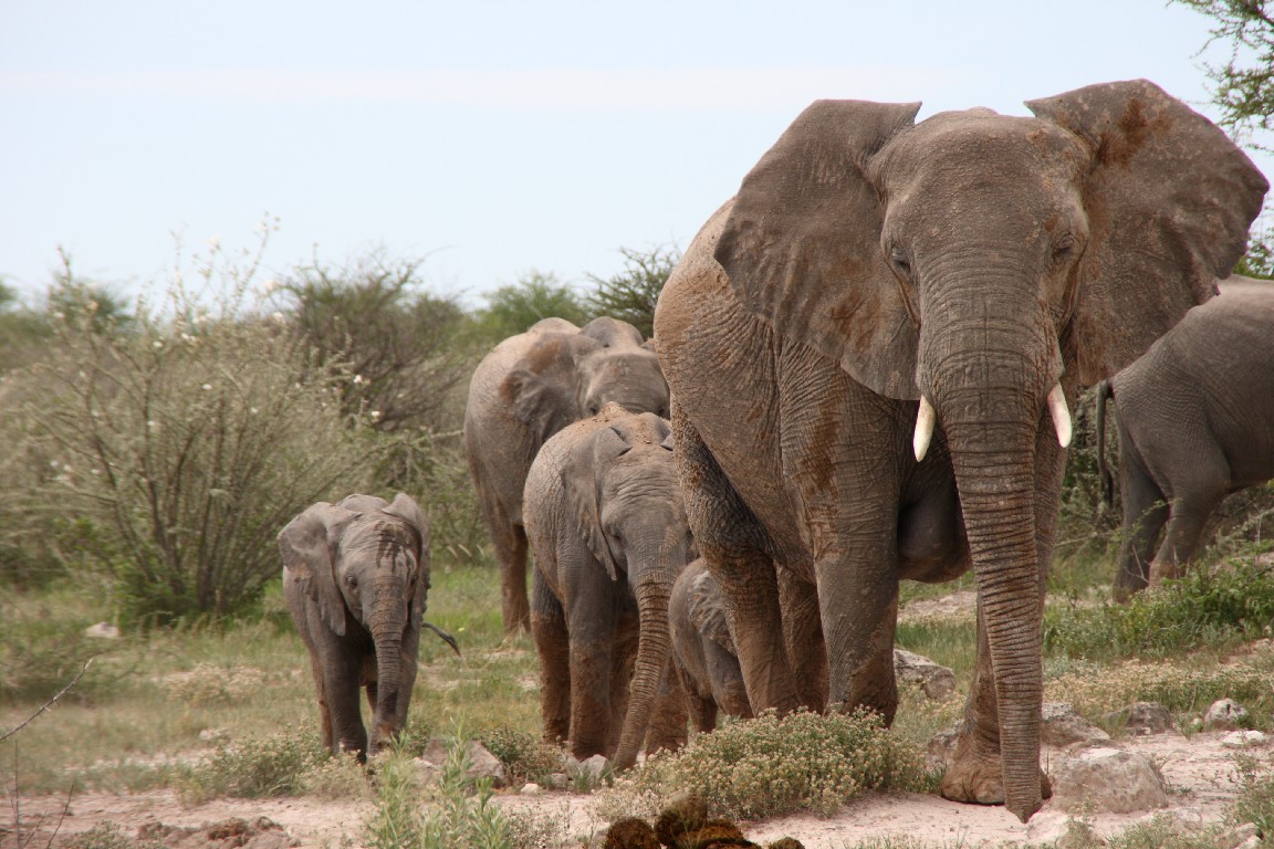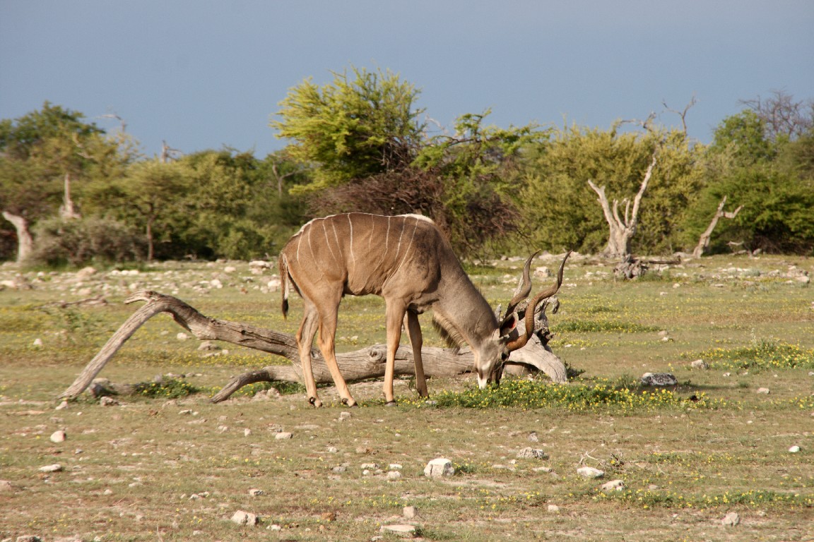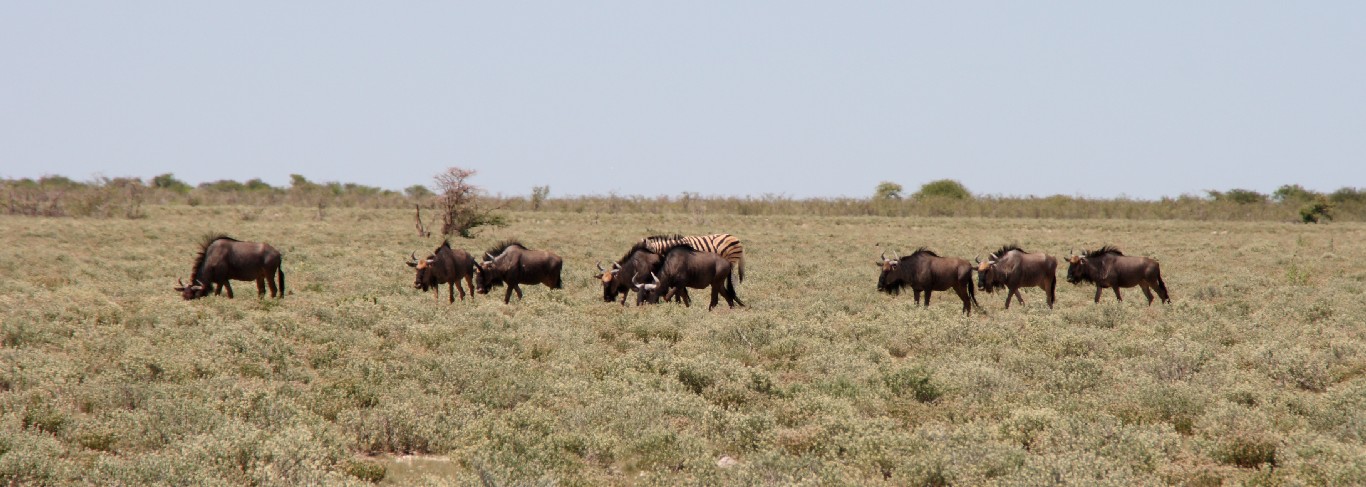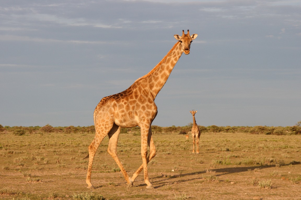 Waterberg empfiehlt sich für einen  Zwischenstopp, um die besonderen Sandsteinformation zu besuchen. Im späten Licht wandern wir entlang des Tafelberges und genießen die Aussicht über die Steppe vom Plateau aus. Von Waterberg führen uns steinige Pisten weiter nach Norden über Grootfontein zum östlichen Eingang in den Etosha-Nationalpark, wo wir zwei Nächte in der Namutoni Lodge verbringen. Gut, mehr Zeit zu haben, denn bisher wechselten die Quartiere jeden Tag. Der erste Tag enttäuscht uns,  denn nur wenige Tiere lassen sich sehen, obwohl unser Wecker kurz nach fünf klingelt. Die Stimmung steigt, als wir gegen Abend erneut aufbrechen und bei gutem Abendlicht in Ruhe sehr viel Wild beobachten können. Der nächste Tag führt uns entlang der Etosha-Pfanne nach Westen. Die Landschaft wird sehr karg und leider zeigen sich wieder kaum Tiere. Es ist Regenzeit, die falsche Jahreszeit für Tierbeobachtung. Auch wenn es gerade nicht regnet,  so aber in den Tagen zuvor recht viel. Es muss in der Trockenzeit außergewöhnlich sein, die Vielzahl an Tieren zu beobachten, die dann notgedrungen zu den wenigen Wasserlöchern kommen. Man fährt dann mit dem Auto zu den Wasserlöchern und braucht nur zu warten, die Tiere kommen zu einem. In der Regenzeit aber verteilt sich das Wild im riesigen Park und wir müssen viel fahren, um einen kleinen Teil davon zu Gesicht zu bekommen, leider keine Löwen oder Leoparden, aber umso mehr Springböcke, Kudus, Giraffen, Zebras und Elefanten.