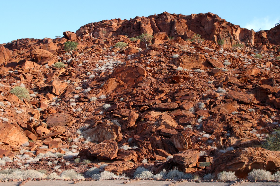 Wir sind am nächsten Tag sehr froh, in der Twyfelfontein Country Lodge für zwei Nächte bleiben zu können; dieses Felsmassiv bildet einen weiteren Höhepunkt unserer Reise. Der Weg dorthin führt uns vorbei an riesigen versteinerten Baumstämmen, die während einer lang zurückliegenden Eiszeit vor ca. 250 Mio. Jahren durch Gletscherströme aus dem Kongo hierher transportiert worden sind. Hier, wir sind zurück in der Namib, sehen wir unsere erste Welwitschie. Die Welwitschia mirabilis ist eine endemische Pflanze, die nur in der Namib vorkommt. Sie ist eine ganz besondere Pflanze, wenn auch keine Schönheit. Sie hat nur ein einziges Blattpaar, das aber so ausfranst, dass man mehrere Blätter zu sehen scheint, die bis zu sechs Meter lang werden können. Die Welwitschie ist getrenntgeschlechtig, es gibt also männliche und weibliche Pflanzen. Die männliche trägt sechs Staubblätter mit je drei Pollensäcken, während die weibliche Pflanze Blüten mit zapfenförmigen Samenanlagen trägt. Es gibt viele Theorien, wie die Welwitschie ihr Wasser in der extrem trockenen Namib sammelt, wahrscheinlich über die tiefe Pfahlwurzel und weniger über die Blätter, wo man vermutete, dass sie den Nebel einfängt. Auch scheint sie einen besonderen Stoffwechsel zu haben, der ihr es ermöglicht, das nötige Kohlendioxid nachts aufzunehmen und für den Tag zu speichern, was ihr hilft, die Verdunstung zu reduzieren. Sie ist eine Überlebenskünstlerin in der Wüste, die bis zu 1.500 Jahre alt werden kann.