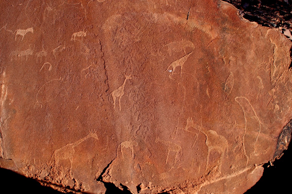 Wieder im sehr frühen Licht sind die Petroglyphen unser Ziel. Die Buschmänner (San) haben die Gravuren vor ca. 5.000 Jahren in den Fels geritzt. Wir sind sehr früh und genießen das Weltkulturerbe ganz für uns allein. Der markierte Wanderweg führt uns zwischen den Felsen hindurch und wir finden einige der 2.500 gut erhaltenen rituellen Felsgravuren wie „Tanzender Kudu“, „Löwenmann“ und viele andere mehr, die uns an die Felsgemälde in Südafrika erinnern. Uns beeindruckt die Vielfalt, Schönheit und Ausdruckskraft der Wilddarstellungen.