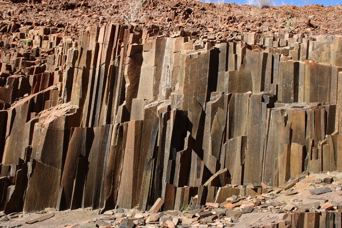 Wir fahren weiter durch die Wüste, um die 120 Mio. Jahre alten Basaltsäulen „Orgelpfeifen“ und den „Verbrannten Berg“ zu sehen. Die über 1000 Grad heiße Magma hat das Schiefergestein verbrannt, ein wunderbares Farbspiel aus schwarzen, violetten und roten Gesteinsformationen.