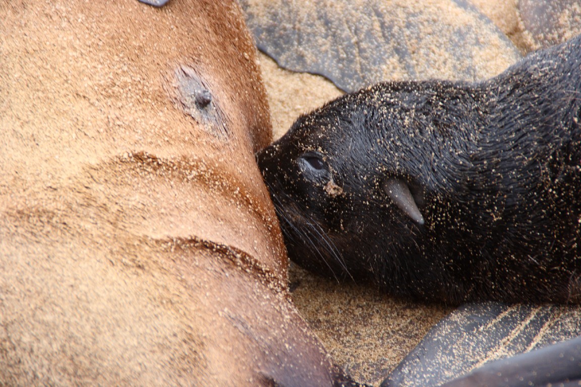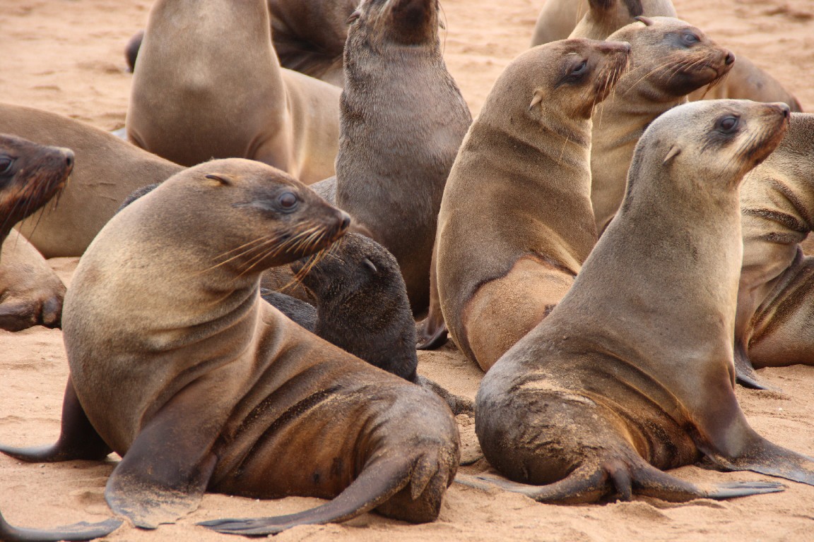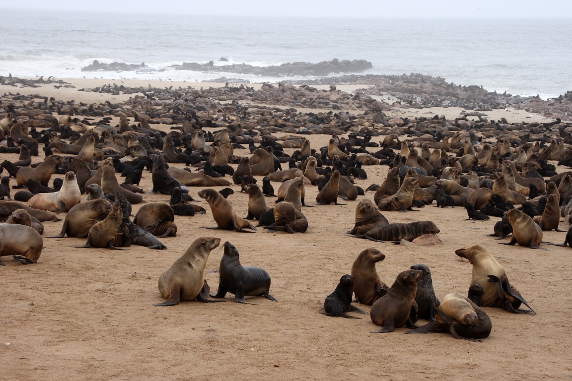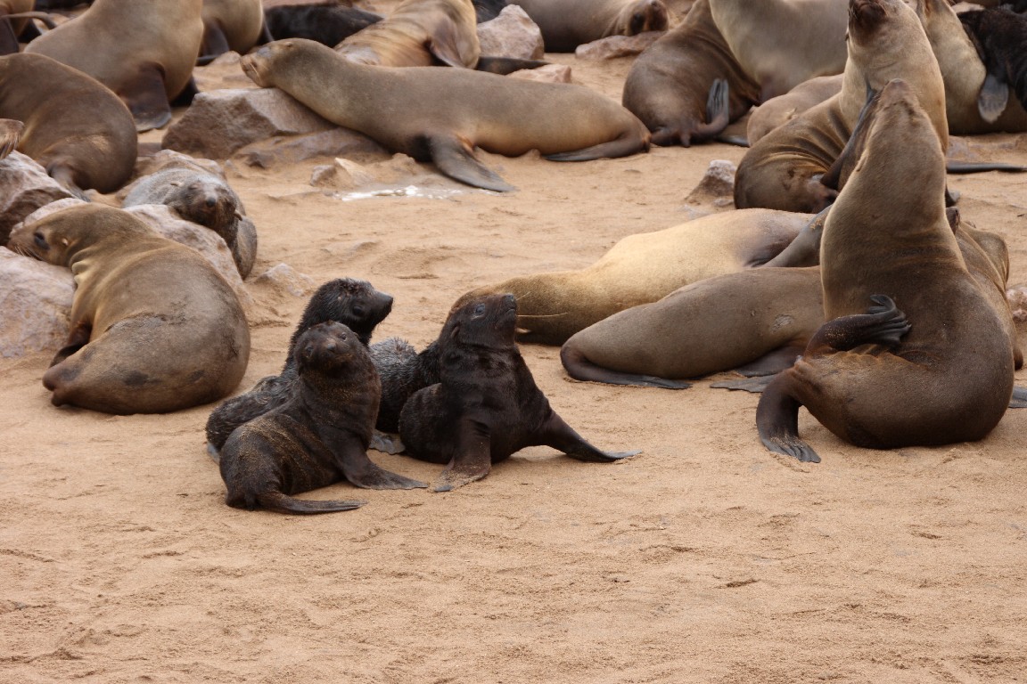 Auf dem Rückweg nach Walvis Bay zieht uns die Pelzrobbenkolonie bei Cape Cross an. Hier leben 250.000 Robben, auch Ohrenrobben oder Seelöwen genannt. Die Bullen kommen nur kurz zur Paarungszeit im Oktober an Land, um ihr Revier zu verteidigen. Die Jungtiere kommen ein Jahr später zur Welt. Mitte Februar bevölkern hauptsächlich die Robbenkühe mit ihren Jungen die Klippen, ein unglaubliches Gewimmel und Geschrei. Wir können nicht verstehen, wie die Mütter ihre Jungen allein an der Stimme erkennen können, wenn sie vom Fischfang zurückkommen. Jede Mutter pflegt nur ein einziges und nur ihr eigenes Junges. So sterben etwas ein Drittel der Kleinen an der fehlenden Mutter oder weil sie bei der Enge von Erwachsenen erdrückt werden oder sie ertrinken bei den ersten Schwimmversuchen.
