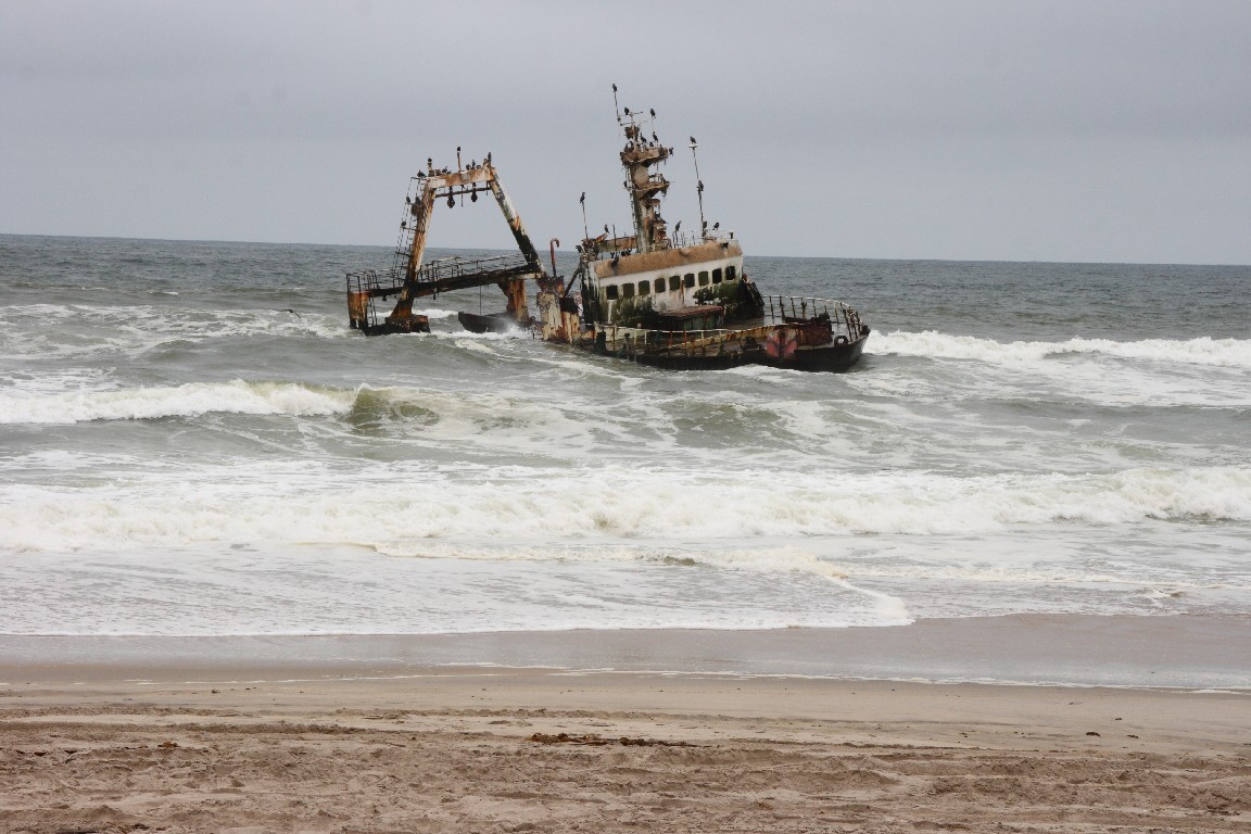 Die Namib-Wüste begleitet uns weiter auf dem Weg zur Skelettküste, die ihren Namen wegen der dort vor allem in früheren Zeiten gestrandeten Schiffe trägt. Durch Nebel und Untiefen war die Navigation erschwert und den Besatzungen, die sich nach einer Strandung an Land retteten, drohte oft der sichere Tod, denn es gibt kaum einen einsameren und trockneren Landstrich in der kaum besiedelten Namib. Es fällt so gut wie kein Regen und dementsprechend ist die Wüste hier extrem trocken, es fallen durchschnittlich nur 20 mm im Jahr. Während die Küste früher gespickt war von Schiffswracks, findet man heute nur noch wenige, da die meisten vom Sand verweht sind. Wir fahren auf Sand- und Salzpisten nach Süden und campen in unserem Geländewagen am Strand im 108-Mile-Camp, einer trostlosen kleinen Anlage am Meer, wo wir die einzigen Gäste sind.