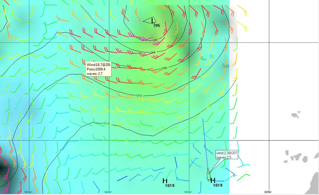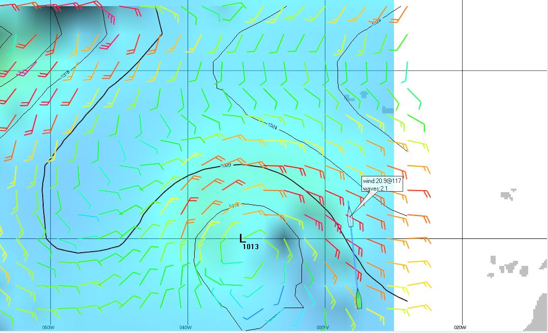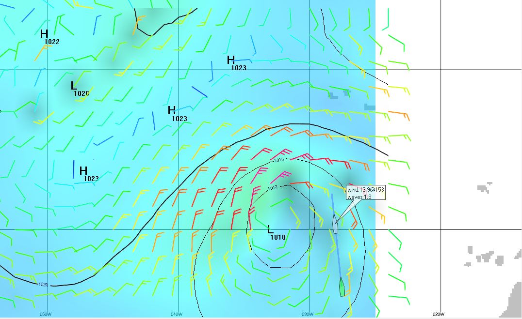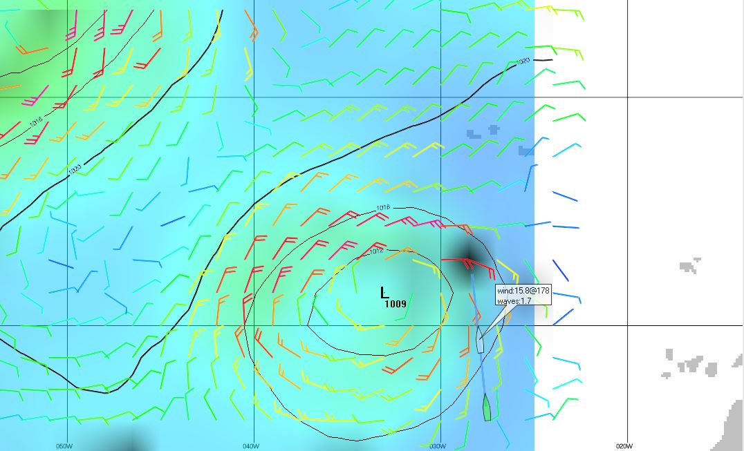 Das Leben wäre wunderbar, wenn uns nicht ein Tiefdruckgebiet Sorgen bereiten würde, das unseren Weg zu kreuzen scheint. Die Prognosen sagen voraus, dass wir es in ca. drei Tagen passieren, wenn wir Glück haben auf seiner Ostseite, wo die Windgeschwindigkeiten sich in Grenzen unter 25 Knoten bewegen sollten; wir werden das beobachten und stehen mit Jeff, einem Amateurfunker vom „Portuguese Maritime Ham Net“, in Verbindung und erhalten von ihm Wetterinformationen.  Er warnt uns vor 45 Knoten, allerdings auf seiner westlichen Seite.