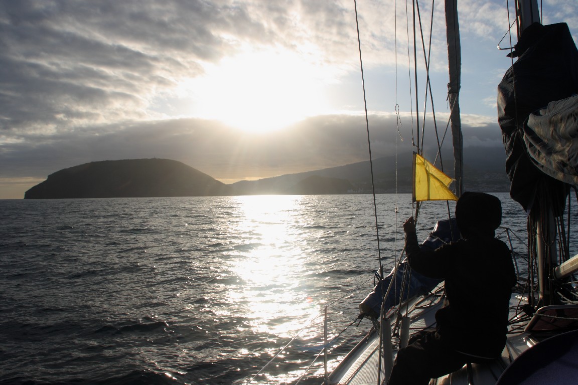 Die ersten drei Tage kommt der Wind aus der richtigen Richtung (Nordost), so dass wir unseren Kurs 350° gut halten können. Er ist zunächst mit 20 Knoten stärker, als er sein müsste, sodass wir Lage schieben. Jedes Mal, wenn das Schiff sich auf die Seite legt, beiße ich die Zähne zusammen. Nein nicht wirklich, denn wir reffen früh, um die Kräfte im Rigg im Rahmen zu halten (das haben wir auch während der gesamten Reise so gemacht, denn zu viel Lage segeln ist Unsinn).  Aber trotzdem bleibt ein mulmiges Gefühl wegen des erlittenen Schrecks. Dann nimmt der Wind ab und wir haben herrlichste Bedingungen und kommen gut voran. Allerdings erreichen wir am fünften Tag ein riesiges Schwachwindgebiet, in dem die Grib-Files nur ca. 5 Knoten Wind vorhersagen. Da müssen wir leider durch. Wir nutzen die Segel, so lange es geht und überbrücken die Flauten mit der Maschine. Ursprünglich wählten wir Flores als unseren Zielhafen, aber wir entscheiden uns um und steuern nun Horta auf Faial an, da der Hafen dort geschützter ist und da wir uns inzwischen über die Azoren informiert haben und wir an Faial Gefallen gefunden haben . Dann setzt sich doch ein angenehmer Wind mit 3 Bft aus Westen durch und wir segeln unter Groß und Spi, bis er nach NW dreht. Zu früh gefreut, denn vom vierten bis zum siebten Tag der Passage müssen wir immer wieder die Maschine zu Hilfe nehmen, insgesamt 50 Stunden. Zum Vergleich: Wir brauchten den Motor nur 22 Stunden, um die Doldrums nördlich des Äquators zu durchqueren.
