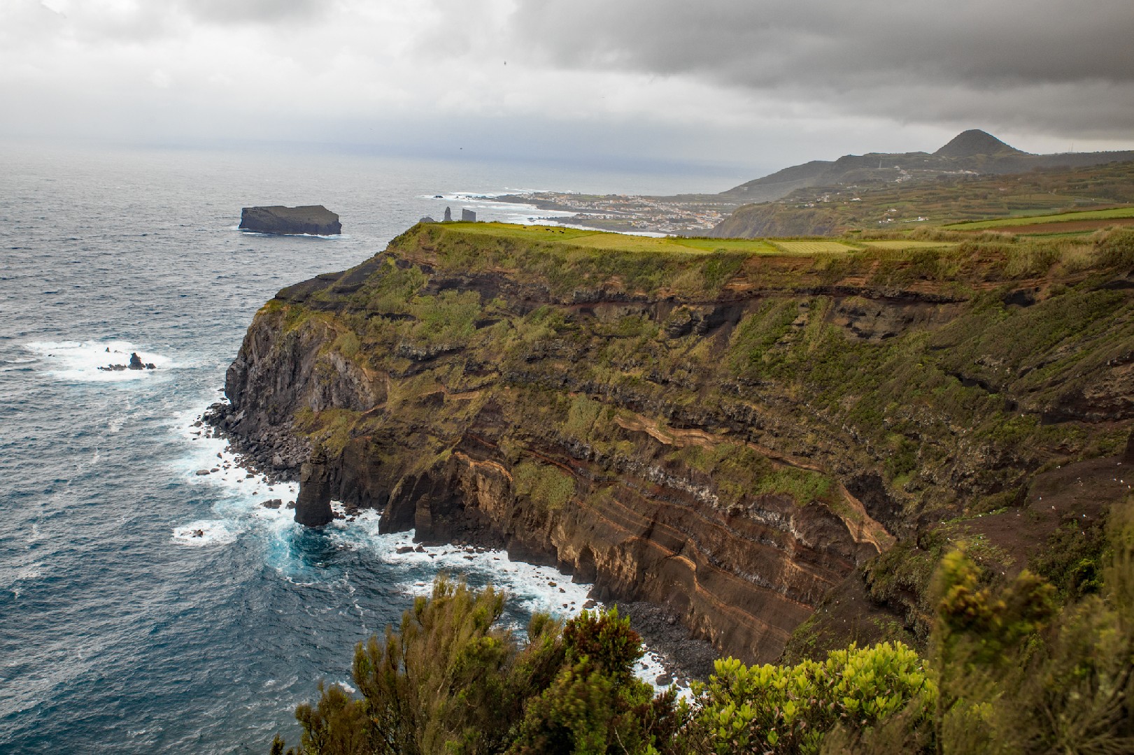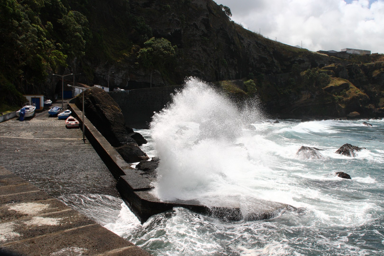 Wir kommen am 24. Mai mit Sascha in Ponta Delgada nach unserer schnellen und bewegten Überfahrt an. Sao Miguel ist die größte, bevölkerungsreichste und bedeutendste der neun azoreanischen Inseln, 65 km lang und bis zu 15 km breit mit einer Küstenlänge von 155 km und knapp 150.000 Einwohnern. Mehrere Kraterseen und wilde Bergrücken laden zu schönen Wanderungen mit spektakulären Aussichten ein. Das Wetter ist wie bisher sehr wechselhaft. Wir mieten uns ein Auto, um die Insel zu erkunden, aber wir sind oft in den Wolken und das Fotografieren bringt keine rechte Freude. Wir umrunden das Westkap der Insel mit tollen Blicken auf die Küste und die vom Starkwind aufgewühlte See.