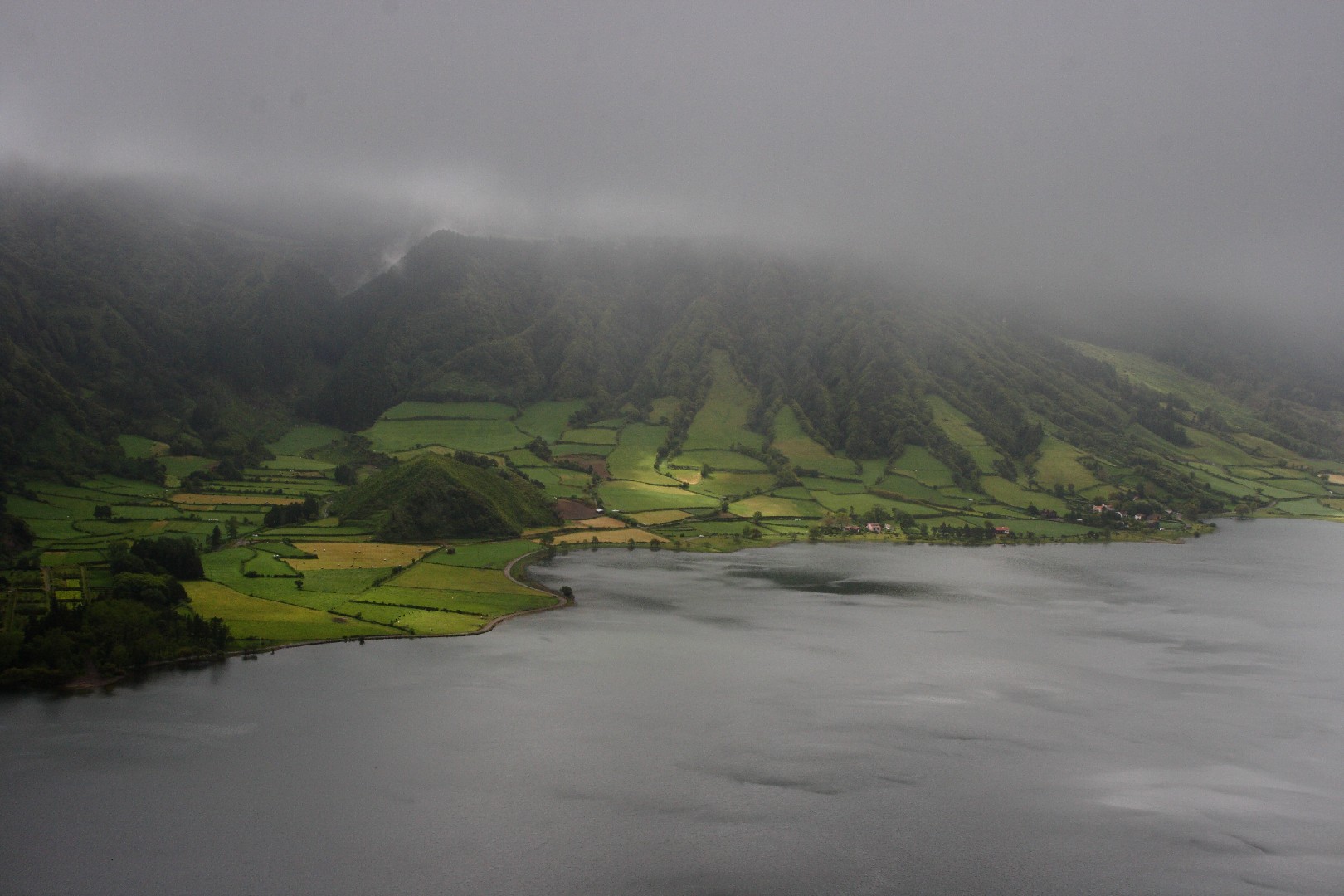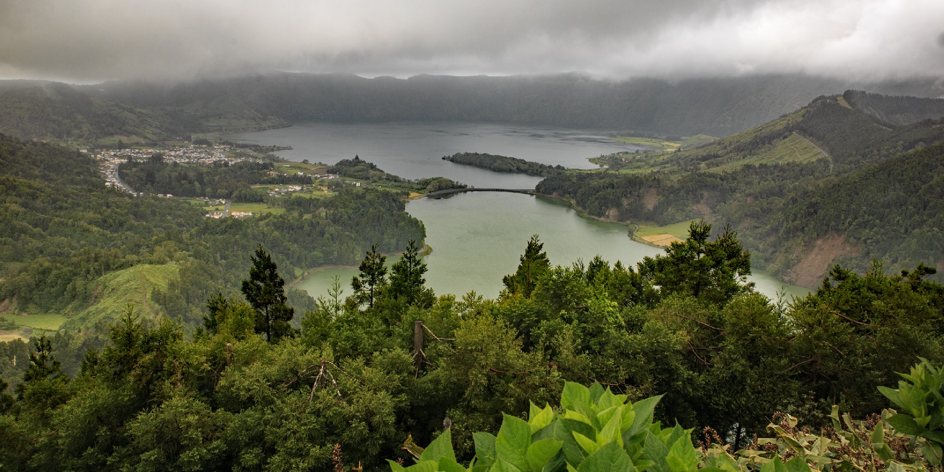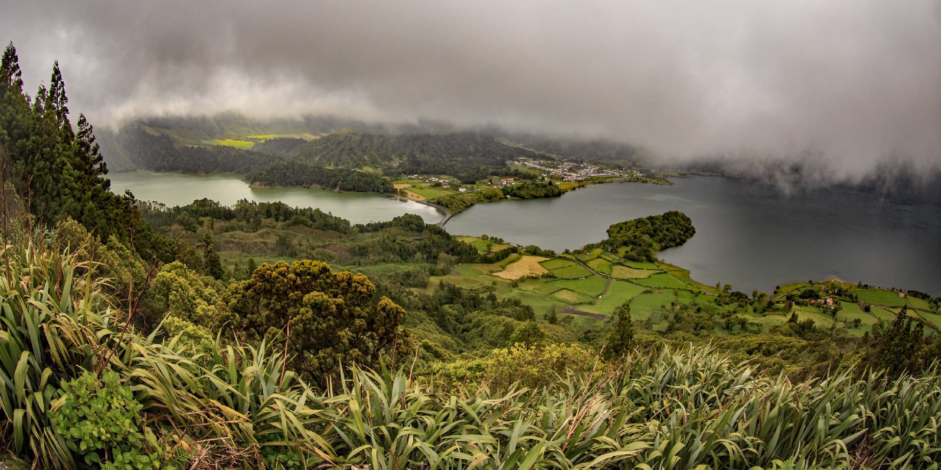 Wir nähern uns dem ersten Höhepunkt, Sete Cidades, das am Rand der zwei Vulkanseen Lagoa Azul und Lagoa Verde liegt. Die riesige Caldeira mit einem Umfang von 12 km ist die größte der Azoren. Wir bewundern die königliche Aussicht von Vista do Rei nicht nur dieses Mal, sondern werden diesen Punkt immer wieder während unseres dreiwöchigen Inselaufenthalts ansteuern. Die Wolken verleihen der Kraterlandschaft und den am Grund liegenden Seen etwas Mystisches. Gespenstisch mutet auch die gewaltige Fehlinvestition des hier oben in der Bergwelt 1984 von den Franzosen errichteten 5*-Hotels mit 170 Zimmern an, das nach einem Jahr aufgegeben wurde und nun seit 30 Jahren als Ruine ein unrühmliches Ende und für uns gruselige Ein- und Ausblicke zeigt.