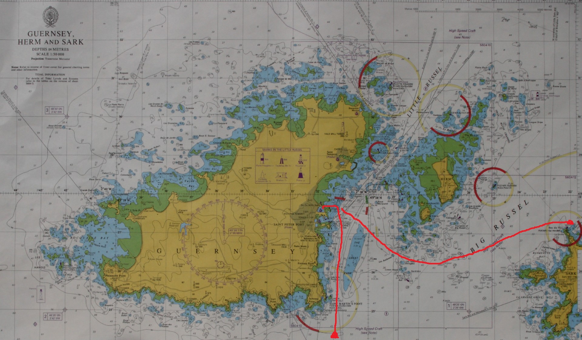 Wir legen in Camaret-sur-Mer so ab, dass wir im Chenal du Four zwischen Ouessant und Festland die Strömung mit uns haben sowie die ersten Stunden entlang der Nordküste der Bretagne. Zunächst haben wir abflauende Winde, dann aber frischt der Westwind auf und wir sehen Guernsey früh morgens vor uns. Das Timing ist perfekt, denn über Funk erfahren wir, dass wir kurz vor Hochwasser direkt in die Marina „Queen Elisabeth II“ von St. Peter Port einlaufen können; die „Victoria Marina“ ist leider zu flach für uns. Wir hatten zwei Tiden mit uns und eine gegen uns, sodass wir die 132 Seemeilen in 22 Stunden, also trotz wechselhaftem Wind durchschnittlich mit 6 Knoten über Nacht, gesegelt sind. Der Tidenhub ist beachtlich. In St. Peter liegt er bei 7 Meter während Springzeit und 5 Meter bei Nippzeit. Wir sind froh, dass wir in den Gewässern um die Kanalinseln während Nippzeit unterwegs sind, denn dann fallen die Strömungen etwas geringer aus. Wir staunen über die Höhenunterschiede der Tide. Mal ist das Hafenbecken voll und wir schwimmen oben, dann sinkt der Wasserspiegel wieder bis zur Schwelle in der Einfahrt, die bei halbem Tidenhub auf 4,50 m liegt. Außerhalb weicht das Meer weiter zurück und die Felsen vor der Hafeneinfahrt fallen trocken. Bei Ebbe könnten wir trockenen Fußes vor der Hafeneinfahrt spazieren gehen. Über das Wetter schreiben wir lieber nicht, denn es hat über Nacht lange genieselt, was bei der Kälte besonders unangenehm wirkt, oft haben wir Nebel, eben Kanalinselwetter.